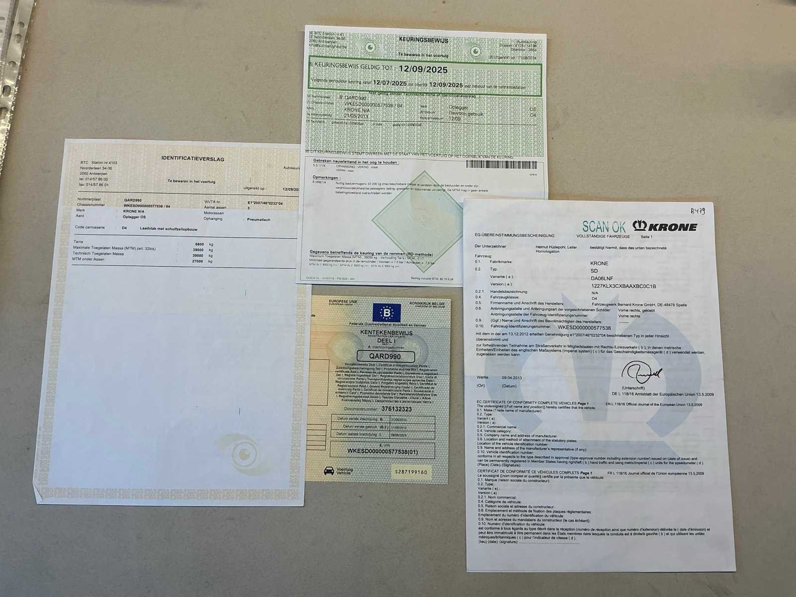 Documenten: Inschrijvsbewijs deel 1+2, gelijkvormigheidsattest, ID verslag, keuringsbewijs 12/09/2025, TUV document Nee Merk: Krone Type: SD Bouwjaar: 2013 Chassisnummer: WKESD000000577538 Aantal assen: 3 Laadbak afmeting l: 1386cm Laadbak afmeting b: 255cm Zeiltrailer: true Datum eerste toelating: 21/05/2013 Kentekenpapieren compleet?: true Nationaliteit documenten: België