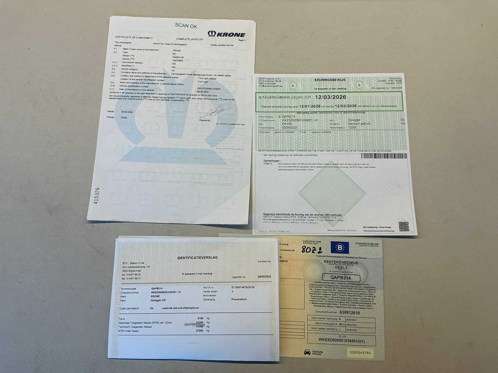Documenten: Inschrijvsbewijs deel 1+2, gelijkvormigheidsattest, ID verslag, keuringsbewijs 12/03/2026 Nee Merk: Krone Type: SD Bouwjaar: 2022 Chassisnummer: WKESD000001039301 Aantal assen: 3 Laadbak afmeting l: 1386cm Laadbak afmeting b: 255cm Zeiltrailer: true Datum eerste toelating: 05/05/2022 Kentekenpapieren compleet?: true Nationaliteit documenten: België