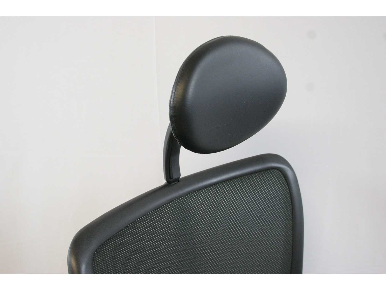 Stervoet in aluminium kleur Zwart voorzien van standaard zwenkwielen, rugleuning bekleed met netweave kleur Zwart, zitting in leder kleur Zwart, in hoogte verstelbaar, verstelbare hoofdsteun, synchrone mechanisme met gewichtsinstelling, instelbare zitdiepte, 4 D armleuningen met zachte opdek bekleed met leder, in hoogte verstelbare rugleuning, verstelbare lendesteun, in goede staat, technisch nazicht en onderhoud gehad, gereinigd No Merk: König & Neurath Kleur: Zwart Gewicht: 40kg Breedte: 80cm Hoogte: 120cm Diepte: 80cm Materiaal: Metaal, aluminium, kunststof, stof, leder