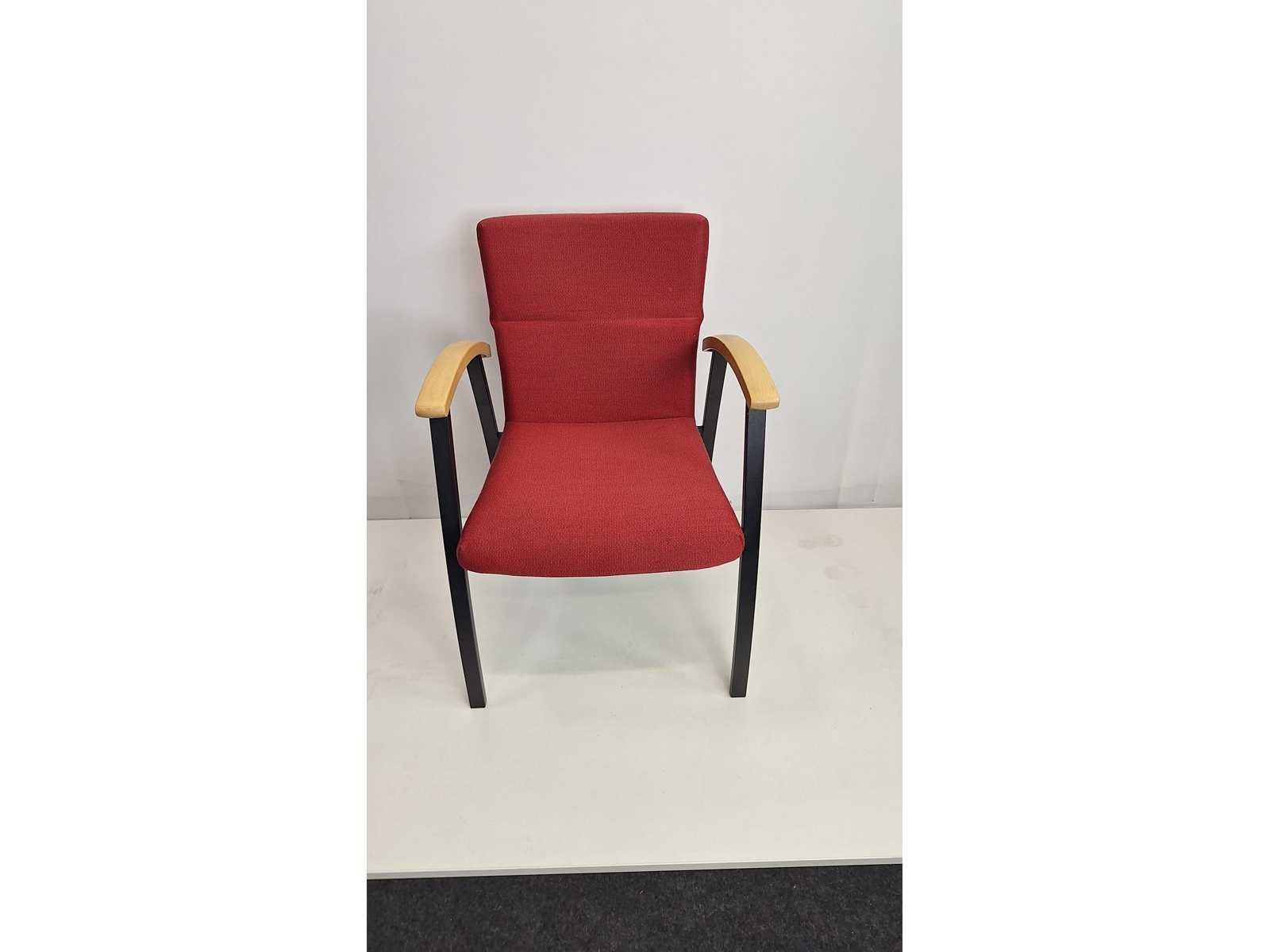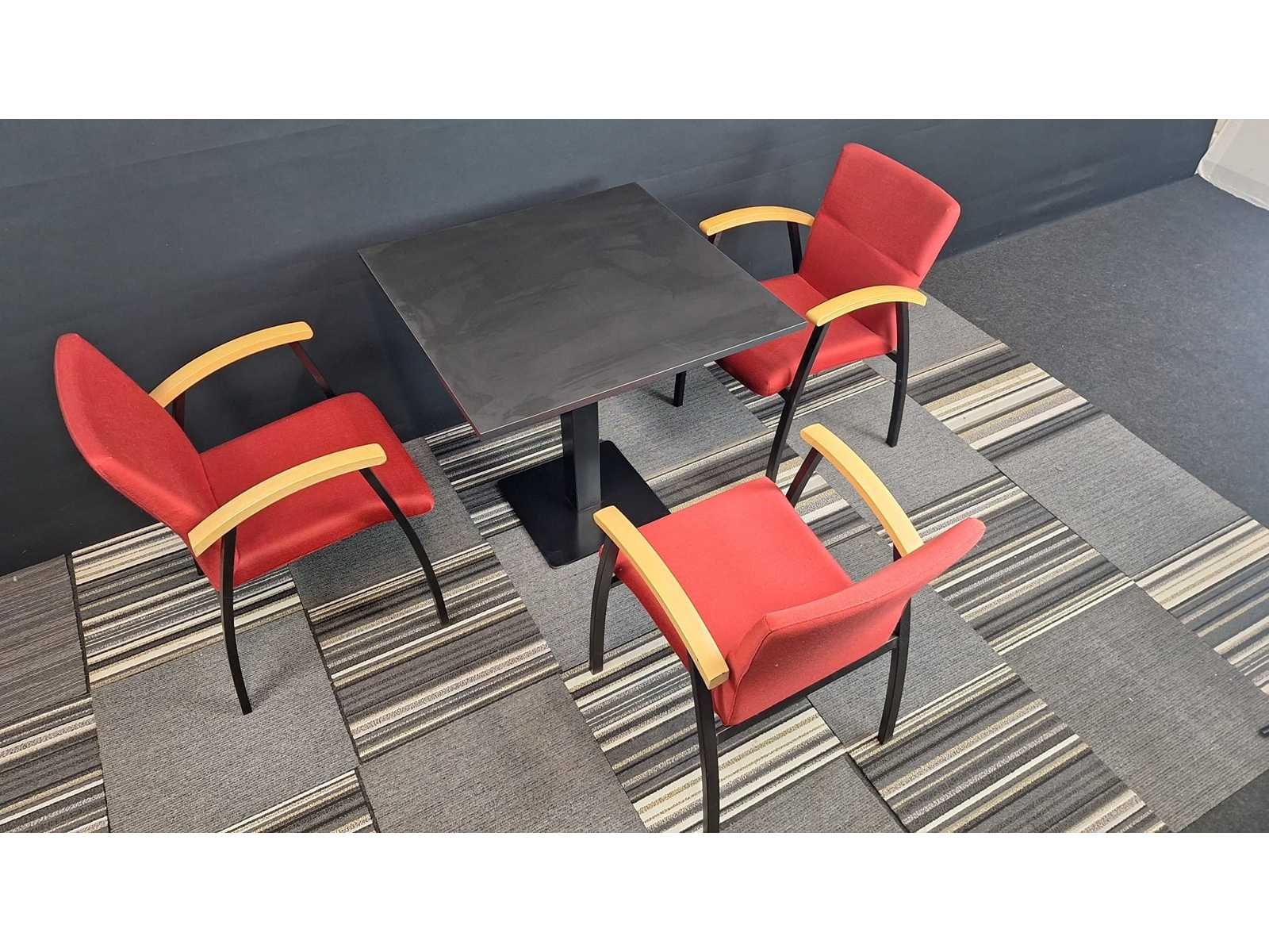Vergadertafel BENE 800 x 800 x 780 mm, centrale voet in metaal kleur Zwart, blad in melamine kleur Zwart + 3 stuks bezoekersstoelen Kinnarps vierpoots onderstel in metaal kleur Zwart, bekleding in stof kleur Rood, armleuningen in natuurlijk hout, goede staat No Merk: Kinnarps Kleur: Zwart - Rood Gewicht: 100kg