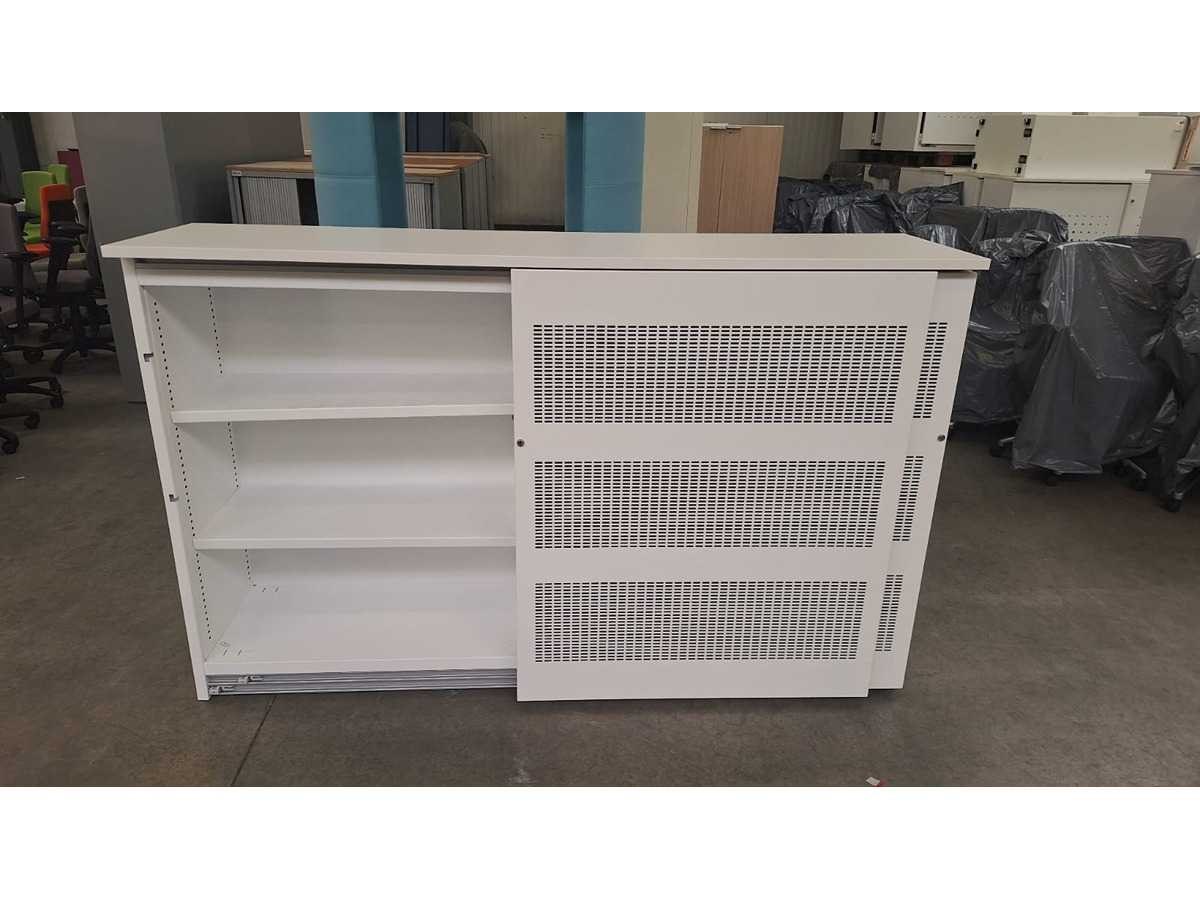 Kast volledig in metaal kleur Wit, schuifdeuren in metaal kleur Wit voorzien van akoestische vulling, beide zijdes voorzien van 2 legplanken in metaal kleur Wit, technisch in orde maar gebruikssporen aanwezig en sleutels ontbreken No Merk: Robberechts Kleur: Wit Gewicht: 150kg Breedte: 200cm Hoogte: 125cm Materiaal: Metaal, aluminium, kunststof Diepte: 50cm