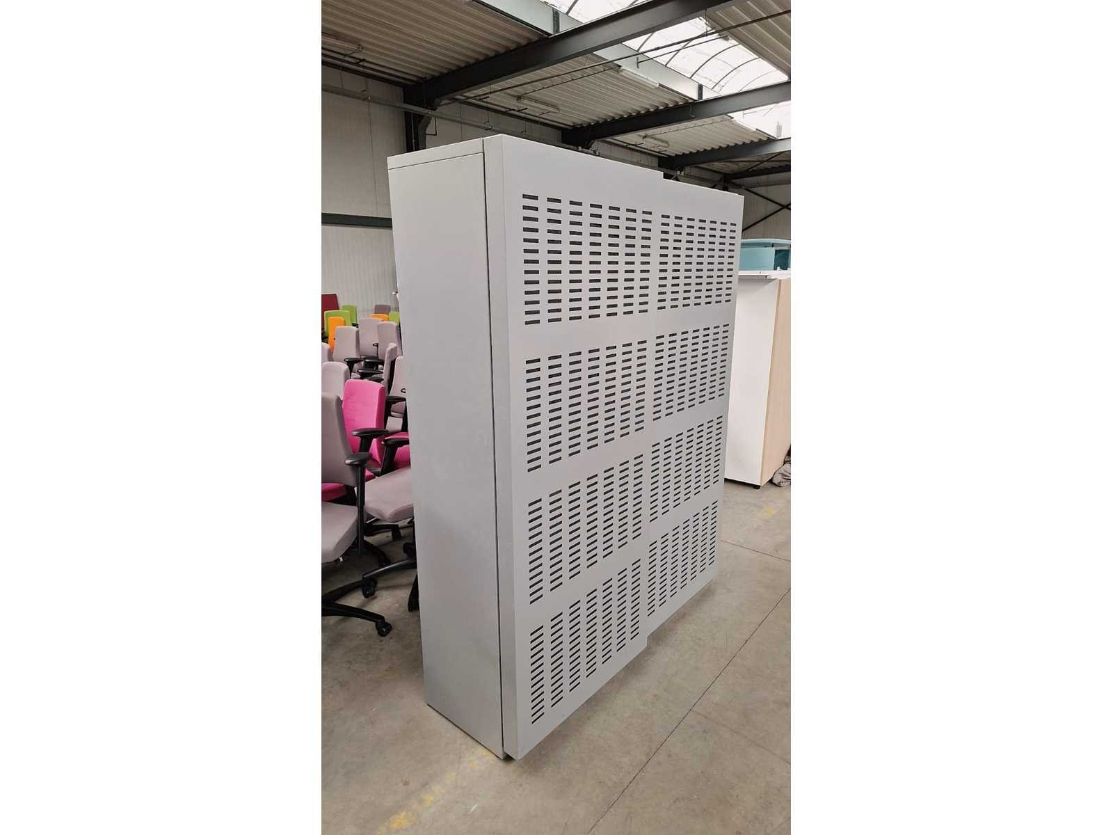 Kast volledig in metaal kleur Alu, schuifdeuren in metaal kleur Alu voorzien van akoestische vulling, beide zijdes voorzien van 4 legplanken in metaal kleur Zwart, technisch in orde maar gebruikssporen aanwezig en sleutels ontbreken No Merk: Robberechts Kleur: Alu Gewicht: 150kg Breedte: 160cm Hoogte: 197cm Materiaal: Metaal, aluminium, kunststof Diepte: 50cm