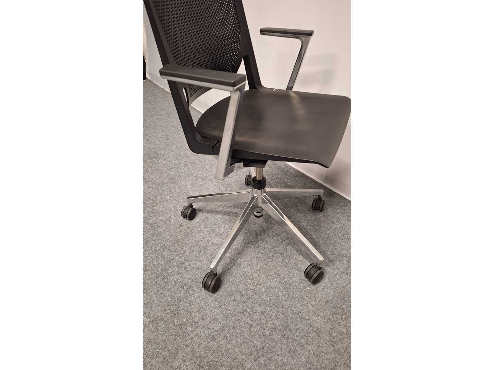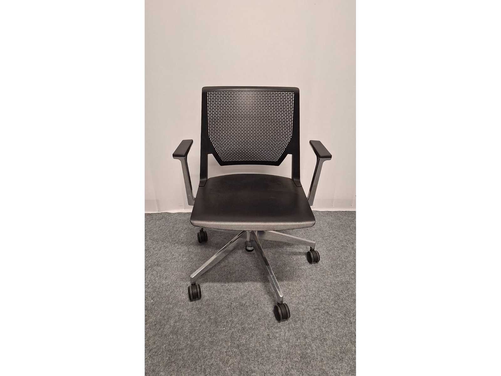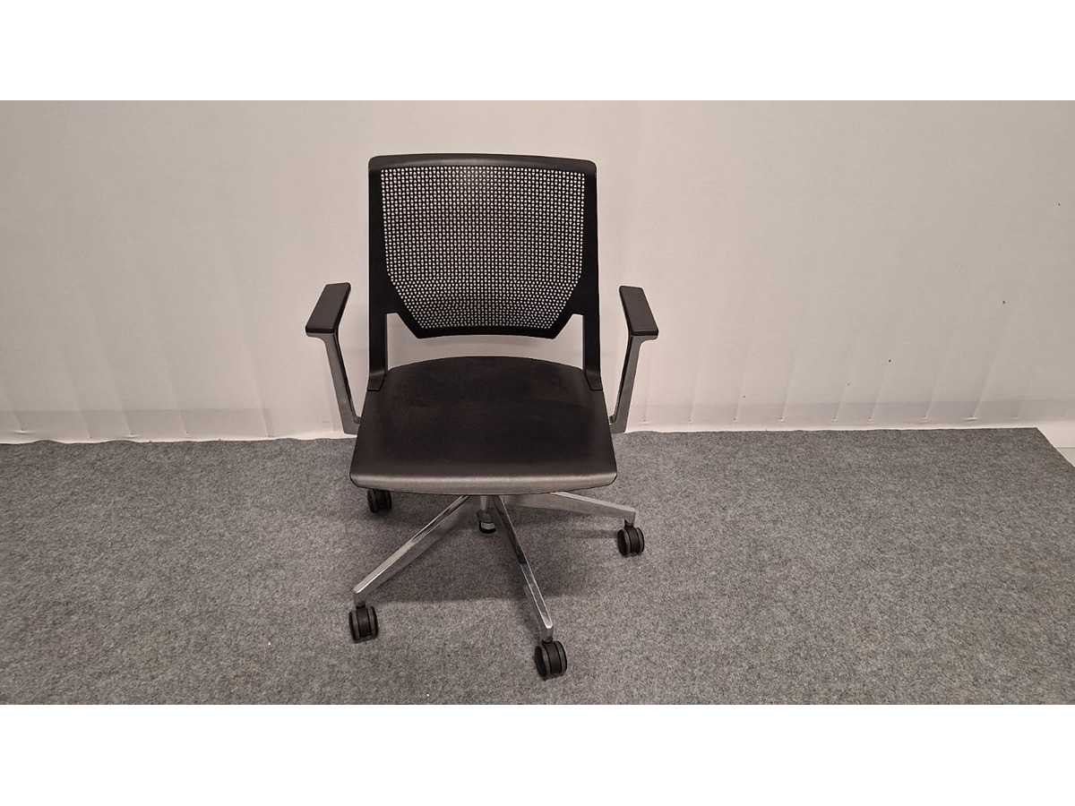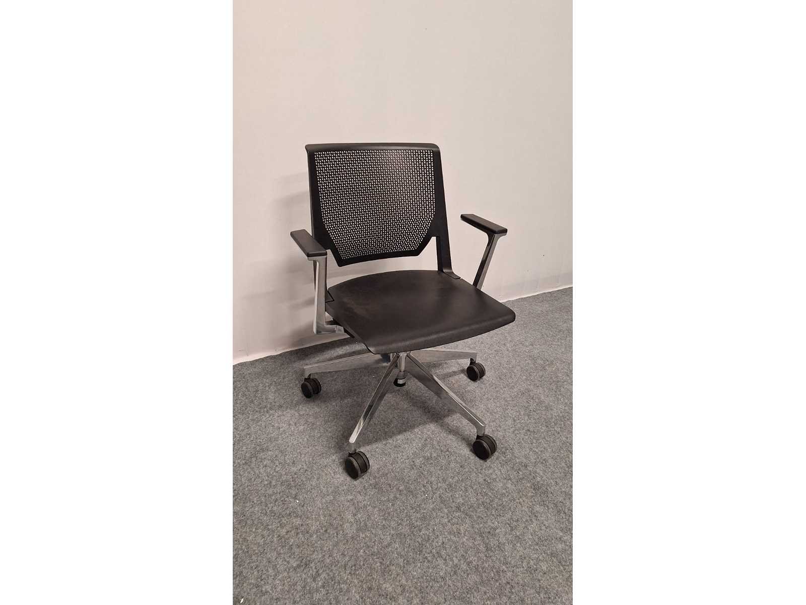 Voetkruis in gepolijst aluminium voorzien van multifunctionele zwenkwielen, armleuningen in gepolijst aluminium voorzien van kunststof leggers kleur Zwart, zitting en rugleuning in kunststof kleur Zwart, mooie design vergadertafel stoel uit hoogwaardige materialen samengesteld, gebruikssporen aanwezig No Merk: Haworth Kleur: alu-zwart Materiaal: Aluminium, metaal, kunststof Zithoogte: 41-51cm Hoogte: 880cm Breedte: 65cm Diepte: 55cm Gewicht: 200kg