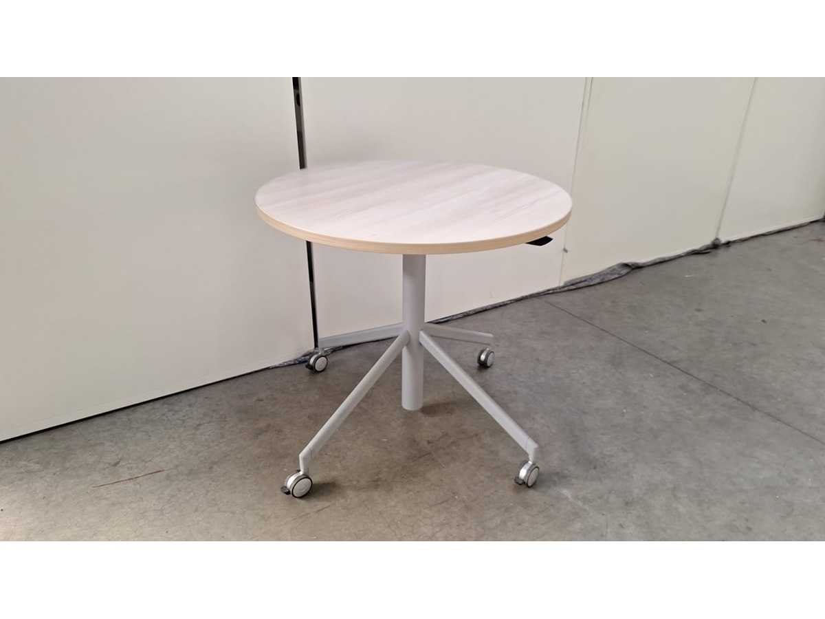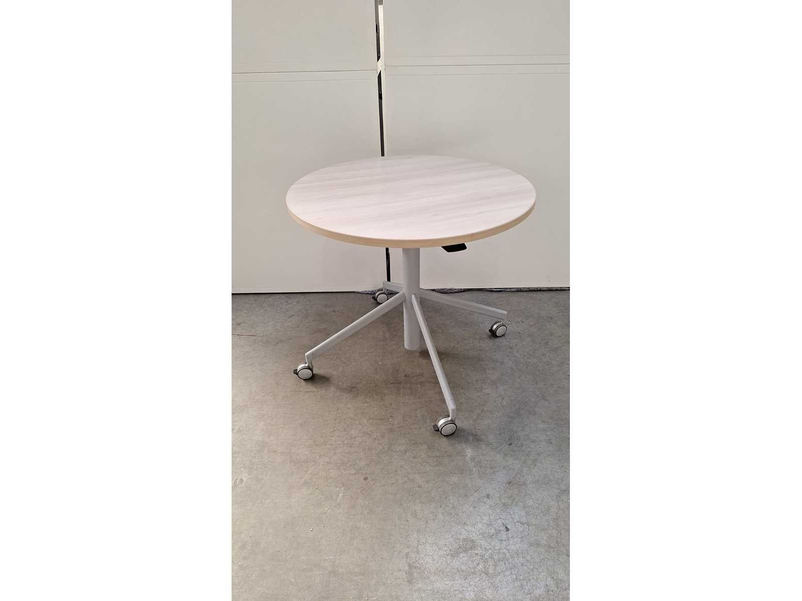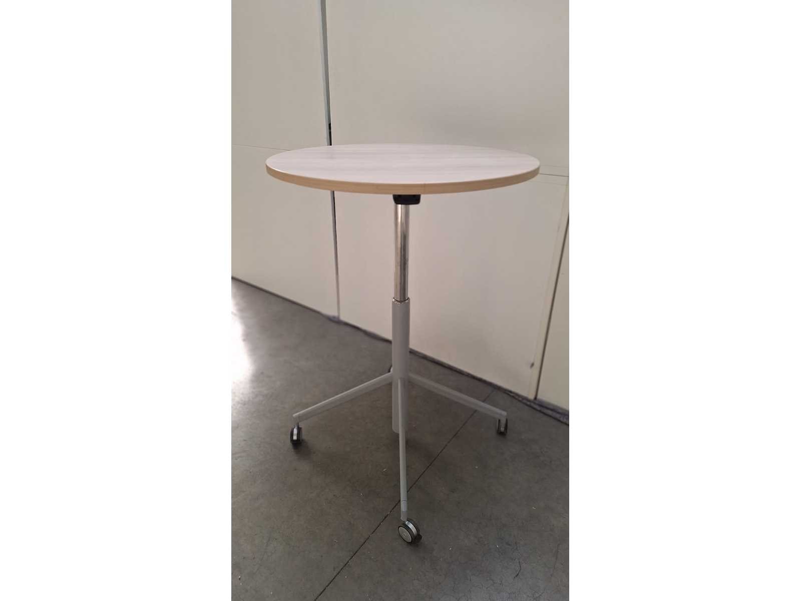 Hydraulisch in hoogte verstelbaar (720 - 1120 mm) mobiel onderstel in metaal kleur grijs voorzien van fixeerbare zwenkwielen, blad in melamine kleur lichte eik, in goede staat No Kleur: grijs - lichte eik Gewicht: 30kg Breedte: 80cm Hoogte: 72-112cm Diepte: 80cm Materiaal: metaal, kunststof, hout, melamine Tafeldikte: 28cm Verstelbaar: true