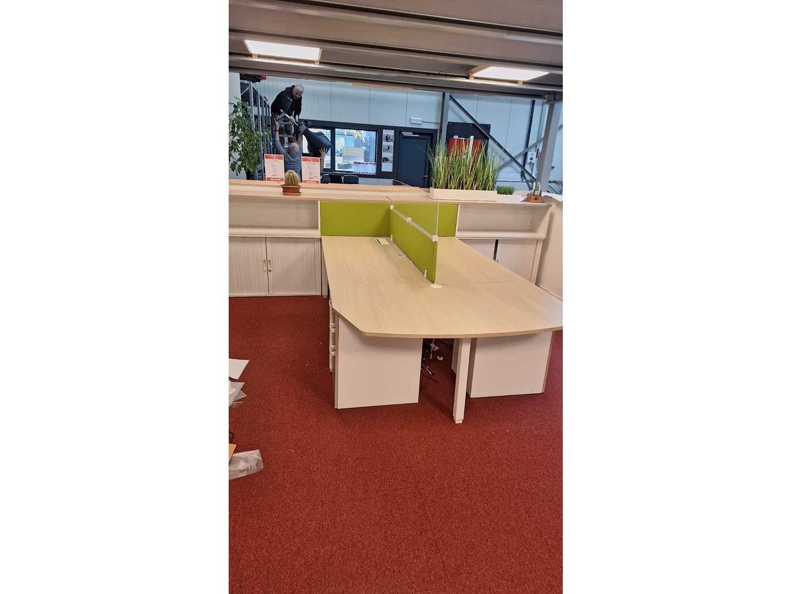 Onderstel in metaal kleur Wit, bladen in melamine kleur lichte eik voorzien van kabebldoorvoeren, vaste ladenblokken onder de opstelling voorzien van dossierlade + 2 gewone lades, bureauretour met ladenkastje aan beide zijdes, akoestische wandjes met bekleding in stof kleur groen, lichte gebruikssporen aanwezig No Merk: Meubelline Kleur: Lichte Eik - wit Gewicht: 150kg Lengte: 402cm Breedte: 320cm Hoogte: 73cm Materiaal: metaal, hout, melamine, kunststof