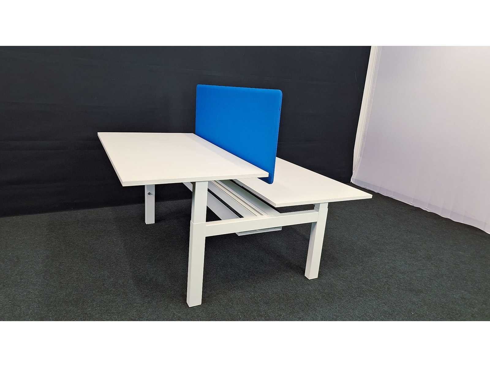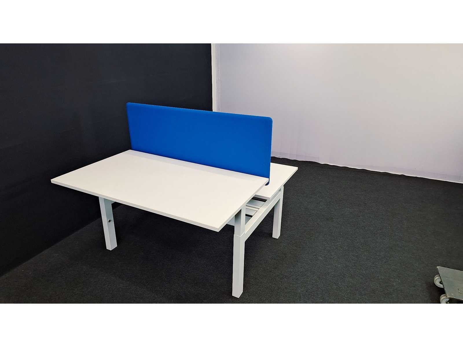 In hoogte verstelbaar onderstel in metaal kleur Wit voorzien van kabelgoot, bladen in melamine kleur Wit, akoestische wand bekleed met stof kleur Blauw, in zeer goede staat, werkbladen in hoogte verstelbaar van 640 - 820 mm No Merk: Robberechts Kleur: Wit-Blauw Gewicht: 120kg Breedte: 140cm Hoogte: 120cm Diepte: 170cm