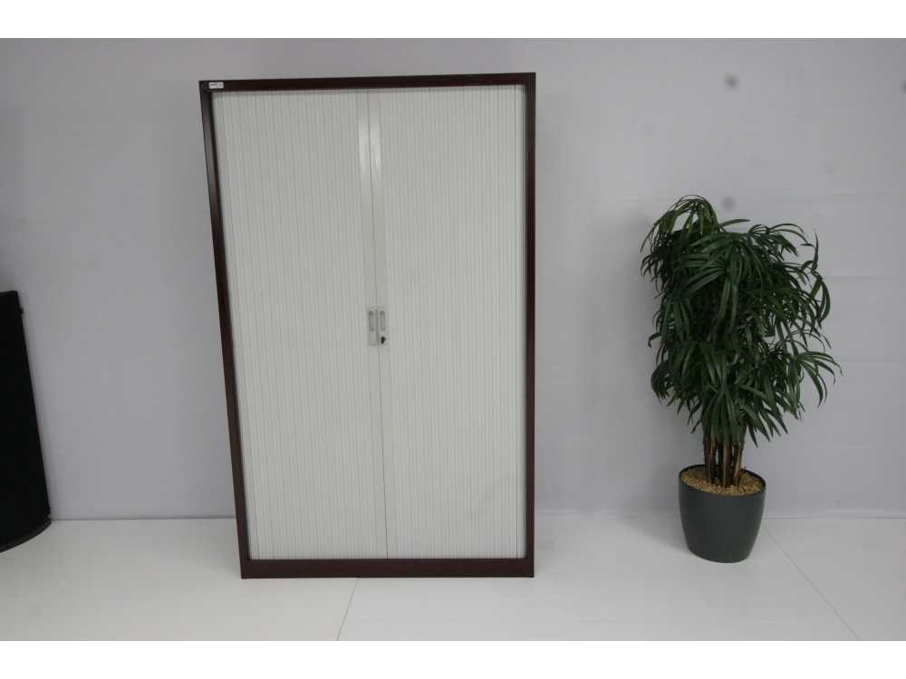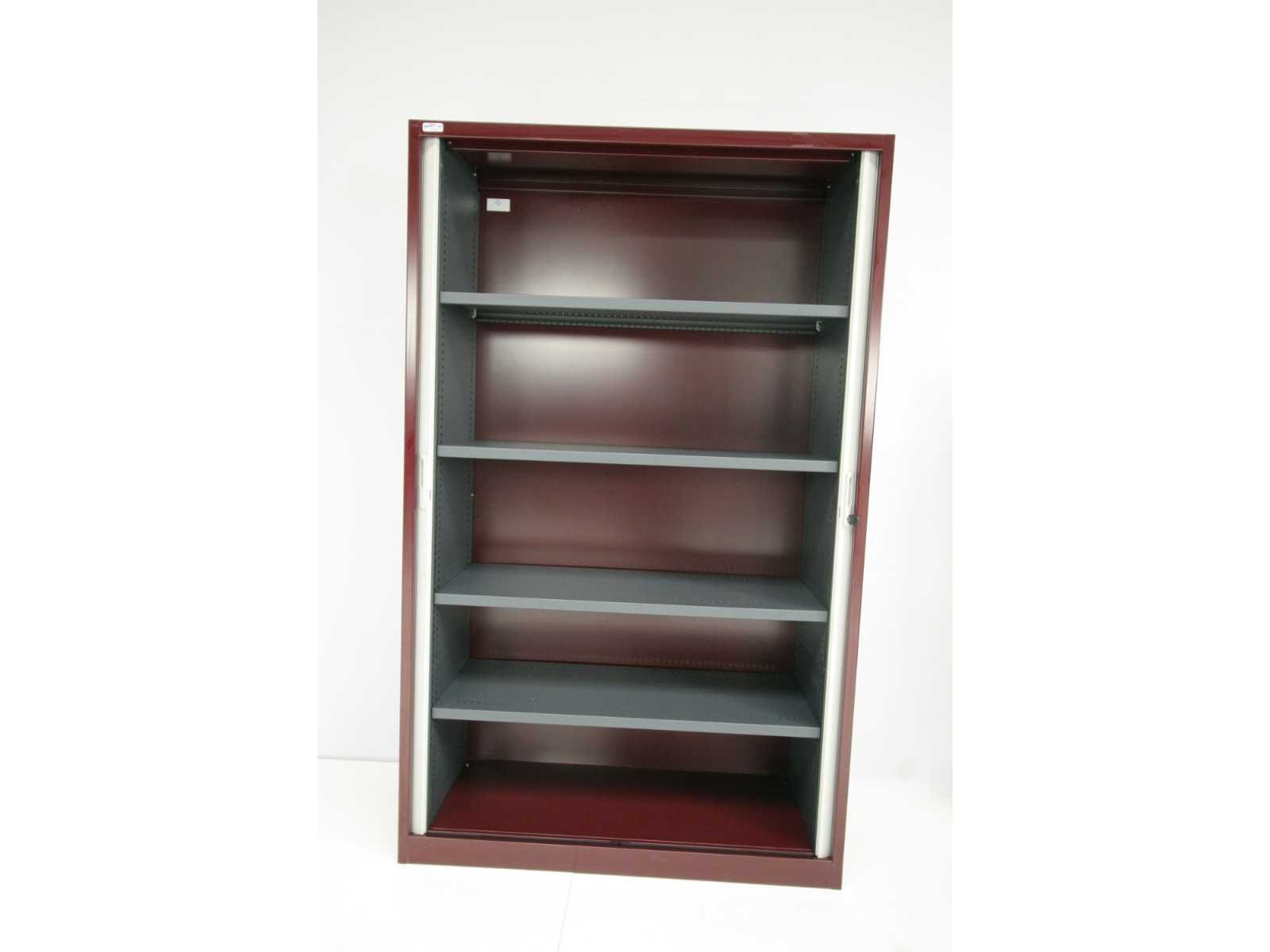 Frame volledig in metaal kleur Bordeauxrood, rolluiken in kunststof kleur wit, uitgerust met 4 legplanken, lichte gebruikssporen mogelijk No Merk: Pami Kleur: bordeaurood-wit Gewicht: 160kg Breedte: 120cm Hoogte: 198cm Materiaal: metaal, kunststof Diepte: 46cm Aantal laden: 4