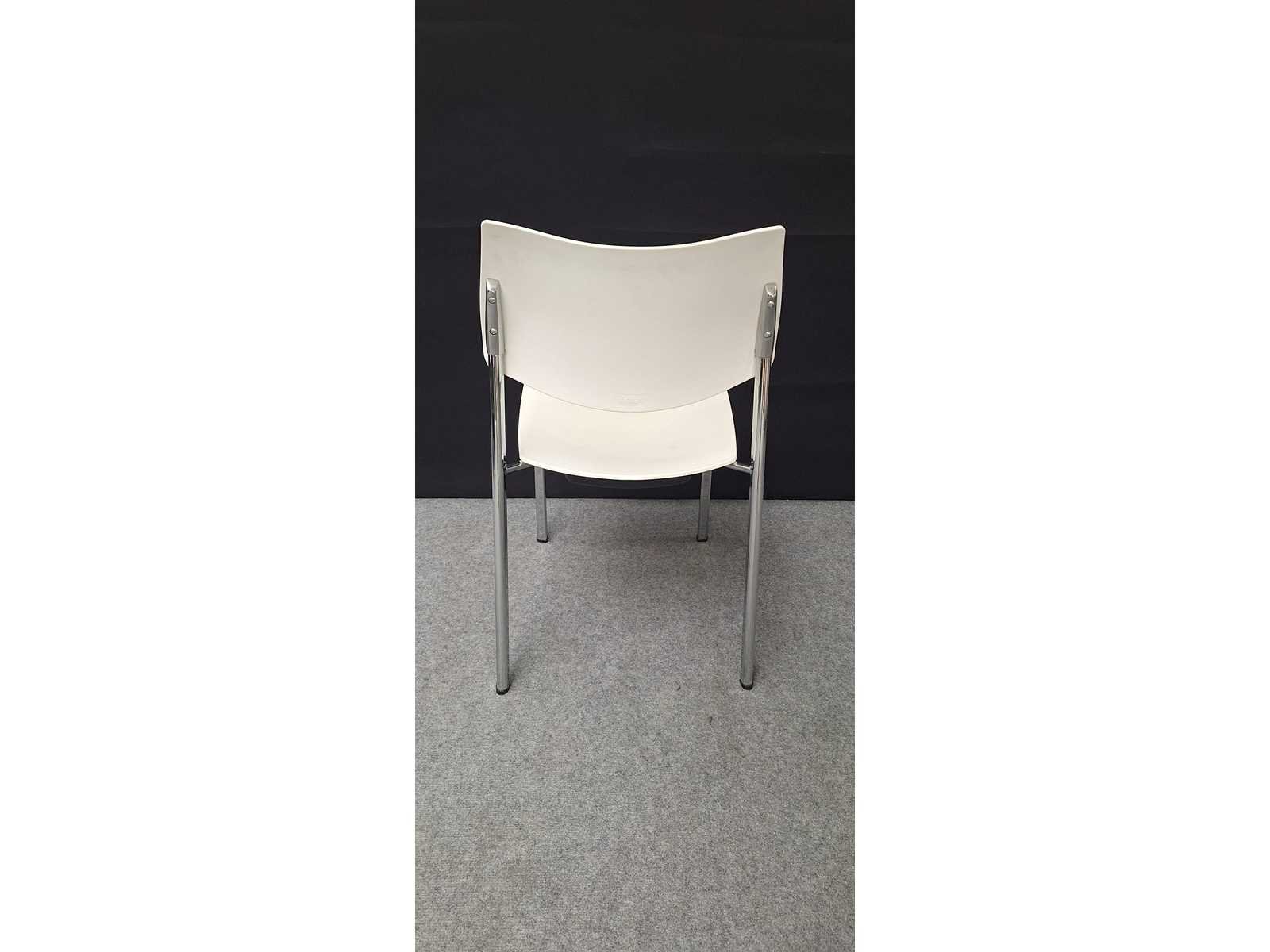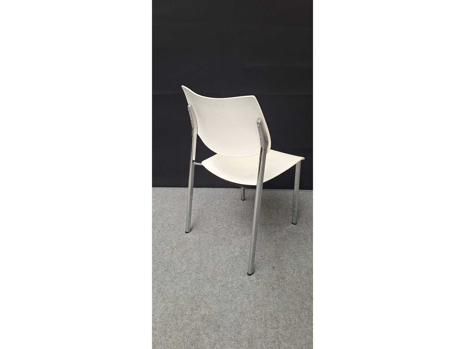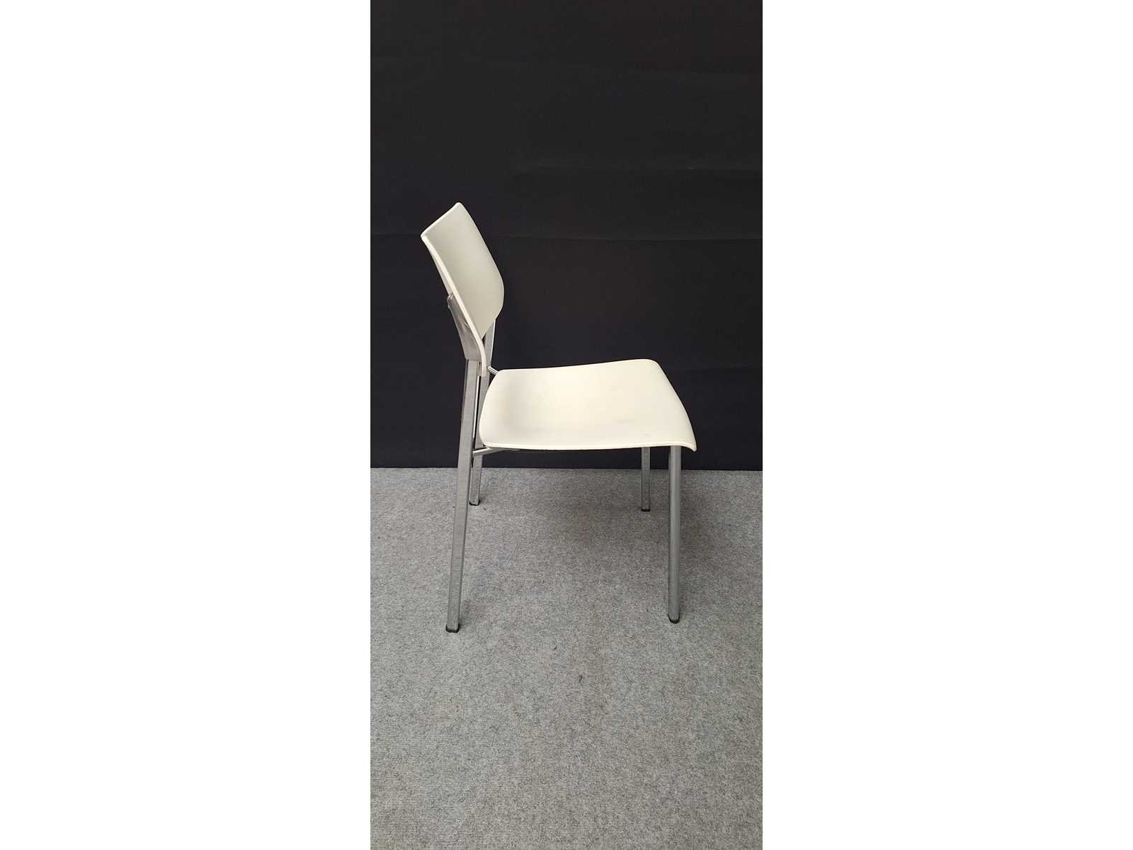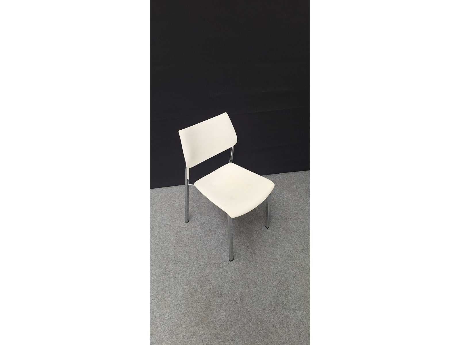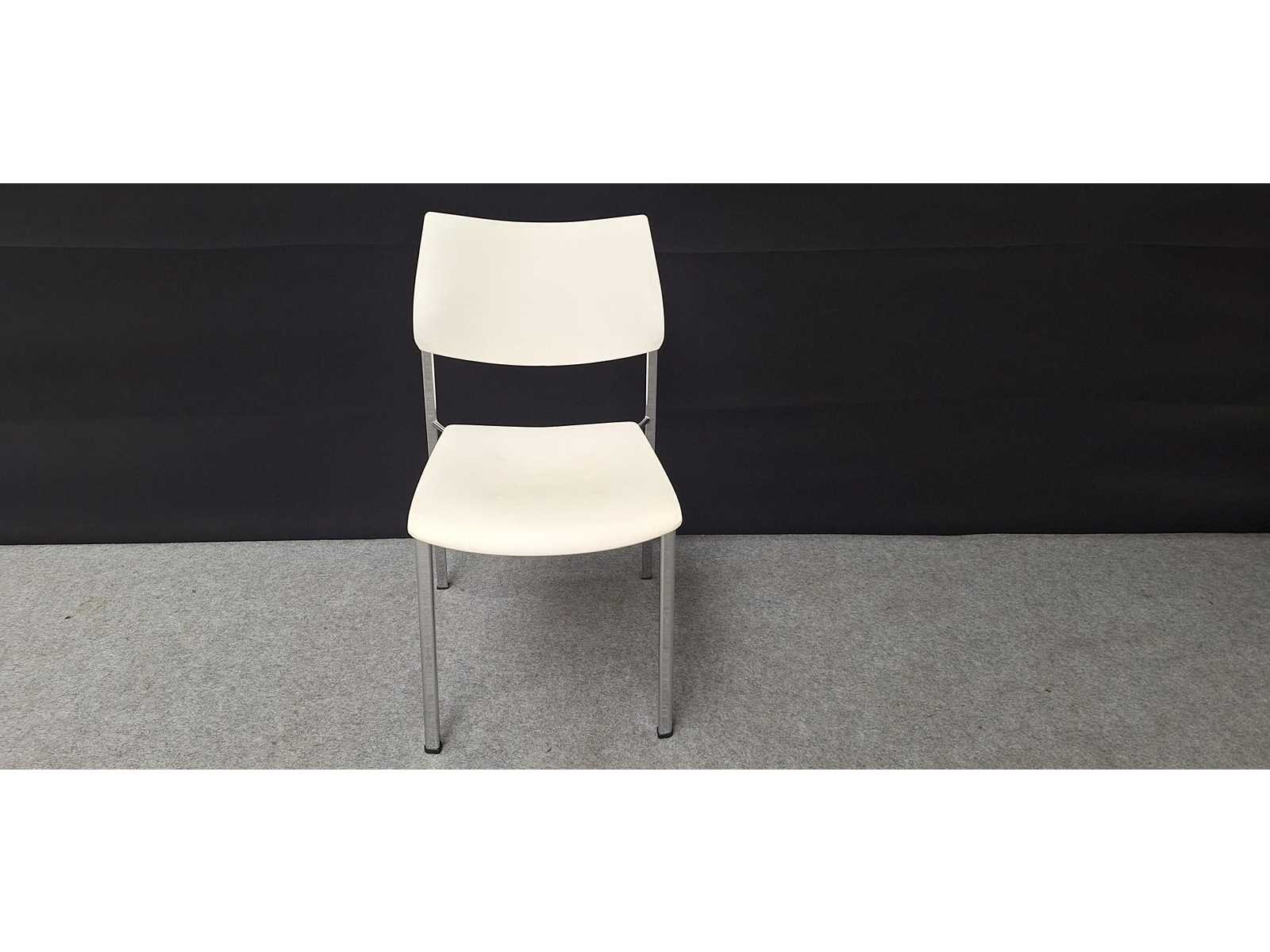 Stapelbaar vierpoots onderstel in aluminium, zitting en rugleuning in kunststof kleur wit, gebruikssporen aanwezig, foto's indicatief. No Merk: Akaba Kleur: Alu-Wit Materiaal: kunststof, aluminium Zithoogte: 42cm Hoogte: 82cm Breedte: 47cm Diepte: 47cm Gewicht: 50kg