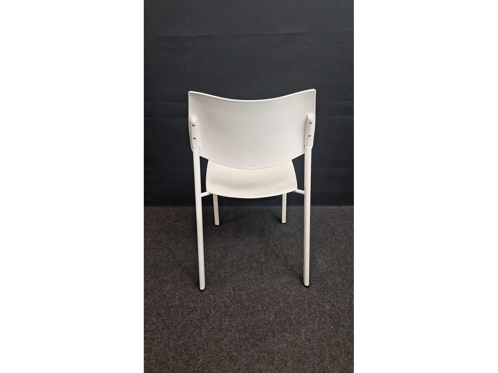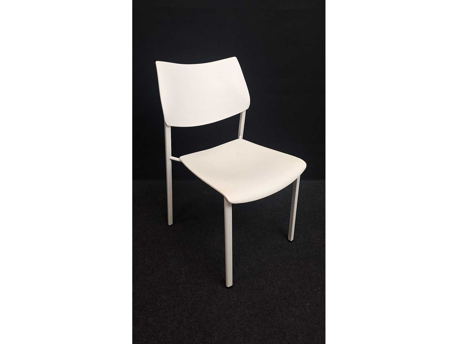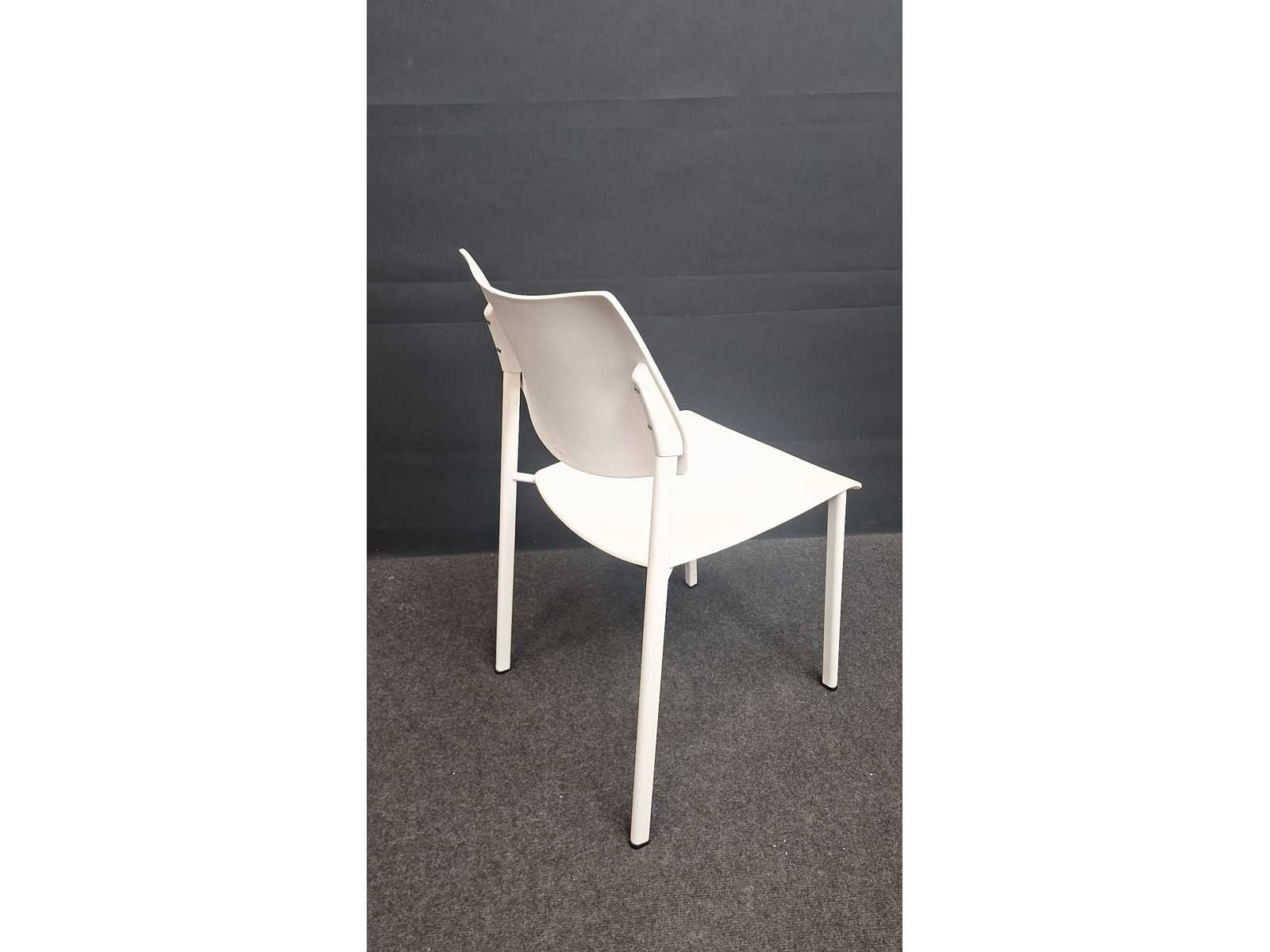 Vierpootsonderstel in metaal kleur wit, schaal in kunststof kleur wit, stapelbaar, lichte gebruikssporen aanwezig No Merk: AKABA Kleur: wit Materiaal: metaal, kunststof Zithoogte: 43cm Hoogte: 80cm Breedte: 45cm Diepte: 45cm Gewicht: 60kg