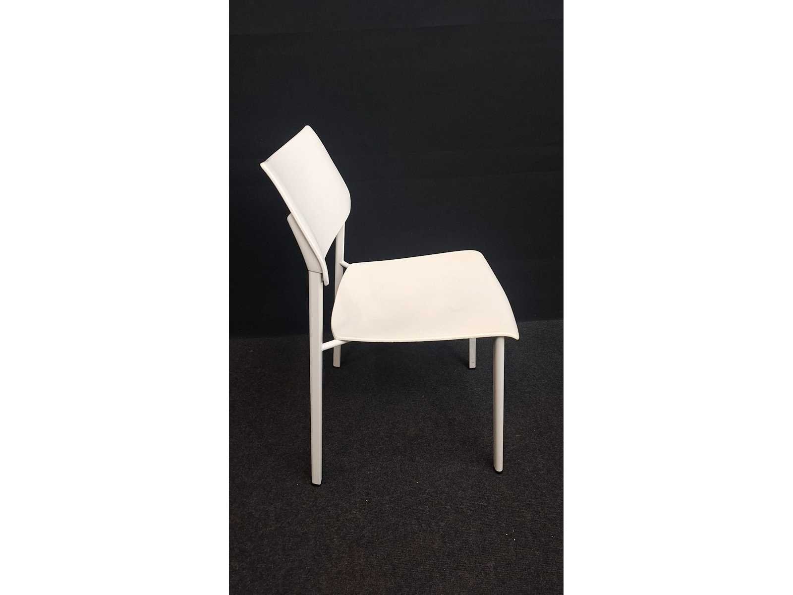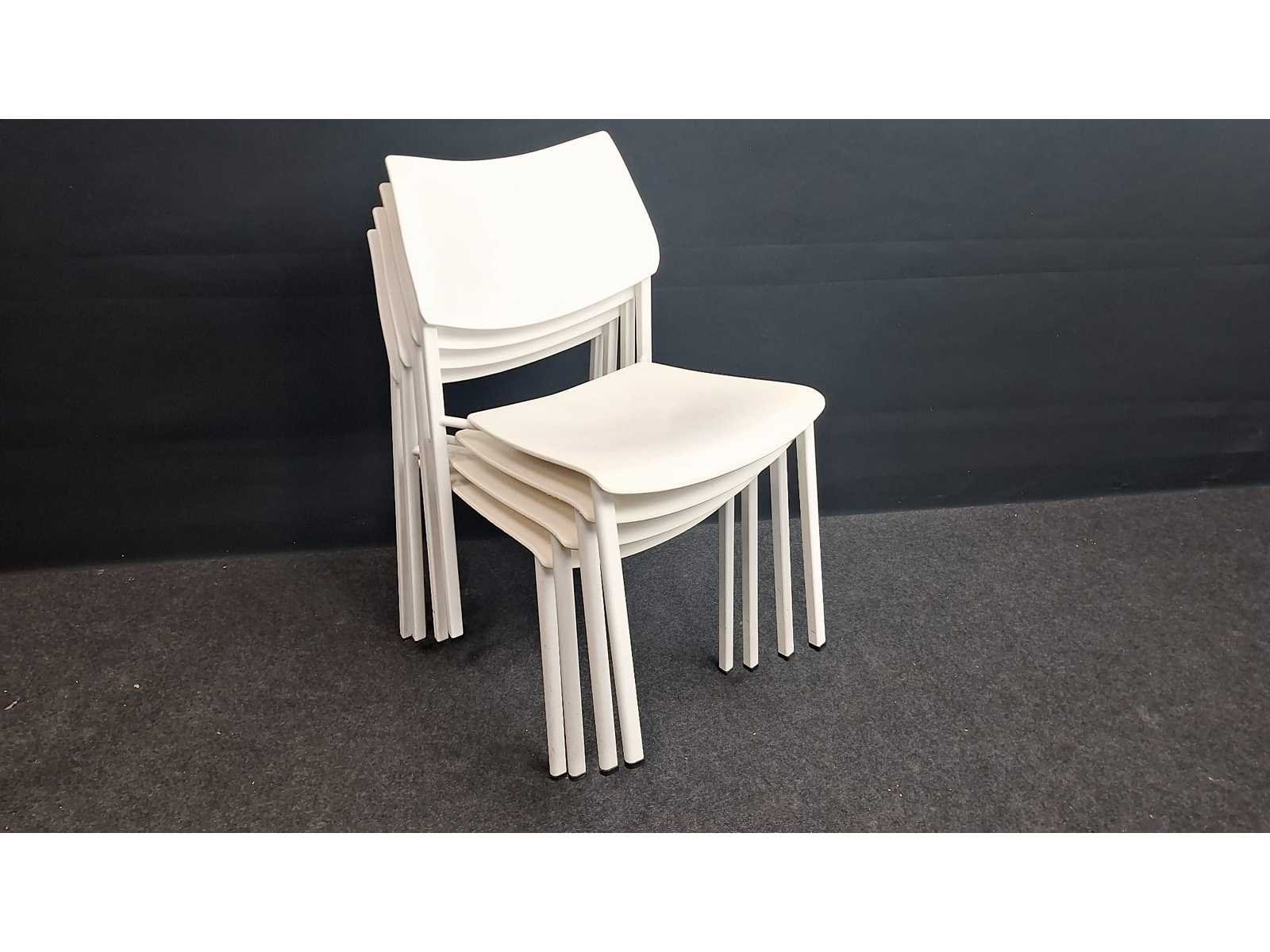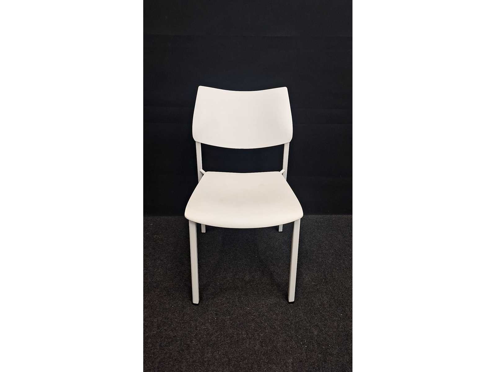 Vierpootsonderstel in metaal kleur wit, schaal in kunststof kleur wit, stapelbaar, lichte gebruikssporen aanwezig No Merk: AKABA Kleur: wit Materiaal: metaal, kunststof Zithoogte: 43cm Hoogte: 80cm Breedte: 45cm Diepte: 45cm Gewicht: 60kg
