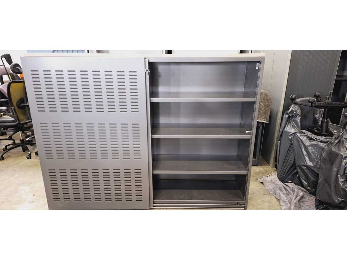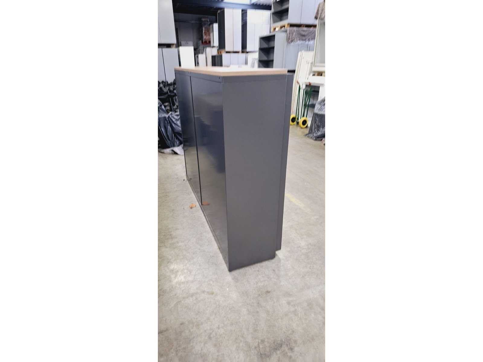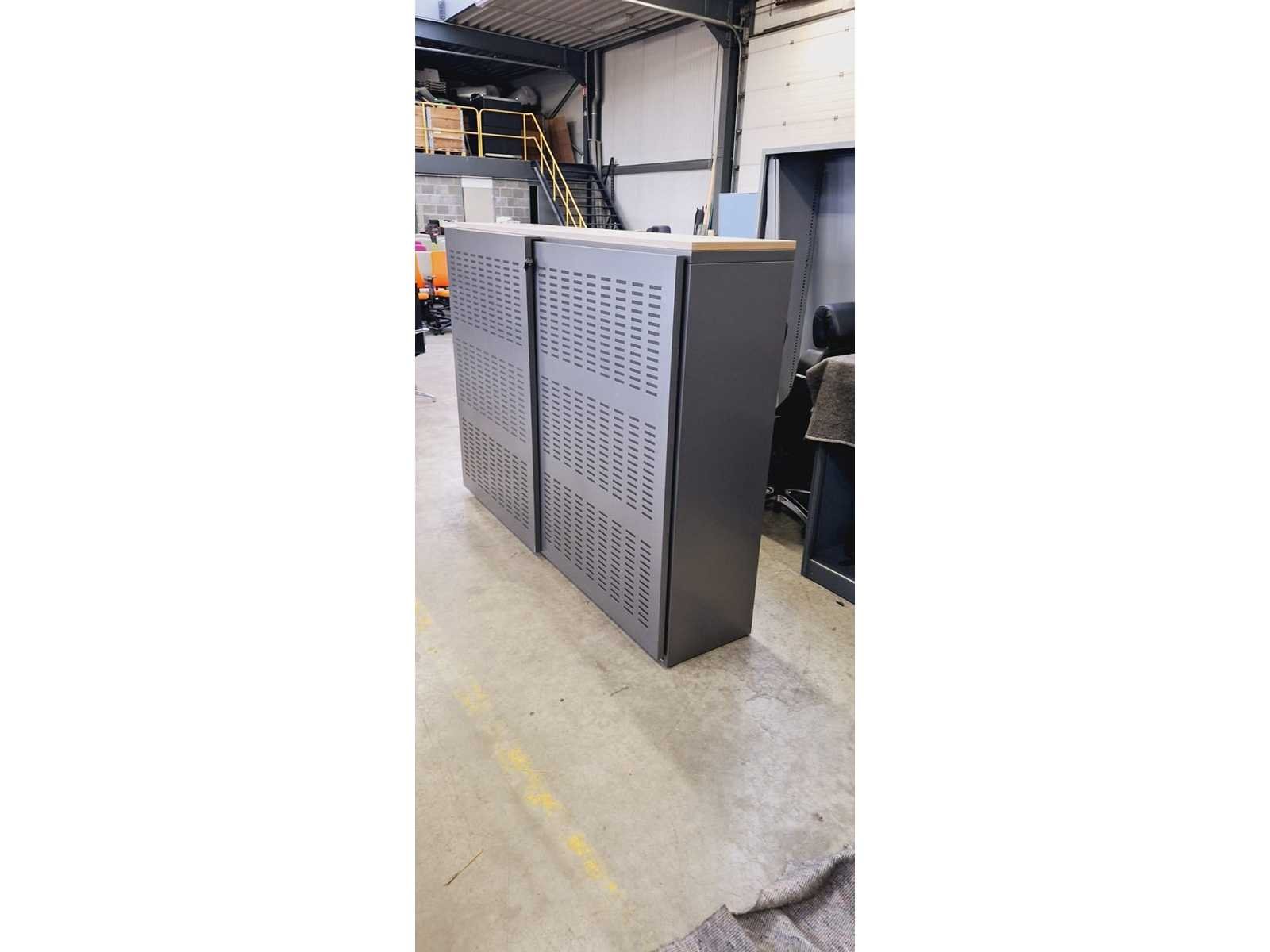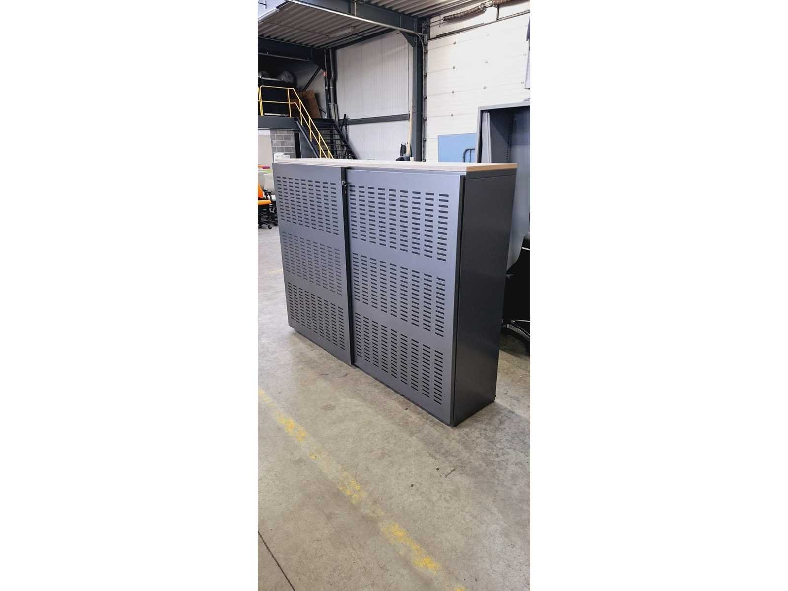 Kast volledig in metaal kleur antraciet, top in melamine kleur Havanna, geperforeerde deuren met akoestische vulling, 3 legplanken per zijde, lichte gebruikssporen mogelijk No Merk: Pami Kleur: Antraciet-Havanna Gewicht: 150kg Breedte: 200cm Hoogte: 152cm Materiaal: Metaal, aluminium, kunststof, hout, melamine Diepte: 50cm Aantal laden: 6
