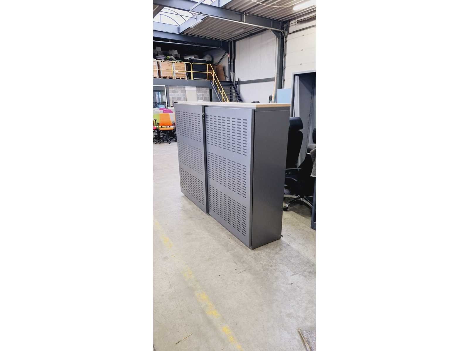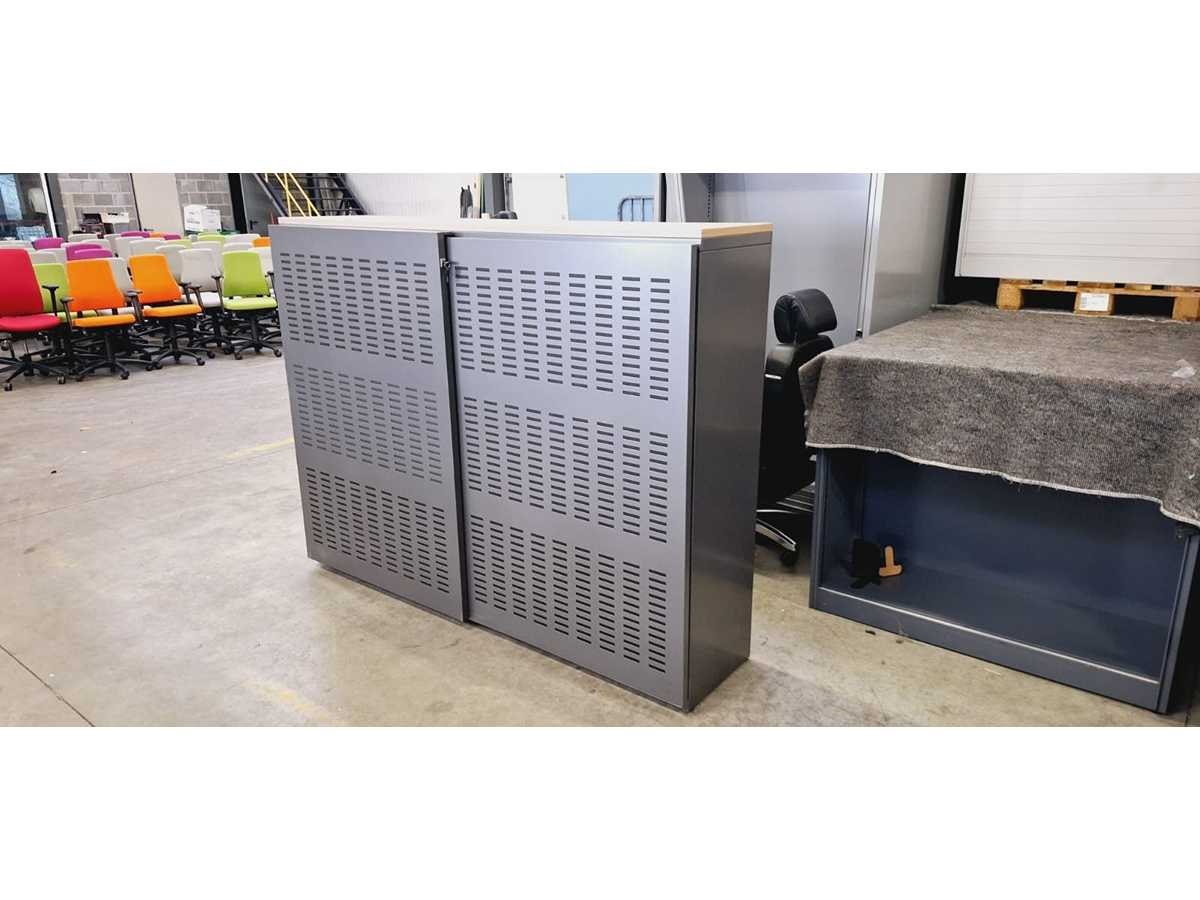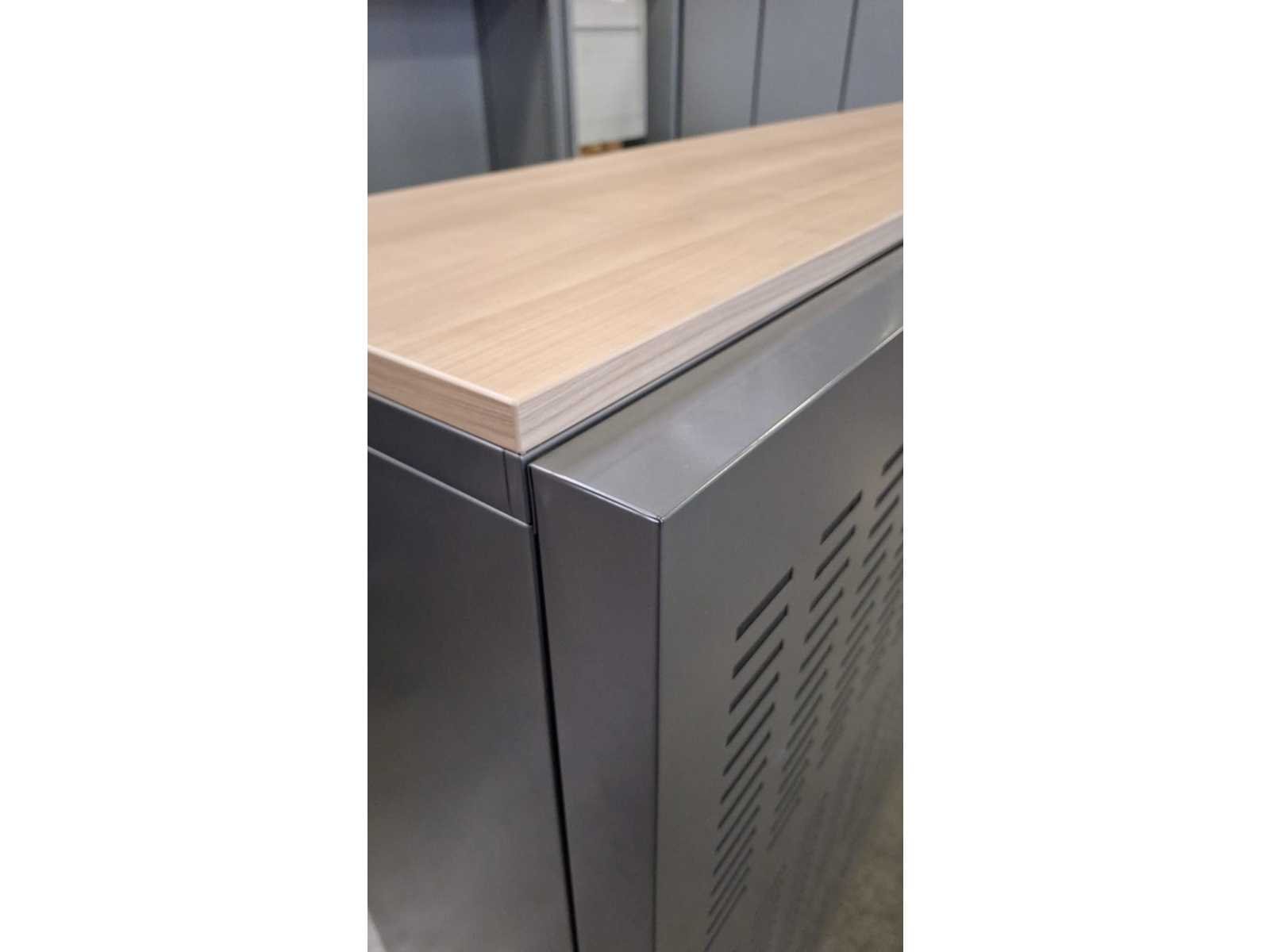 Kast volledig in metaal kleur antraciet, top in melamine kleur Havanna, geperforeerde deuren met akoestische vulling, 3 legplanken per zijde, lichte gebruikssporen mogelijk, foto's indicatief. No Merk: Pami Kleur: Antraciet-Havanna Gewicht: 150kg Breedte: 200cm Hoogte: 152cm Materiaal: Metaal, aluminium, kunststof, hout, melamine Diepte: 50cm Aantal laden: 6