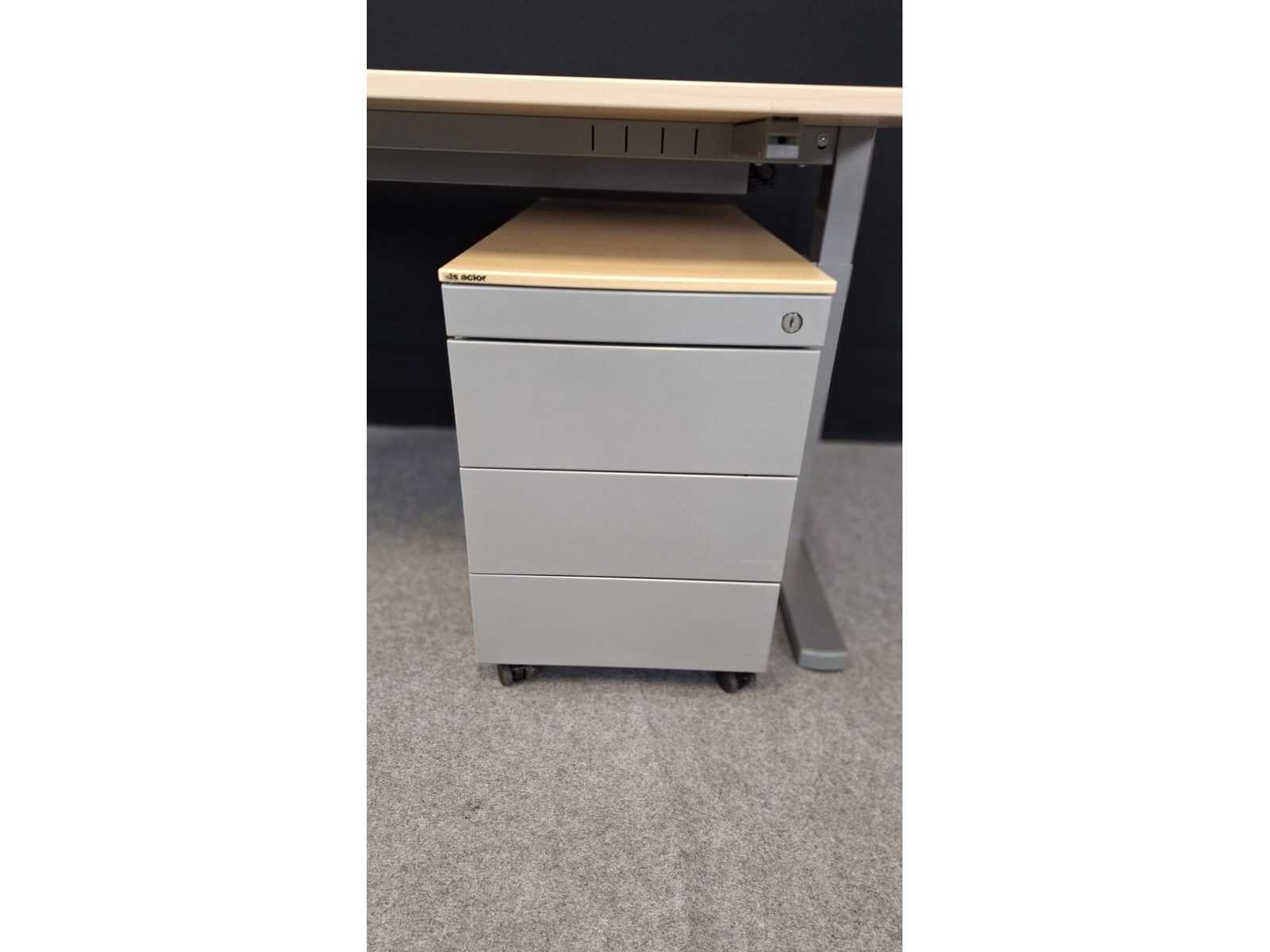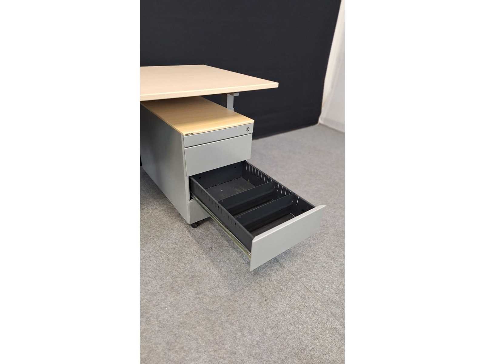 Onderstel in metaal kleur Aluminium, blad in melamine kleur Ahorn voorzien van elektrificatie, goede staat, inclusief mobiel ladenblok TDS in metaal kleur alu, uitgerust met 3 lades + pennenlade en top in melamine, lichte gebruikssporen mogelijk, sleutel ontbreekt No Merk: Pami Kleur: Alu-Ahorn Gewicht: 80kg Lengte: 160cm Hoogte: 73cm Materiaal: Metaal, aluminium, hout, melamine, kunststof Diepte: 80cm
