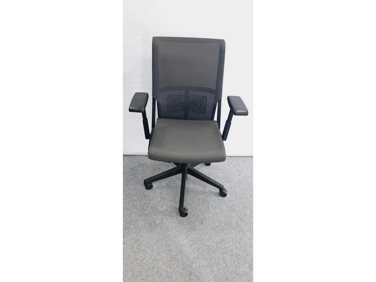 Kruisvoet in kunststof kleur Zwart voorzien van standaard zwenkwielen, zitting bekleed in stof kleur Antraciet, rugleuning in netweave kleur Antraciet, in hoogte verstelbaar, synchromechanisme met gewichtsinstelling, instelbare zitdiepte, verstelbare lende steun, in goede staat maar kleine beschadiging aan netweave (zie foto) No Merk: Haworth Type: System 59 Kleur: Antraciet Gewicht: 30kg Breedte: 70cm Hoogte: 100cm Diepte: 70cm Materiaal: Metaal, kunststof, aluminium, stof