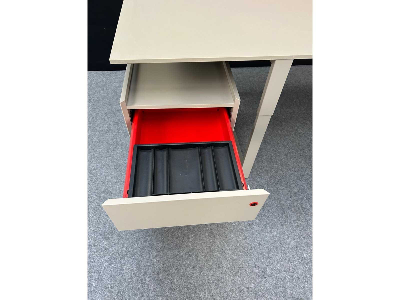 In hoogte verstelbaar onderstel in metaal kleur Grijs, voorzien van kabelgoot en PC houder, bladen in HDF kleur Grijs, inclusief mobiel ladenblok kleur Grijs voorzien van 1 dossierlade + 1 pennenlade, INCLUSIEF 2 akoestische scheidingswandjes, goede staat, foto's indicatief. No Merk: BULO Kleur: Grijs Gewicht: 600kg Lengte: 220cm Hoogte: 62-82cm Materiaal: Metaal, hout, kunststof Diepte: 80cm