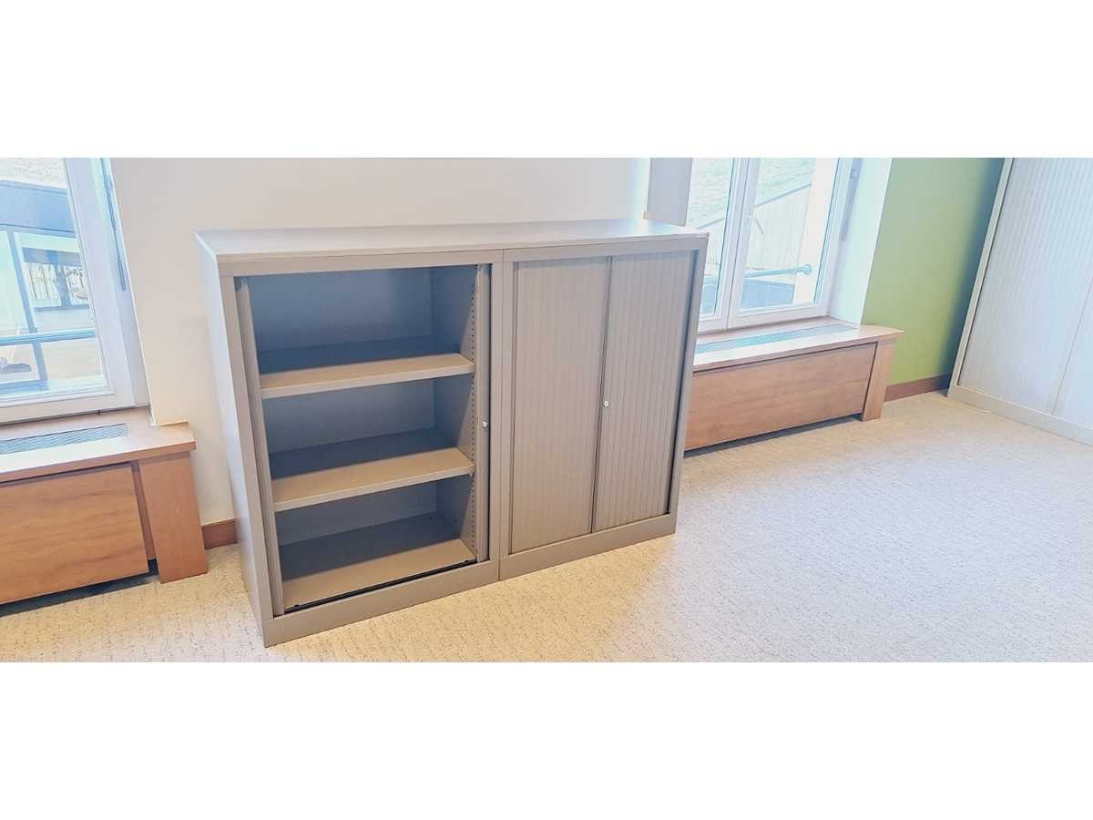 Tweedelige kast in metaal kleur licht Antraciet, roldeuren in kunststof kleur licht licht Antraciet, top in melamine kleur Robson EIk, 2 legplanken per kant, goede staat maar sleutels kunnen ontbreken, afm. 1600 x 1200 , foto's indicatief. No Merk: Benjo Kleur: Antraciet-Robson Eik Gewicht: 80kg Lengte: 160cm Hoogte: 120cm Materiaal: Metaal, kunststof Diepte: 45cm Aantal laden: 2