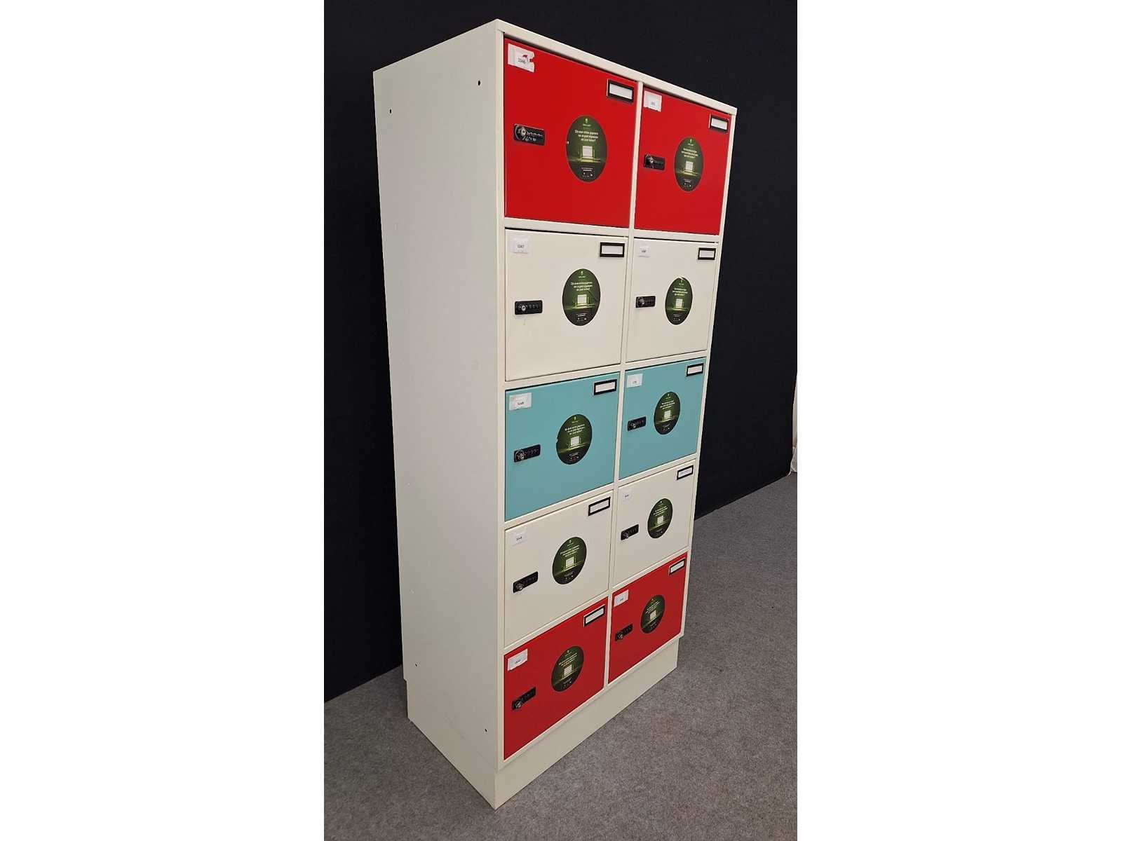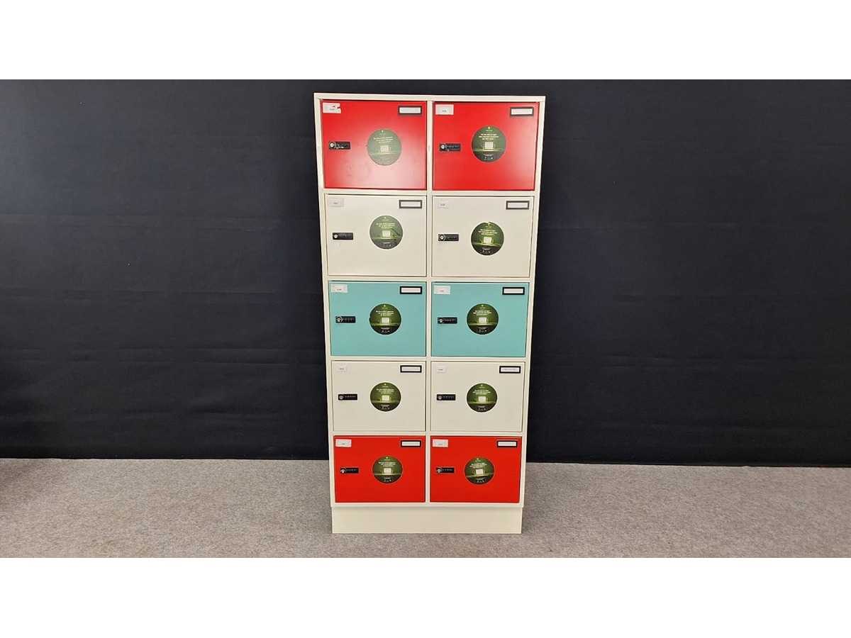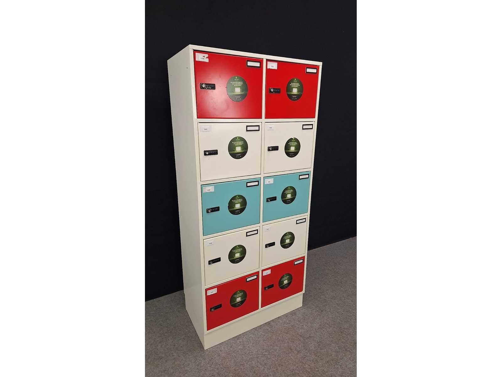 Kast volledig in metaal kleur wit, uitgerust met 10 deuren kleur Rood/Wit, elke deur uitgerust met een codeslot voor persoonlijke veiligheid en een persoonlijk nummer, alle sloten zijn ge-reset, gebruiksaanwijzing aanwezig, afm. 1950 x 900 x 500 mm (h x b x d), afmetingen lockers 450 x 350 x 500 mm (b x h x d) , in goede staat. No Merk: Robberechts Kleur: wit-rood-turqoise Gewicht: 40kg Lengte: 50cm Breedte: 90cm Hoogte: 195cm