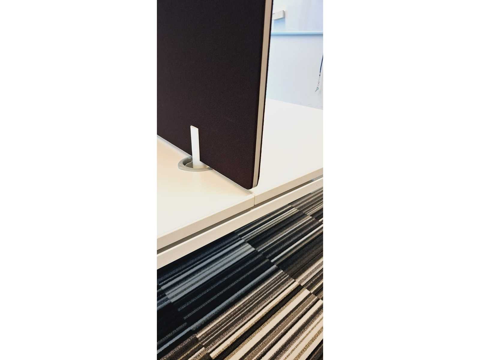 Onderstel in metaal kleur Wit voorzien van kabelgoten, werkbladen in melamine kleur Wit voorzien van kabeldoorvoeren in alu, akoestische scheidingswanden bekleed met stof kleur Zwart, in goede staat stof wandje moet gereinigd worden, afm. 3200 x 1600 x 740 mm (l x d x h) No Merk: Haworth Kleur: Wit Gewicht: 120kg Lengte: 320cm Hoogte: 74cm Materiaal: Metaal, kunststof, aluminium, hout, melamine, stof Diepte: 160cm