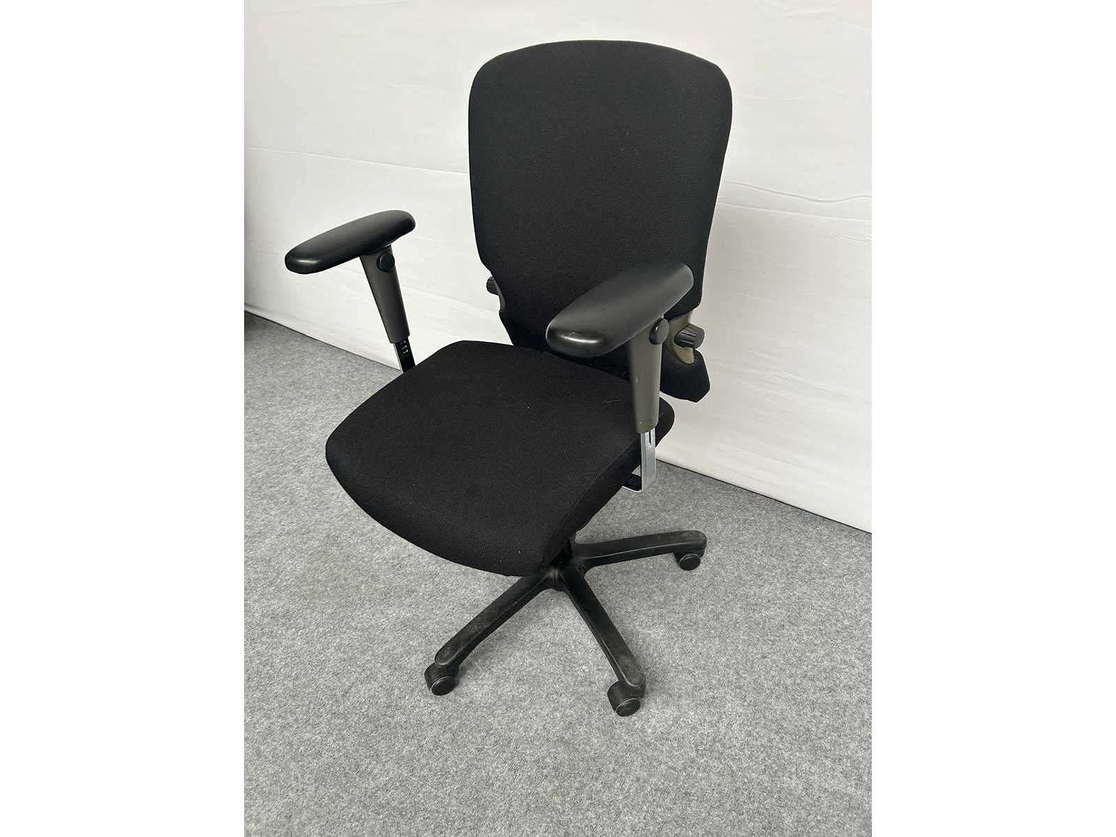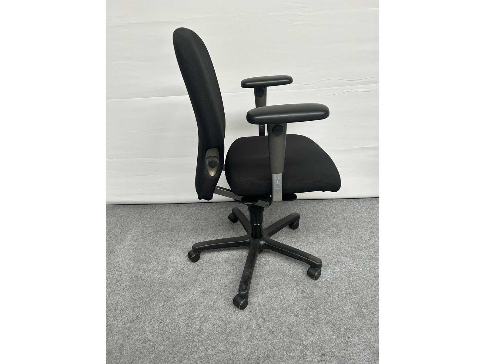 Stervoet in kunststof kleur Zwart voorzien van standaard zwenkwielen, bekleding in stof kleur Zwart, in hoogte verstelbaar, in hoogte verstelbare rugleuning, verstelbare lendesteun, synchromechanisme met gewichtsinstelling, 4D armleuningen met softpads, gebruikssporen aanwezig, foto's indicatief No Merk: Comforto Type: 77 Kleur: Zwart Gewicht: 30kg Breedte: 70cm Hoogte: 100cm Diepte: 70cm Materiaal: Metaal, aluminium, kunststof, stof