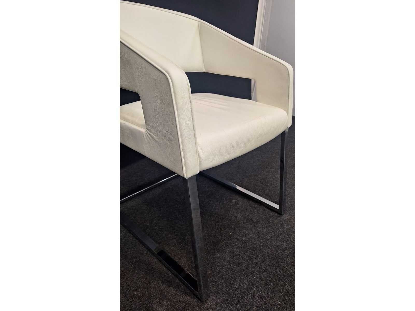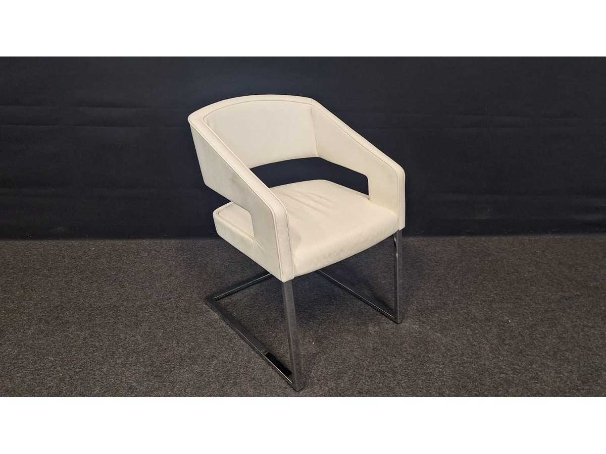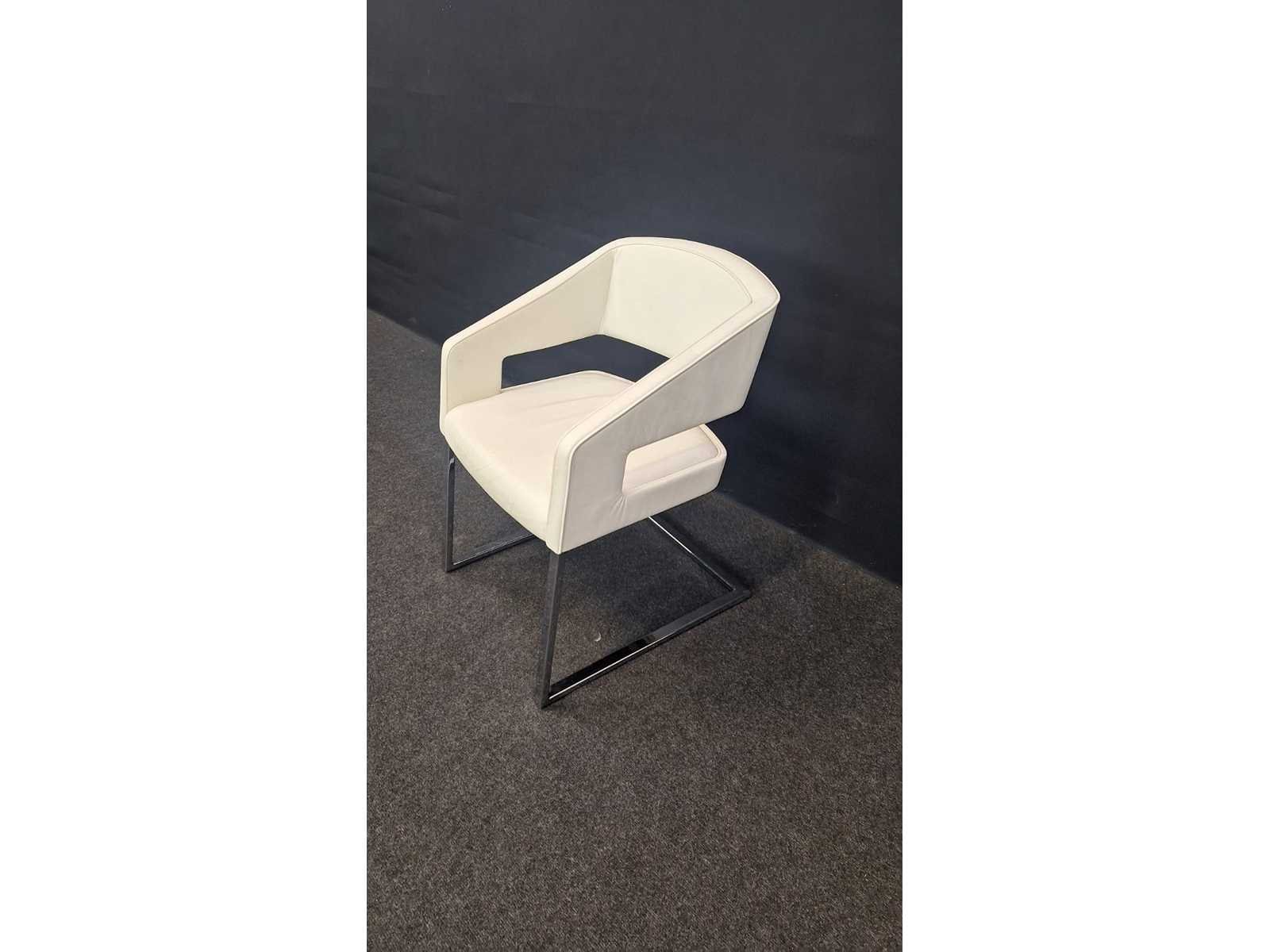 Slede onderstel in metaal hoogglans verchroomd, bekleding in leder kleur Wit, gebruikssporen aanwezig leder te reinigen No Merk: NN Kleur: Wit Materiaal: Metaal, kunststof, leder Zithoogte: 43cm Hoogte: 80cm Breedte: 60cm Diepte: 60cm Gewicht: 80kg