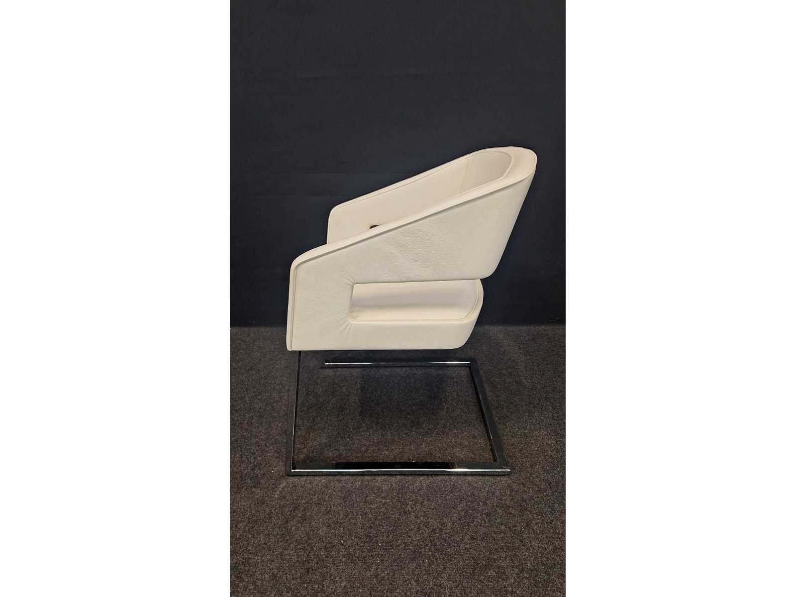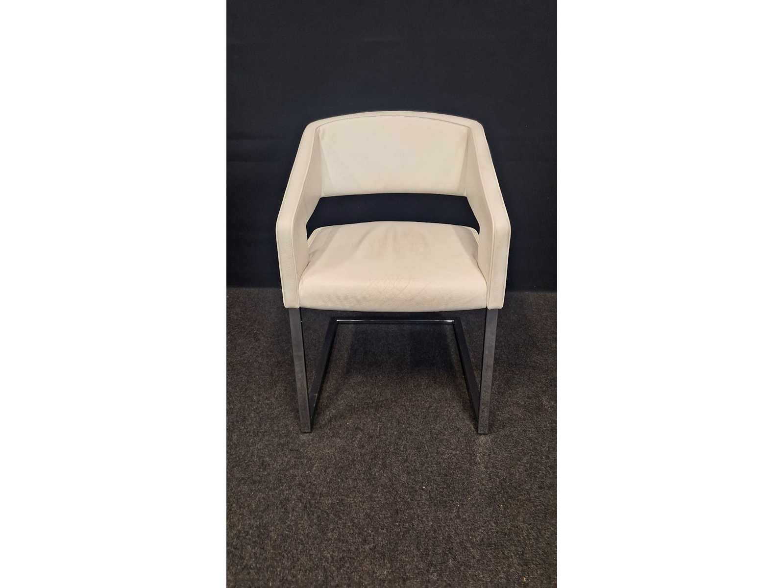 Slede onderstel in metaal hoogglans verchroomd, bekleding in leder kleur Wit, gebruikssporen aanwezig leder te reinigen No Merk: NN Kleur: Wit Materiaal: Metaal, kunststof, leder Zithoogte: 43cm Hoogte: 80cm Breedte: 60cm Diepte: 60cm Gewicht: 120kg