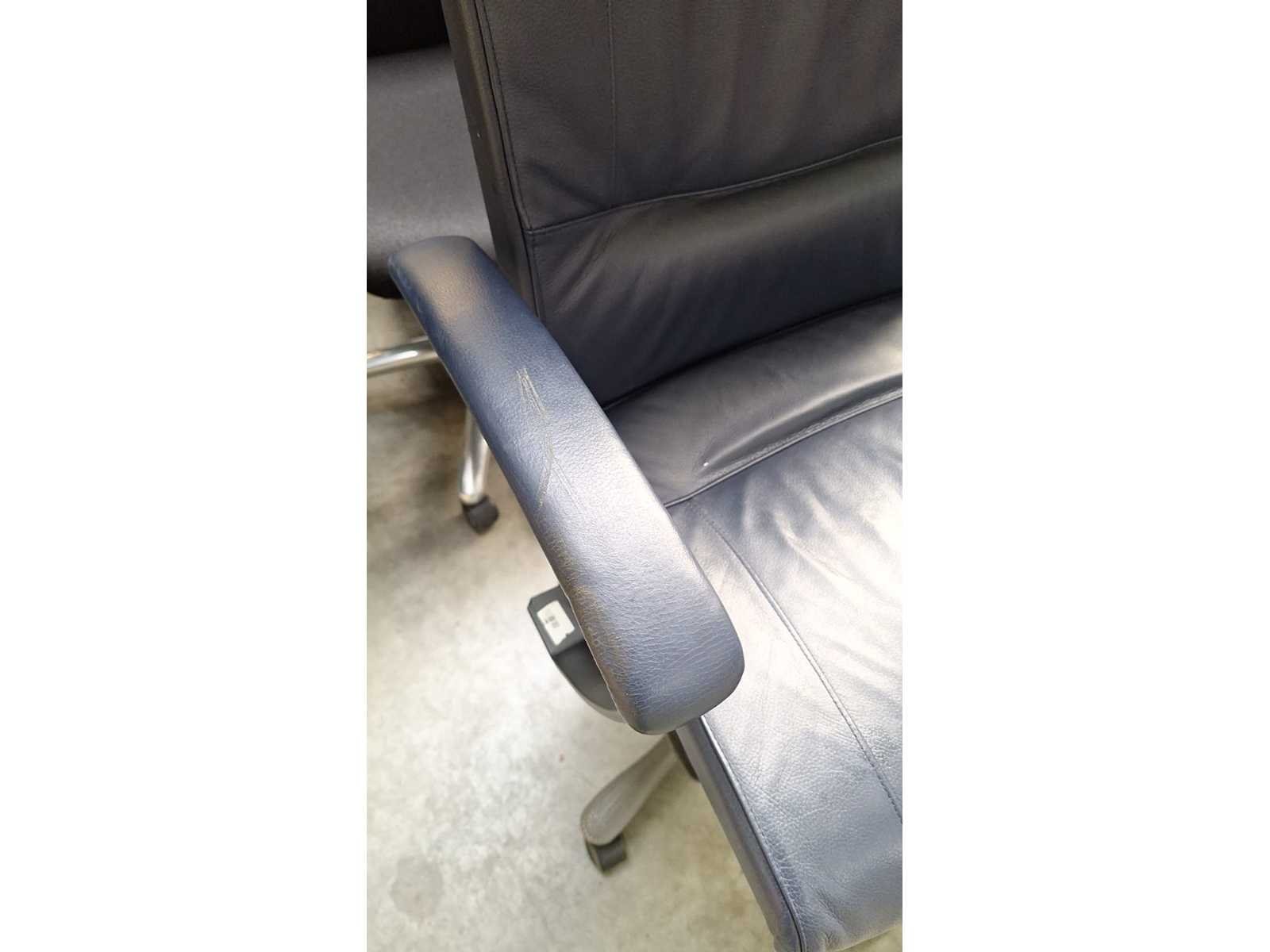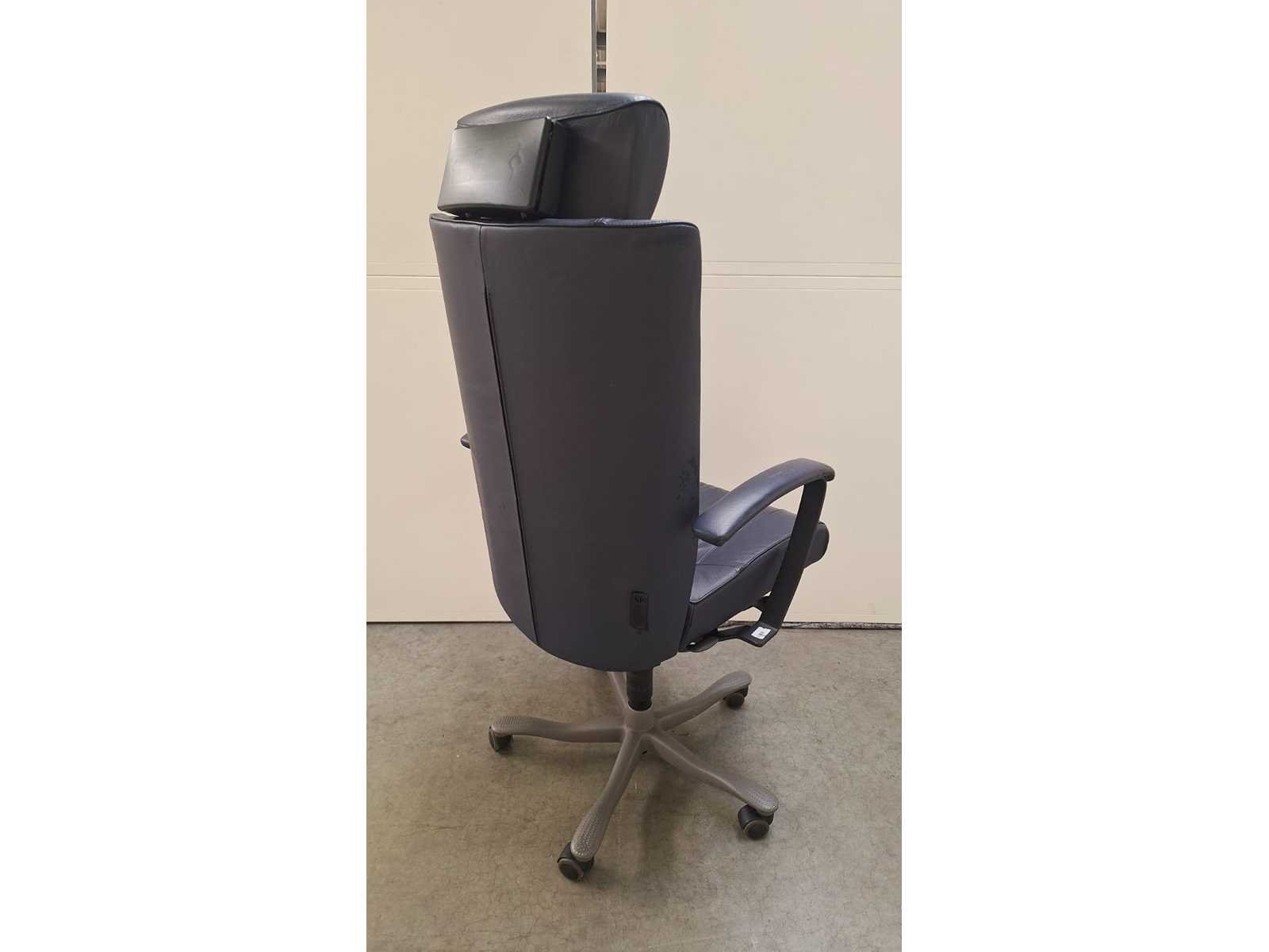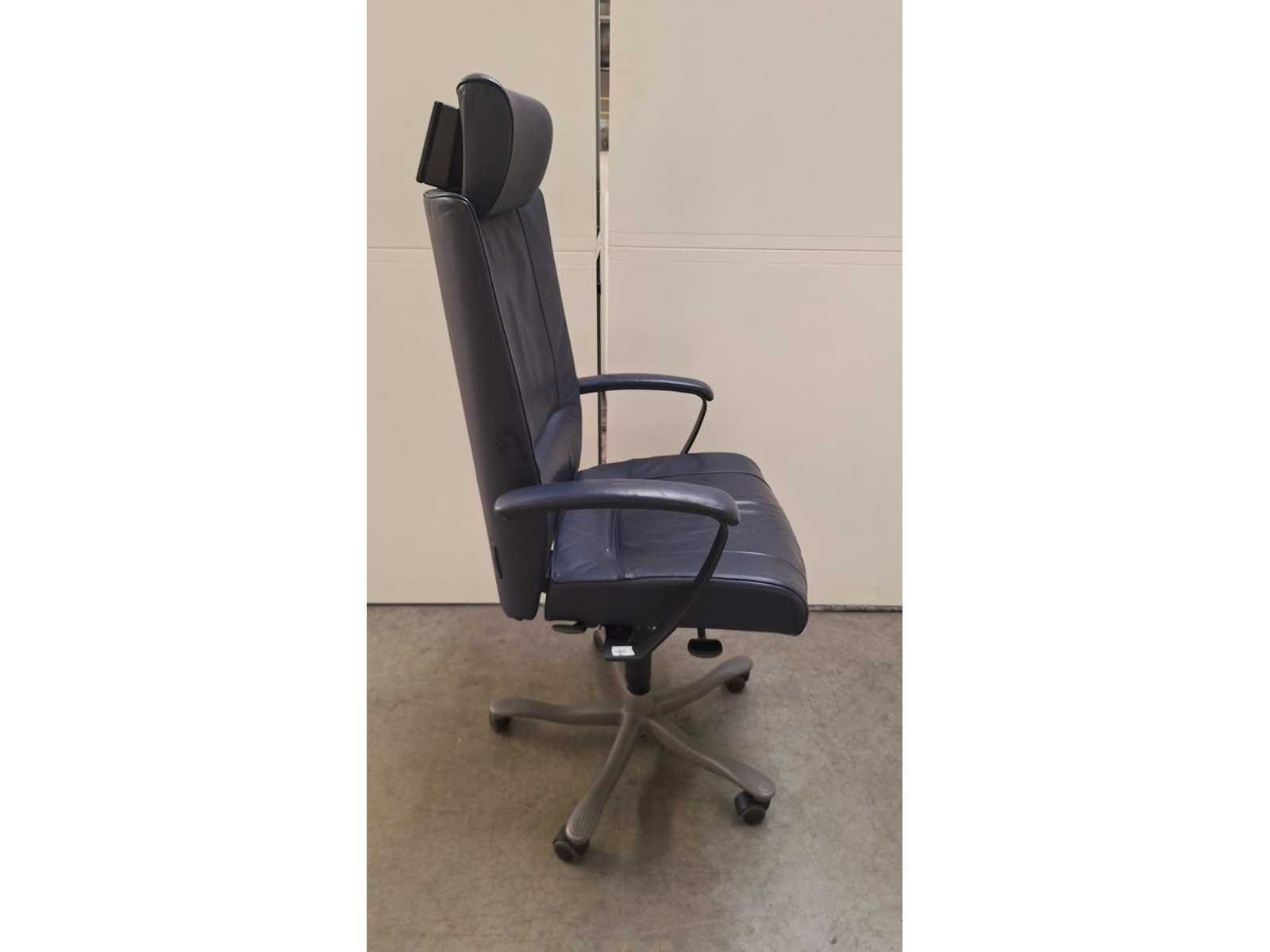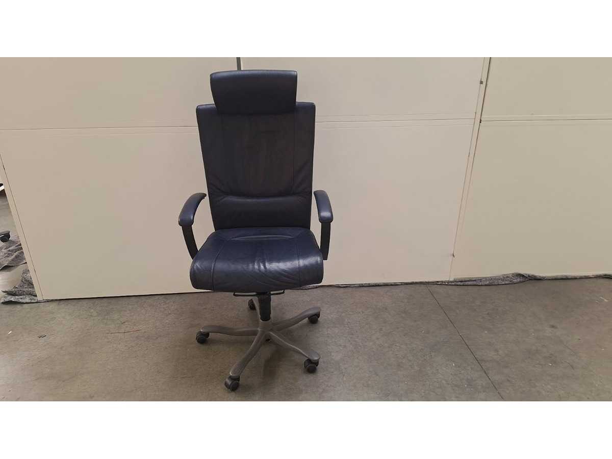 Stervoet in aluminium voorzien van PHD zwenkwielen (ook geschikt voor delicate ondergrond), bekleding in leder kleur donkerblauw, armleuningen bekleed met leder kleur donkerblauw, verstelbare hoofdsteun bekleed met leder kleur donkerblauw, in hoogte verstelbaar, freefloat/synchro mechanisme met gewichtsinstelling, zeer comfortabele ergonomische directie bureaustoel, in goede technische staat maar leder vertoont gebruikssporen (zie foto's) No Merk: Kinnarps Kleur: Blauw Gewicht: 50kg Lengte: 80cm Breedte: 80cm Hoogte: 120cm Diepte: 80cm Materiaal: metaal, kunststof, aluminium, leder