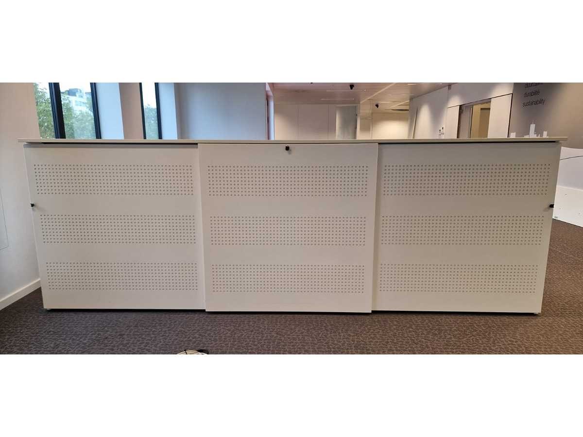 Kast volledig in metaal kleur Wit, schuifdeuren in metaal kleur Wit met akoestische schuimvulling kleur Zwart, top in melamine kleur Wit, gebruikssporen mogelijk, lichte verkleuring door UV inwerking, foto's indicatief. No Merk: Robberechts Kleur: Wit Gewicht: 175kg Breedte: 360cm Hoogte: 125cm Materiaal: Metaal, kunststof, hout, melamine Diepte: 47cm Aantal laden: 6