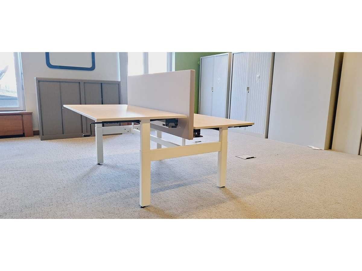 Apart in hoogte verstelbaar (620 - 820 mm) onderstel kleur Wit voorzien van kabelgoot, werkbladen in melamine kleur lichte Eik, inclusief scheidingswand kleur antraciet, lichte gebruikssporen mogelijk, onderstel vertoont verkleuring door UV inwerking, foto's indicatief No Merk: Ahrend Type: Four Two Kleur: Wit - Lichte Eik Gewicht: 600kg Breedte: 160cm Hoogte: 100cm Materiaal: Metaal, kunststof, hout, melmaine Diepte: 170cm