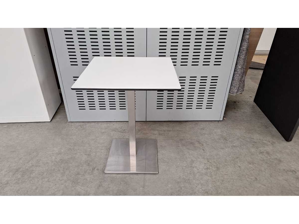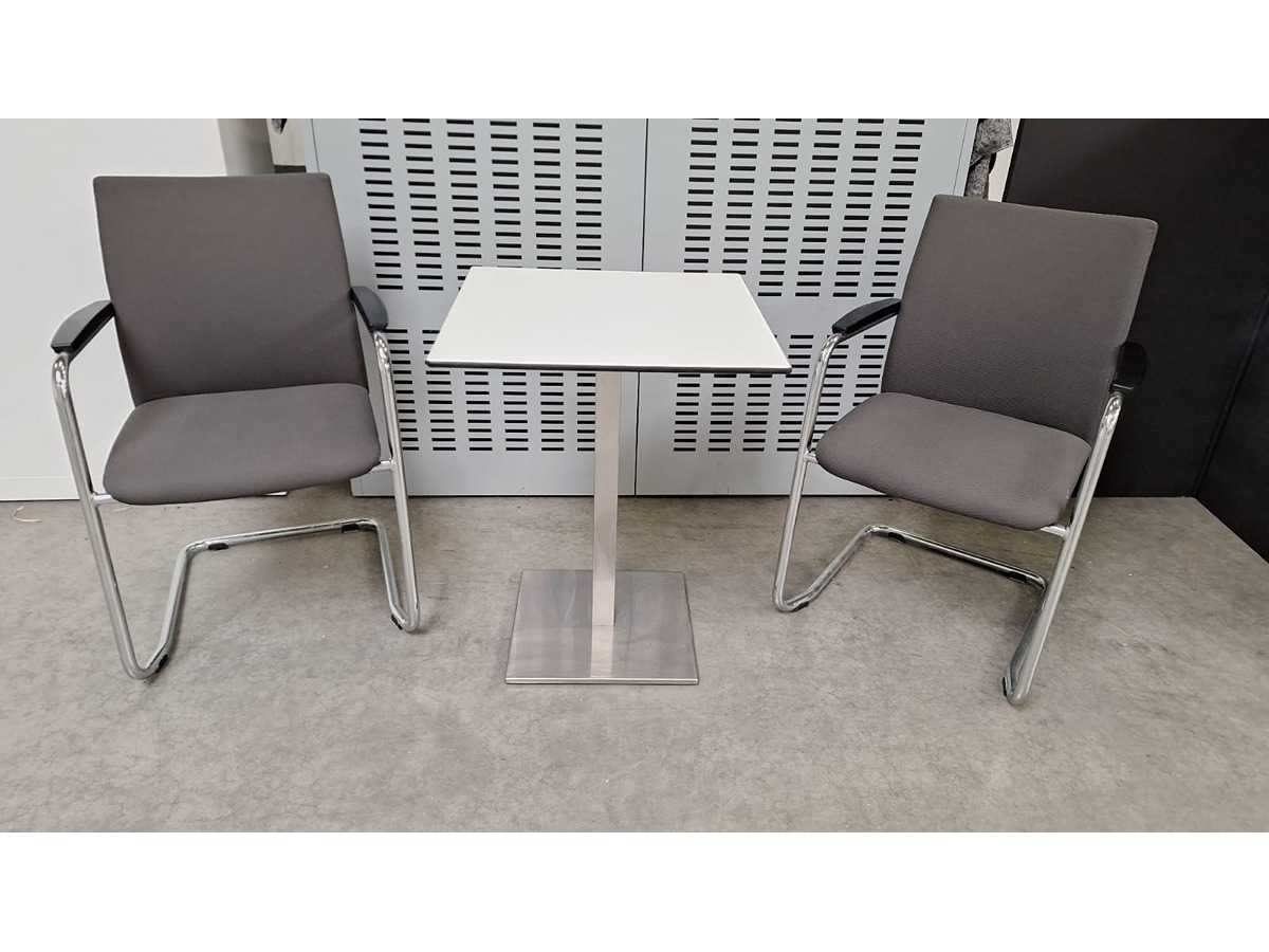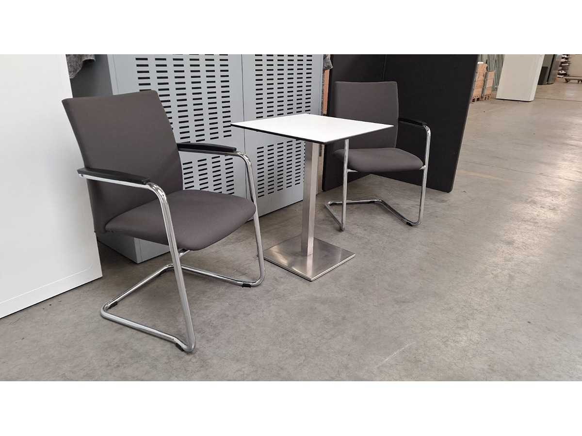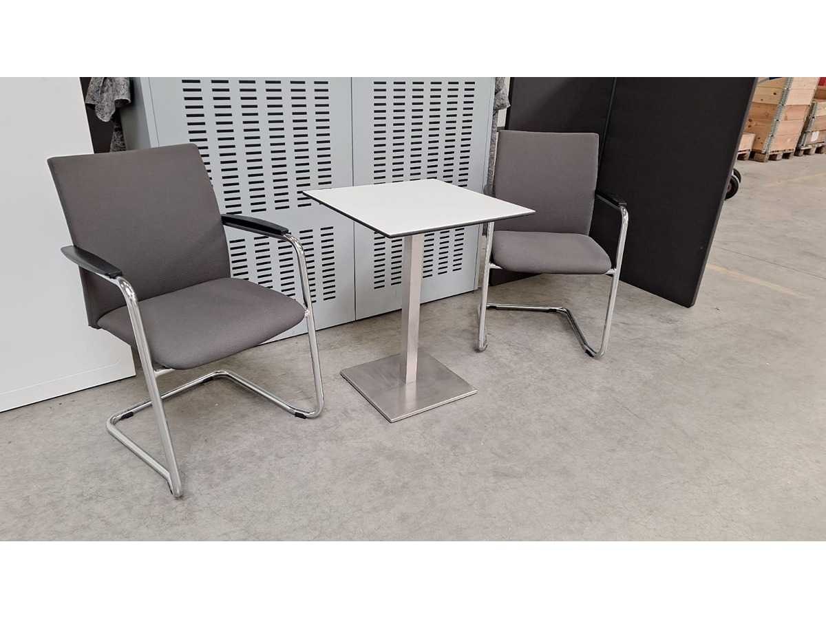 Vergadertafel Pedrali 590 x 590 x 750 mm ( l x d x h) onderstel in metaal hoogglans verchroomd, werkblad in volkern kleur Wit + 2 stuks vergaderstoel Haworth, slede onderstel in metaal hoogglans verchroomd, bekleding in stof kleur Antraciet, armleuningen in kunststof kleur Zwart No Merk: Pedrali - Haworth Kleur: chroom - wit - antraciet Gewicht: 60kg