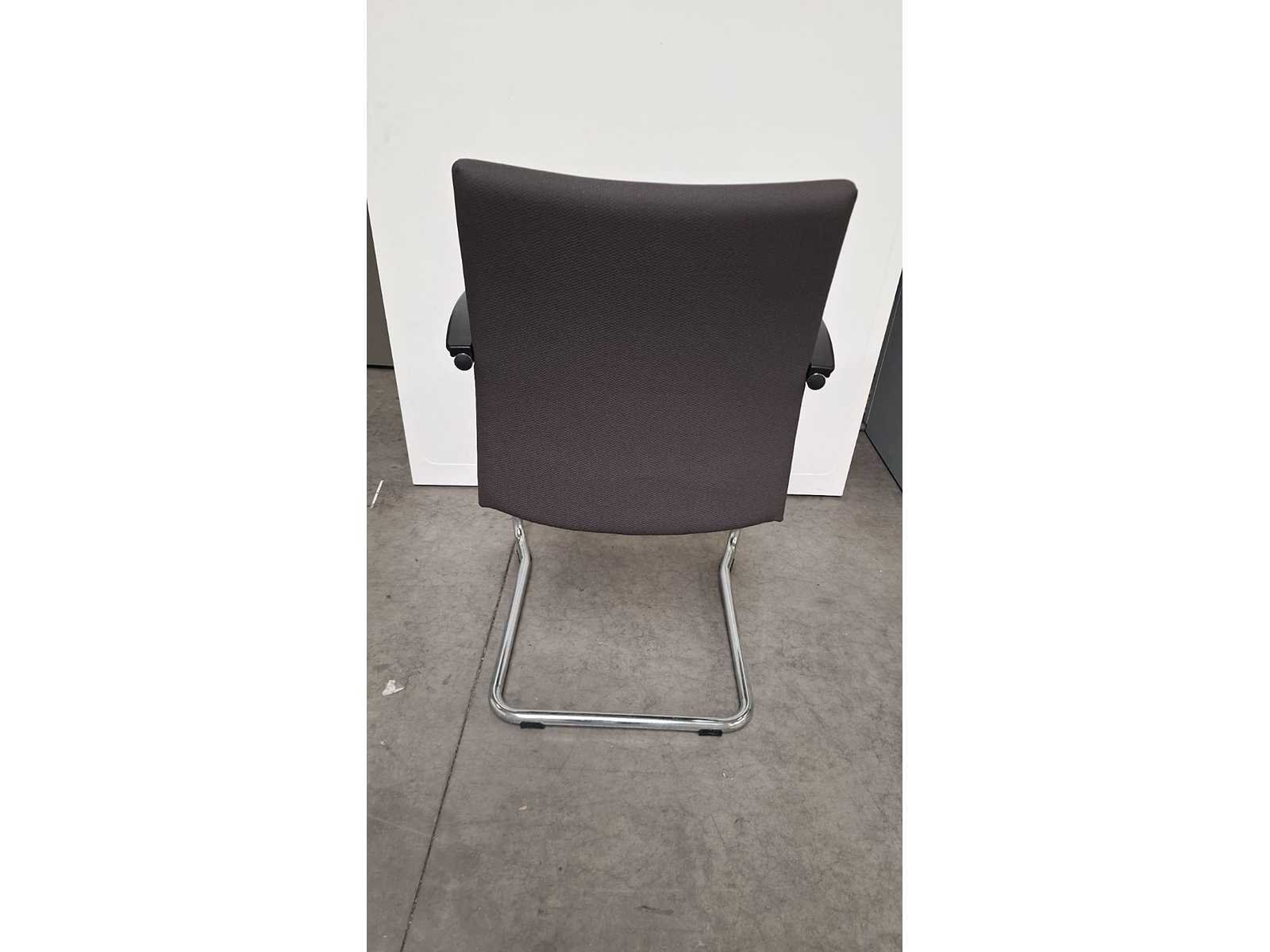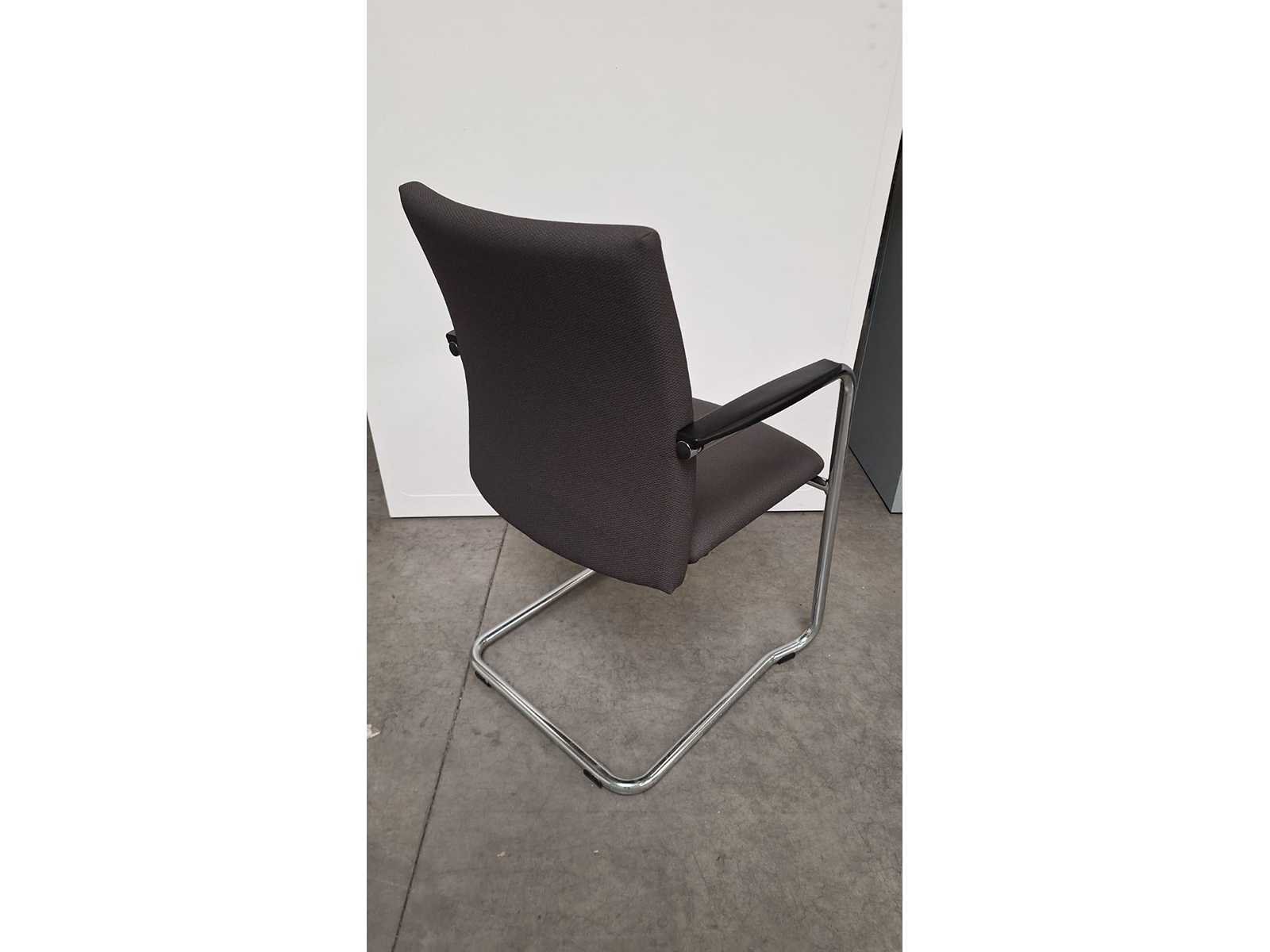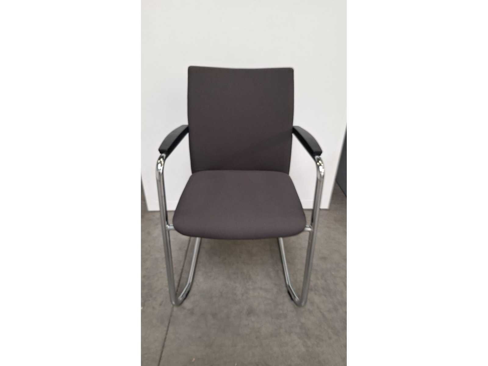 Vergadertafel Pedrali 590 x 590 x 750 mm ( l x d x h) onderstel in metaal hoogglans verchroomd, werkblad in volkern kleur Wit + 2 stuks vergaderstoel Haworth, slede onderstel in metaal hoogglans verchroomd, bekleding in stof kleur Antraciet, armleuningen in kunststof kleur Zwart No Merk: Pedrali - Haworth Kleur: chroom - wit - antraciet Gewicht: 60kg