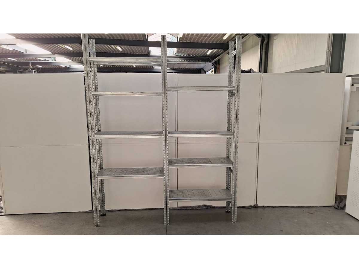 Volledig gegalvaniseerd metalen rek, 3 staander + 8 leggers, goede staat No Kleur: grijs Gewicht: 50kg Breedte: 190cm Hoogte: 240cm Diepte: 33cm Materiaal: metaal - galvanise