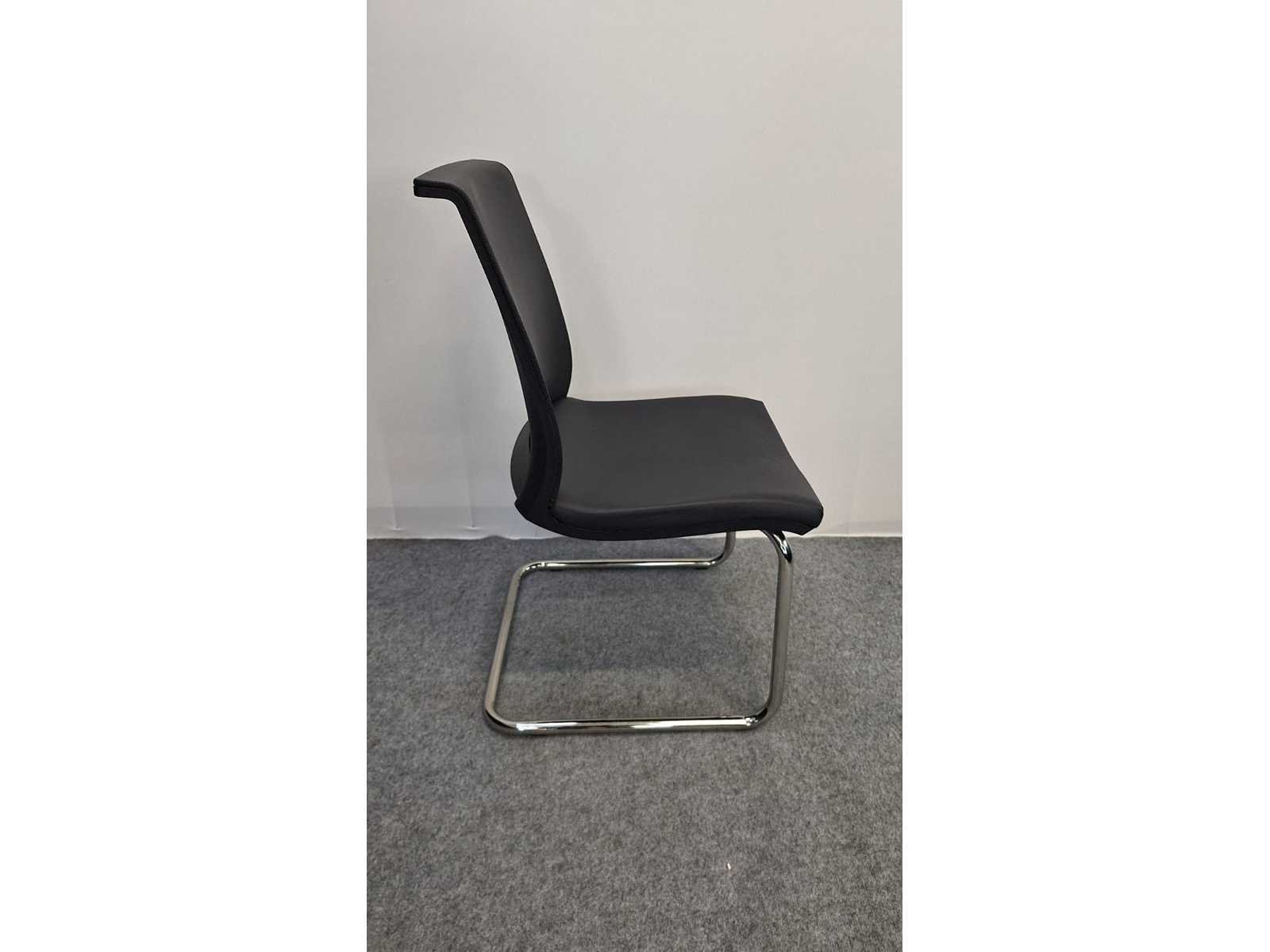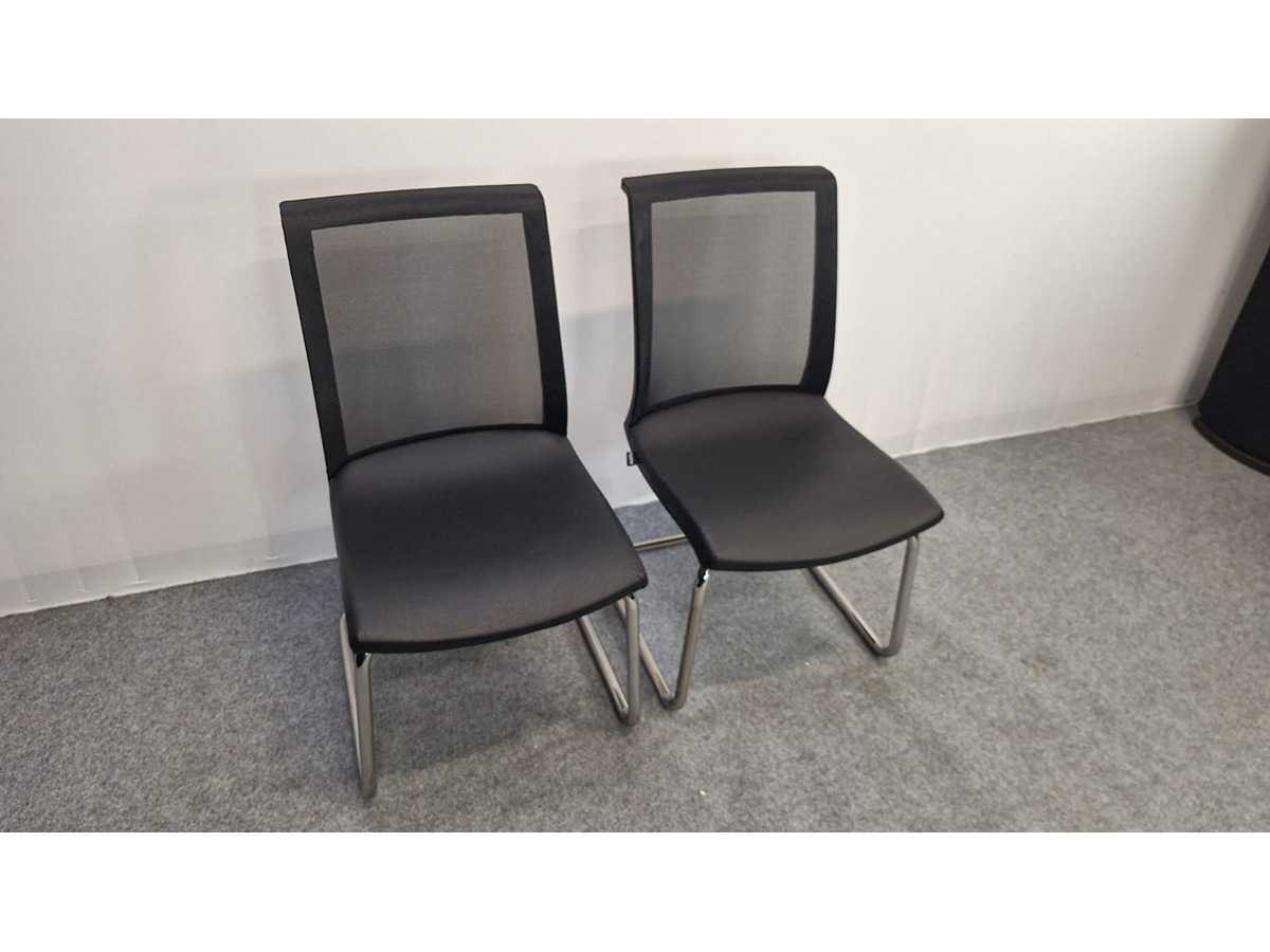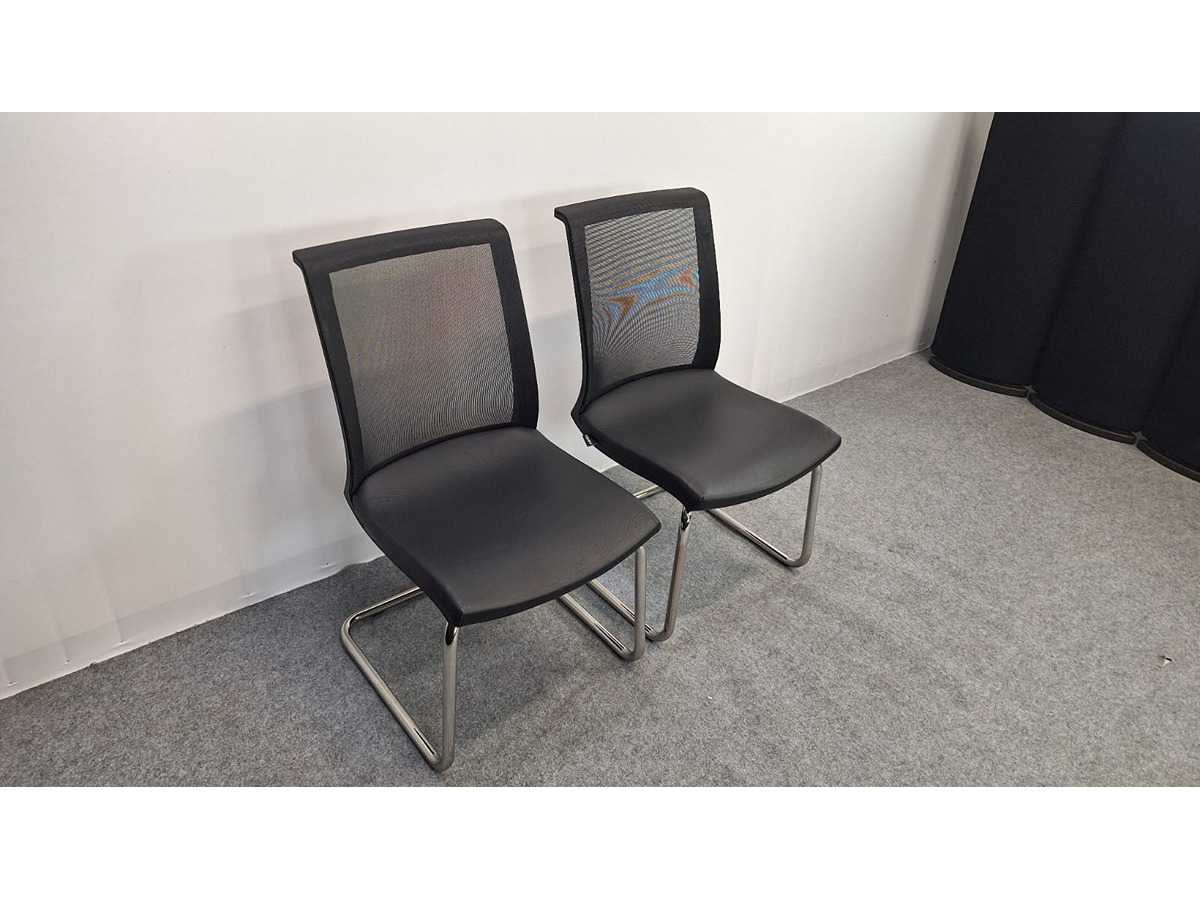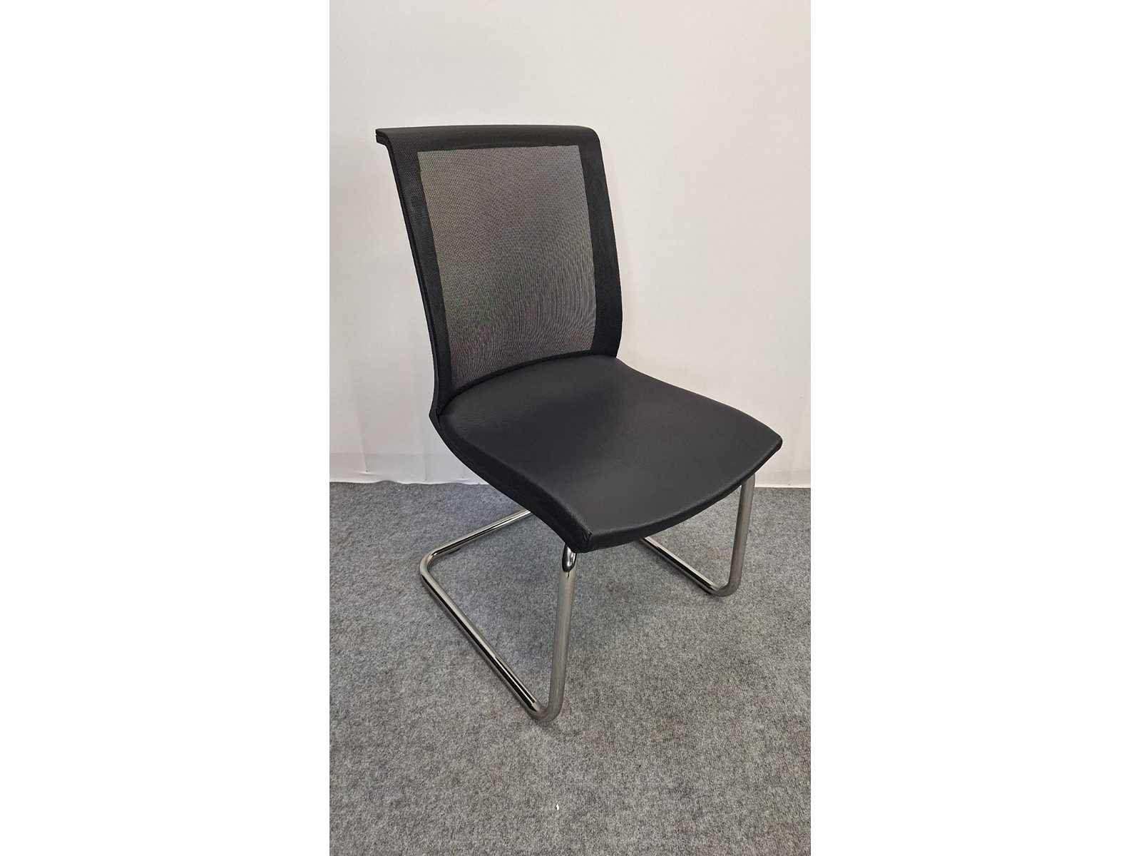 Slede onderstel in metaal hoogglans verchroomd, zitting in stof kleur Zwart, rugleuning in netweave kleur Zwart, in zeer goede staat No Merk: Narbutas Kleur: Chroom - Zwart Materiaal: Metaal, kunststof, stof Zithoogte: 43cm Hoogte: 80cm Breedte: 50cm Diepte: 50cm Gewicht: 25kg
