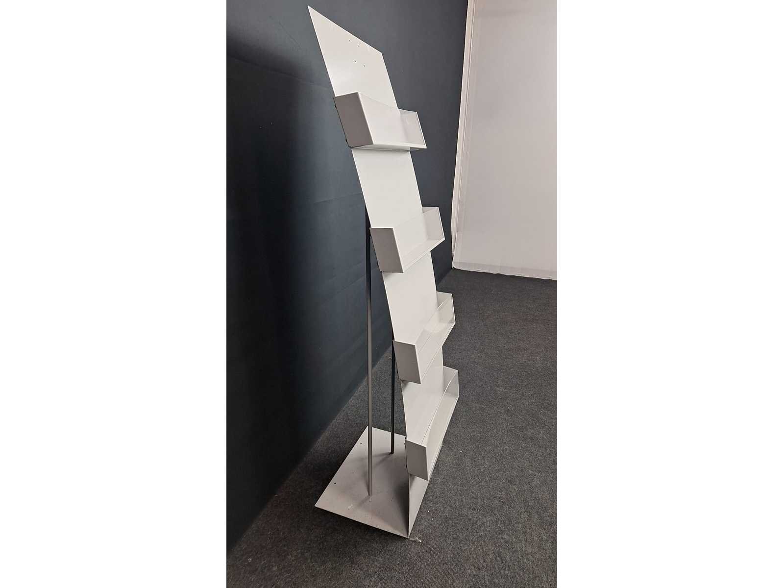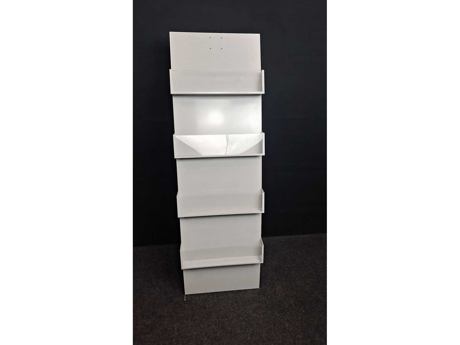 Folder voorzien van 4 houders in kunststof, lichte gebruikssporen mogelijk No Kleur: Alugrijs Gewicht: 30kg Breedte: 48cm Hoogte: 150cm Diepte: 35cm Materiaal: Metaal, kunststof