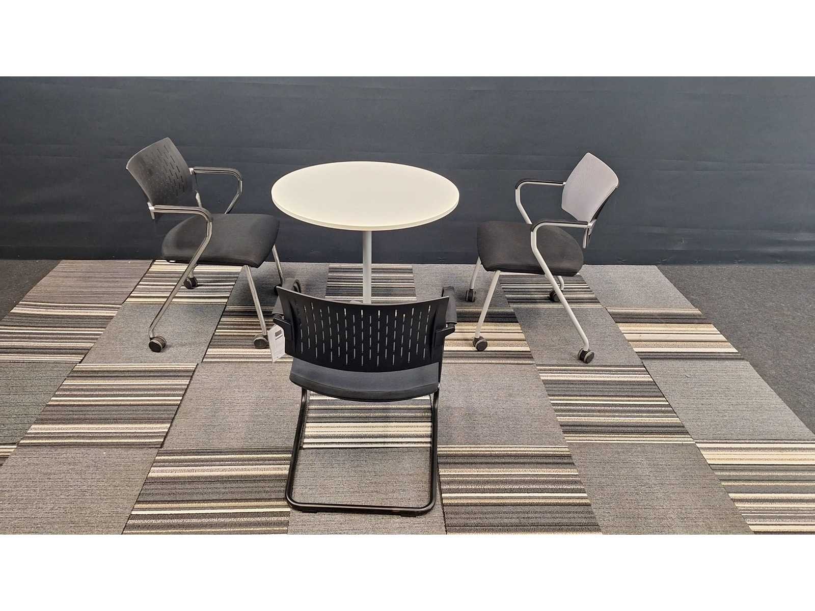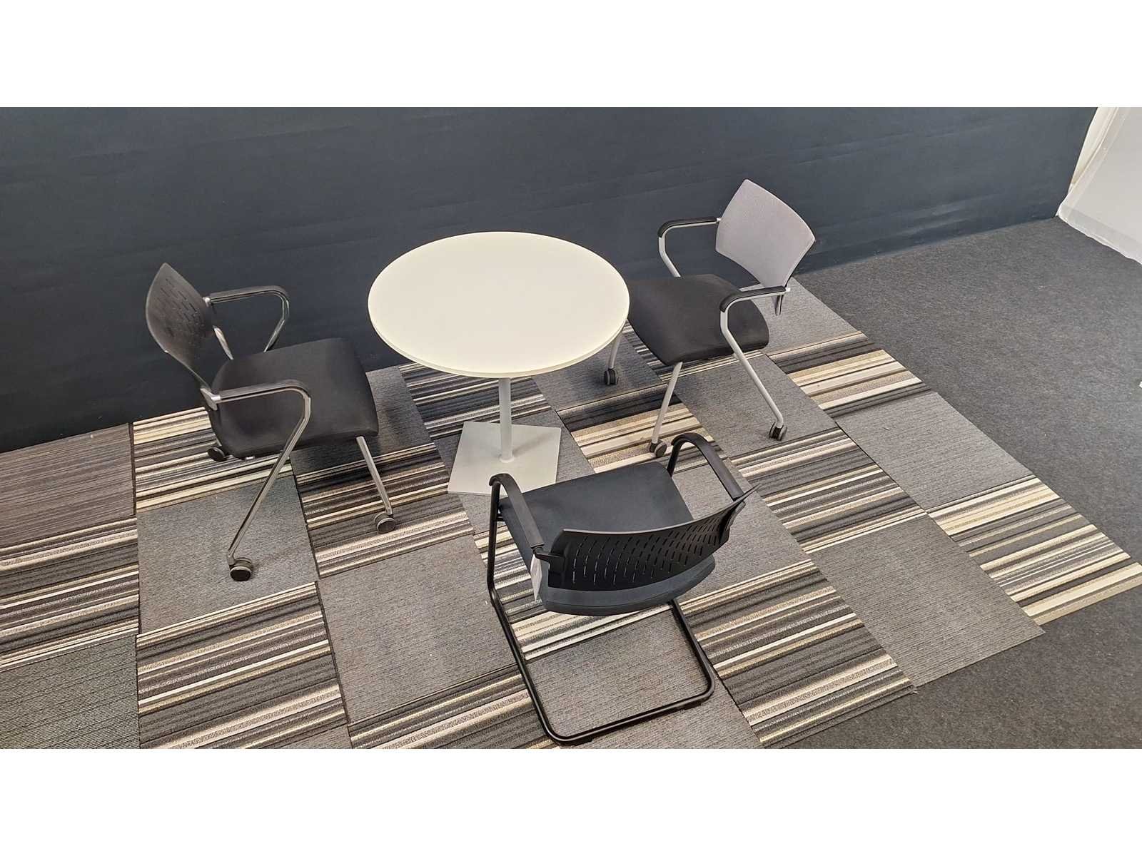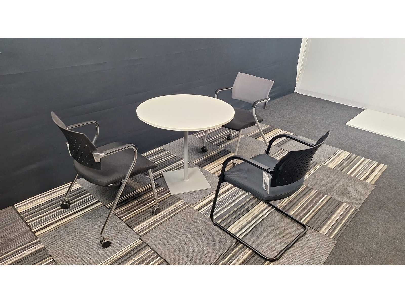 Vergaderset bestaande uit 1 vergadertafel diameter 800 mm + 3 verschillende toonzaal modellen vergadertafelstoelen, prima staat No Merk: BENE - NN Kleur: Wit-alu