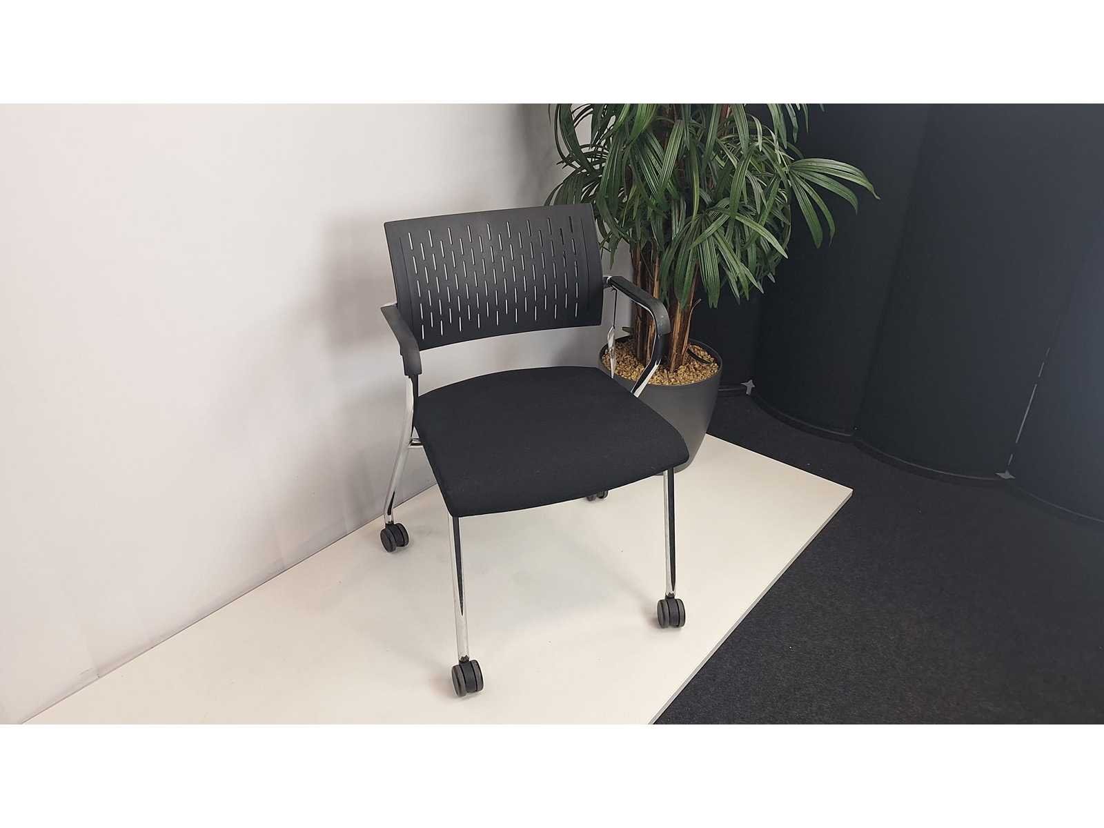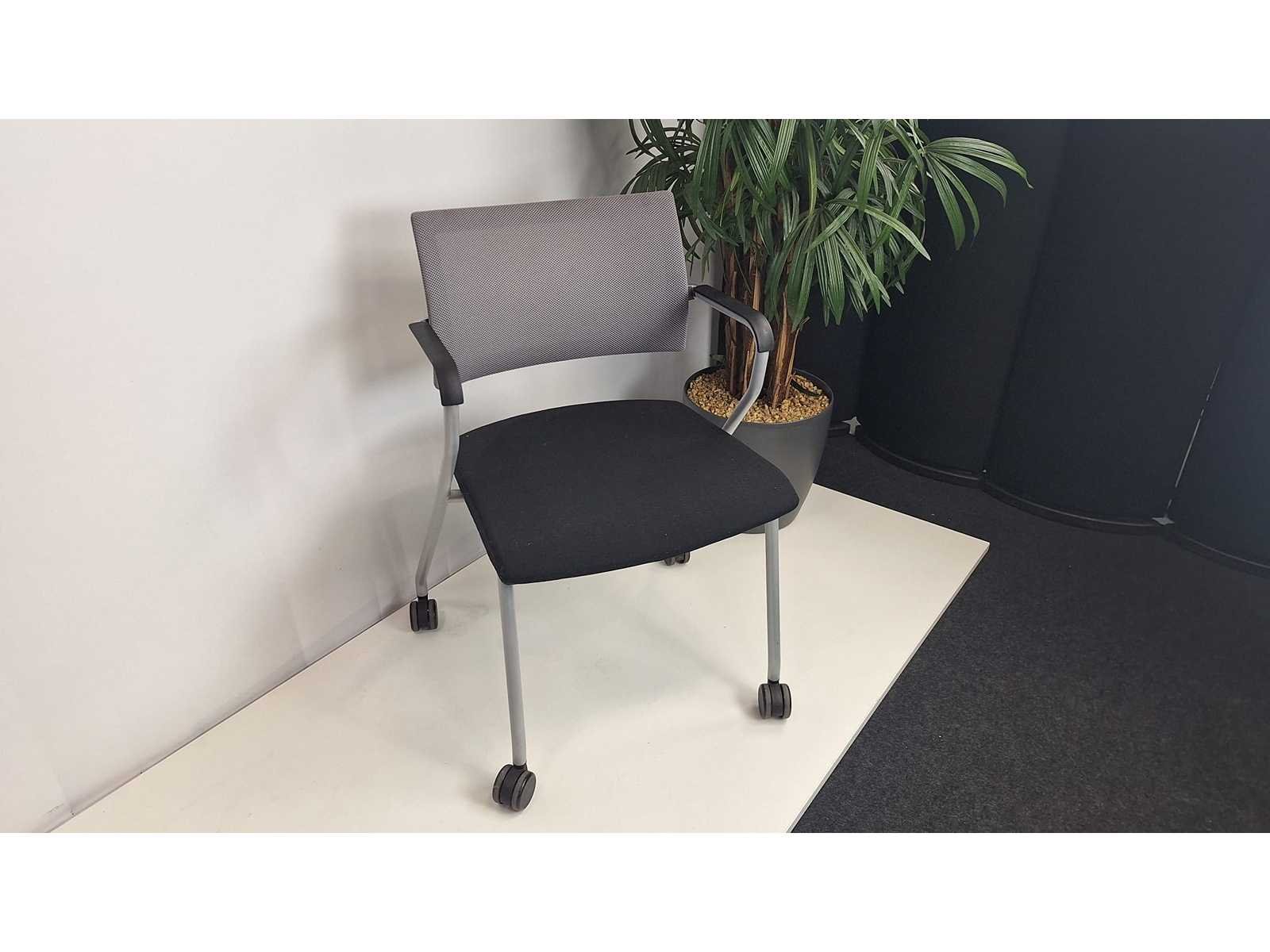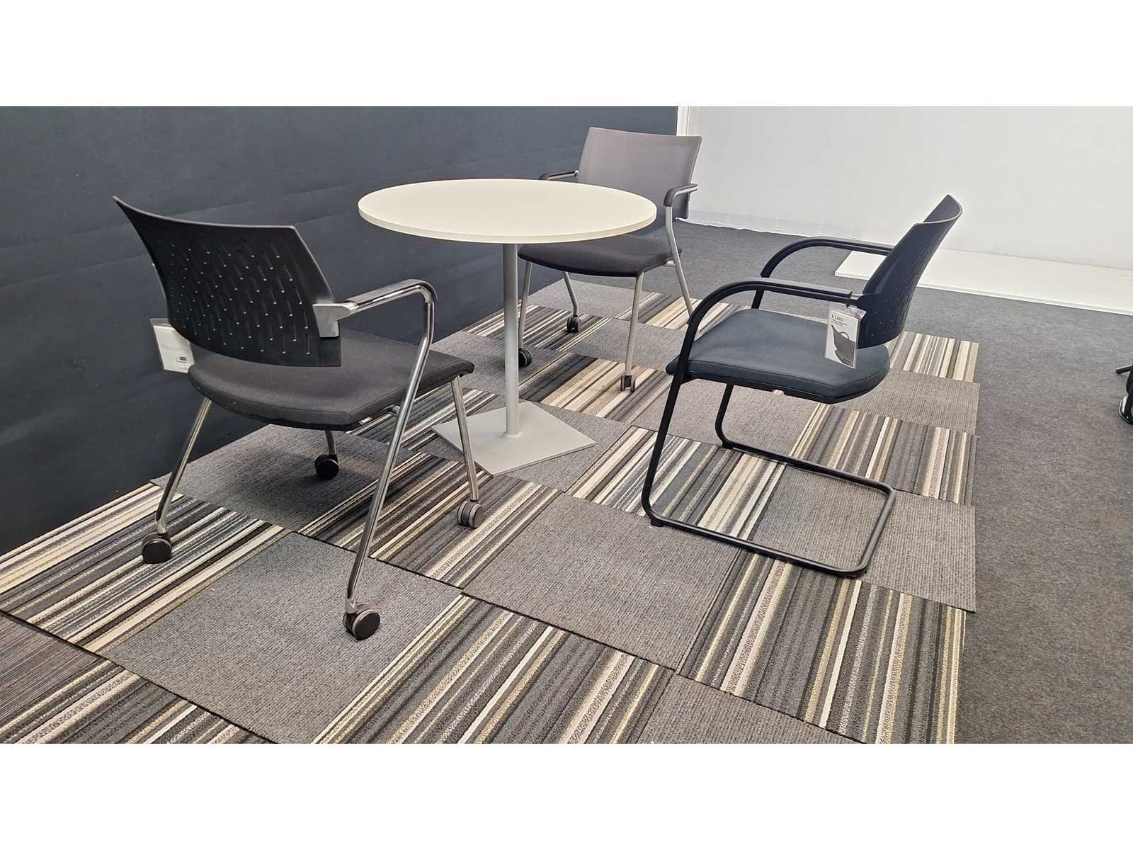 Vergaderset bestaande uit 1 vergadertafel diameter 800 mm + 3 verschillende toonzaal modellen vergadertafelstoelen, prima staat No Merk: BENE - NN Kleur: Wit-alu