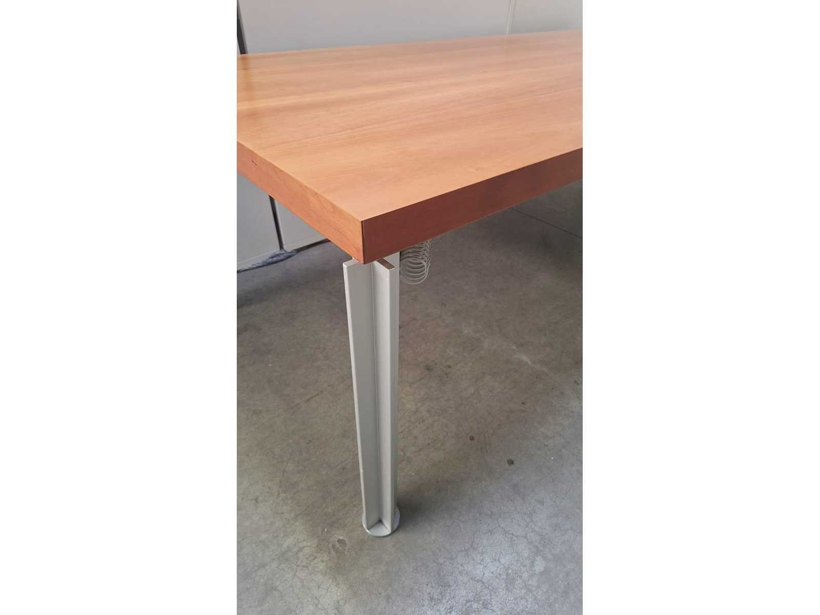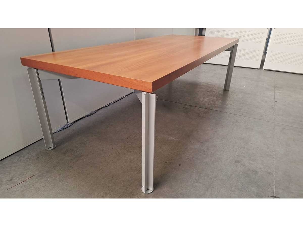 Massief blad afgewerkt met kersfineer, onderstel in aluminium in hoogte verstelbaar, blad vertoont lichte gebruikssporen (zie foto's) No Merk: BULO Type: H2O Kleur: alu-kers Gewicht: 100kg Lengte: 240cm Hoogte: 65-80cm Materiaal: Metaal, aluminium, kunststof, hout Diepte: 1000cm