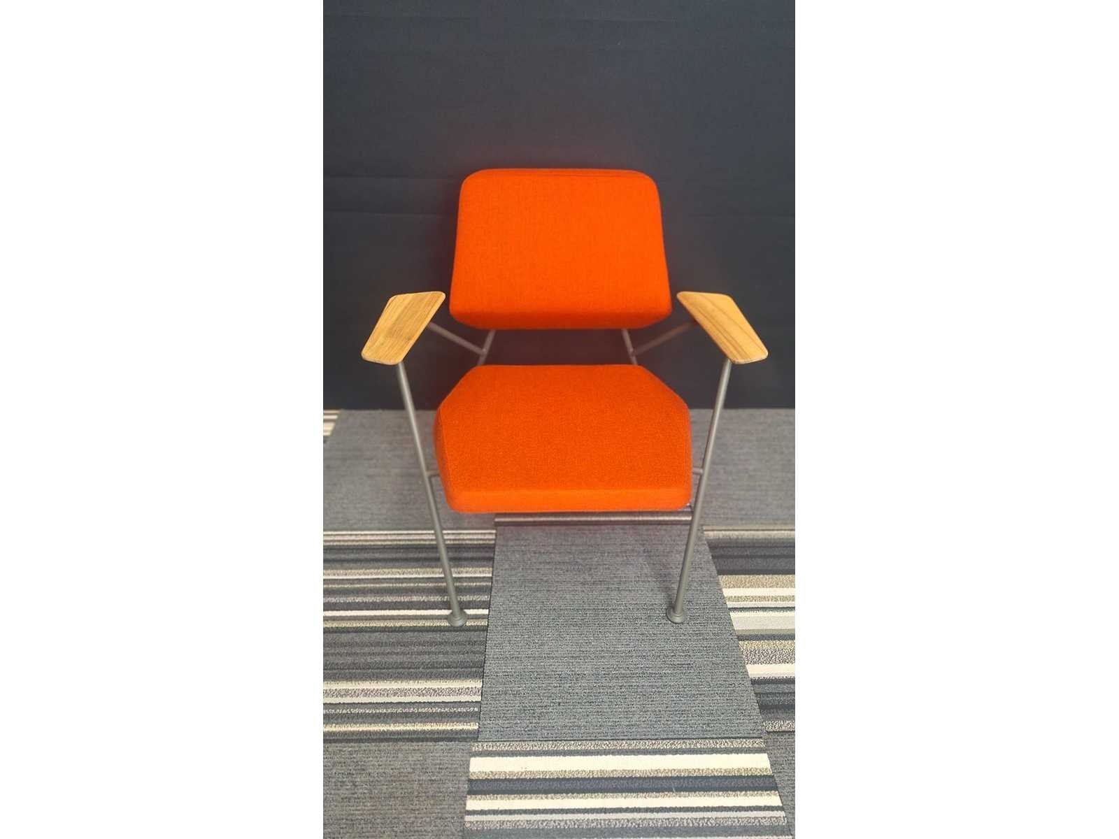 Vierpoots onderstel in metaal kleur mat alu, bekleding in stof kleur Oranje/Rood, armleuningen in lichte Eik, in zeer goede staat No Merk: Prosotria Zithoogte: 40cm Hoogte: 75cm Breedte: 72cm Diepte: 66cm Gewicht: 25kg