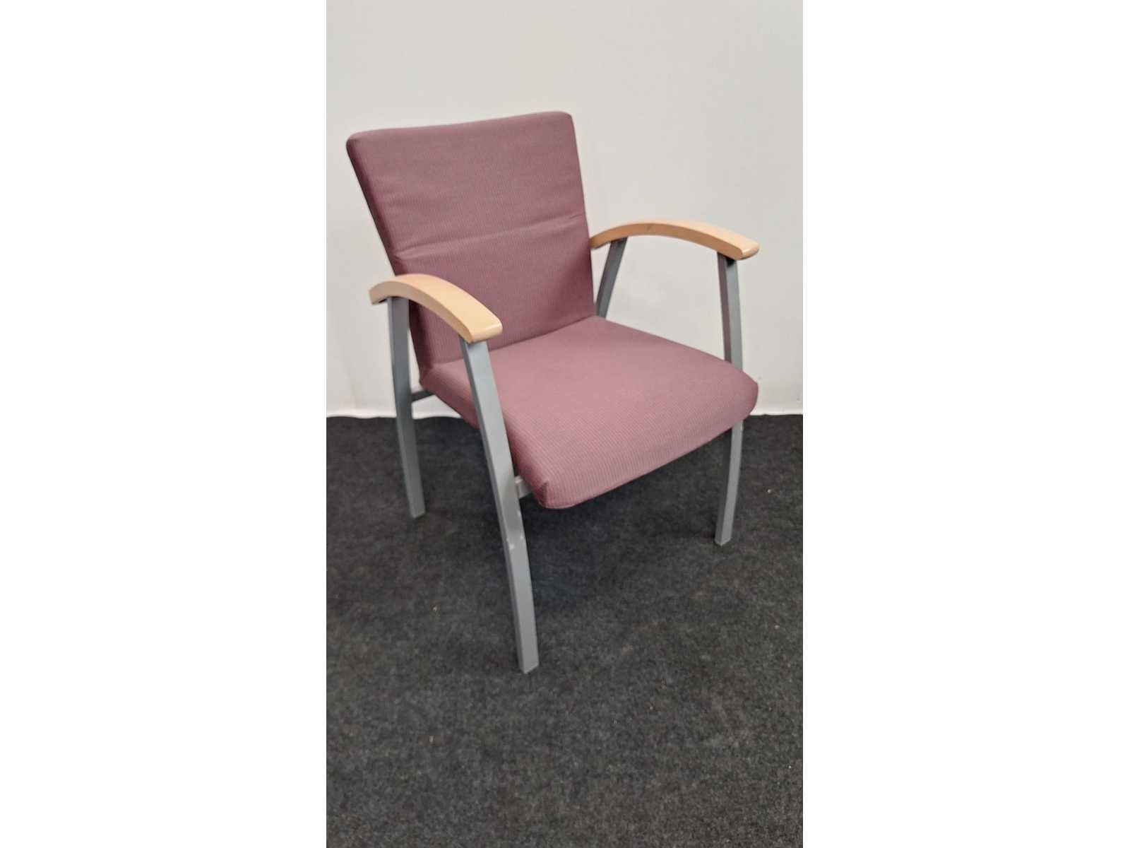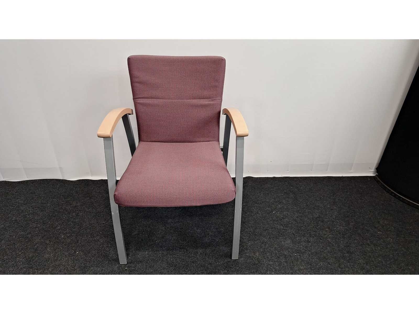Vierpootsonderstel in metaal kleur alu, bekleding in stof kleur bordeauxrood, armleuningen in hout, lichte gebruikssporen aanwezig, foto's indicatief No Merk: Kinnarps Kleur: alu-rood Zithoogte: 43cm Hoogte: 100cm Breedte: 70cm Diepte: 70cm Gewicht: 40kg