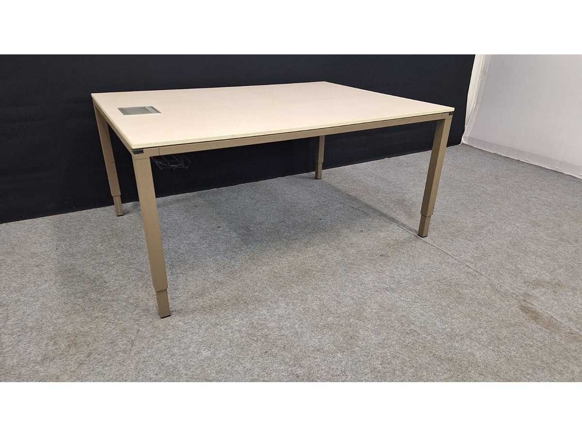 In hoogte verstelbaar onderstel kleur Antraciet, blad in melamine kleur Ahorn, voorzien van elektrificatie, goede staat, foto's indicatief No Merk: Ahrend Kleur: Antraciet - Ahorn Gewicht: 40kg Lengte: 160cm Hoogte: 62-82cm Materiaal: Metaal, kunststof, hout, melamine Diepte: 120cm