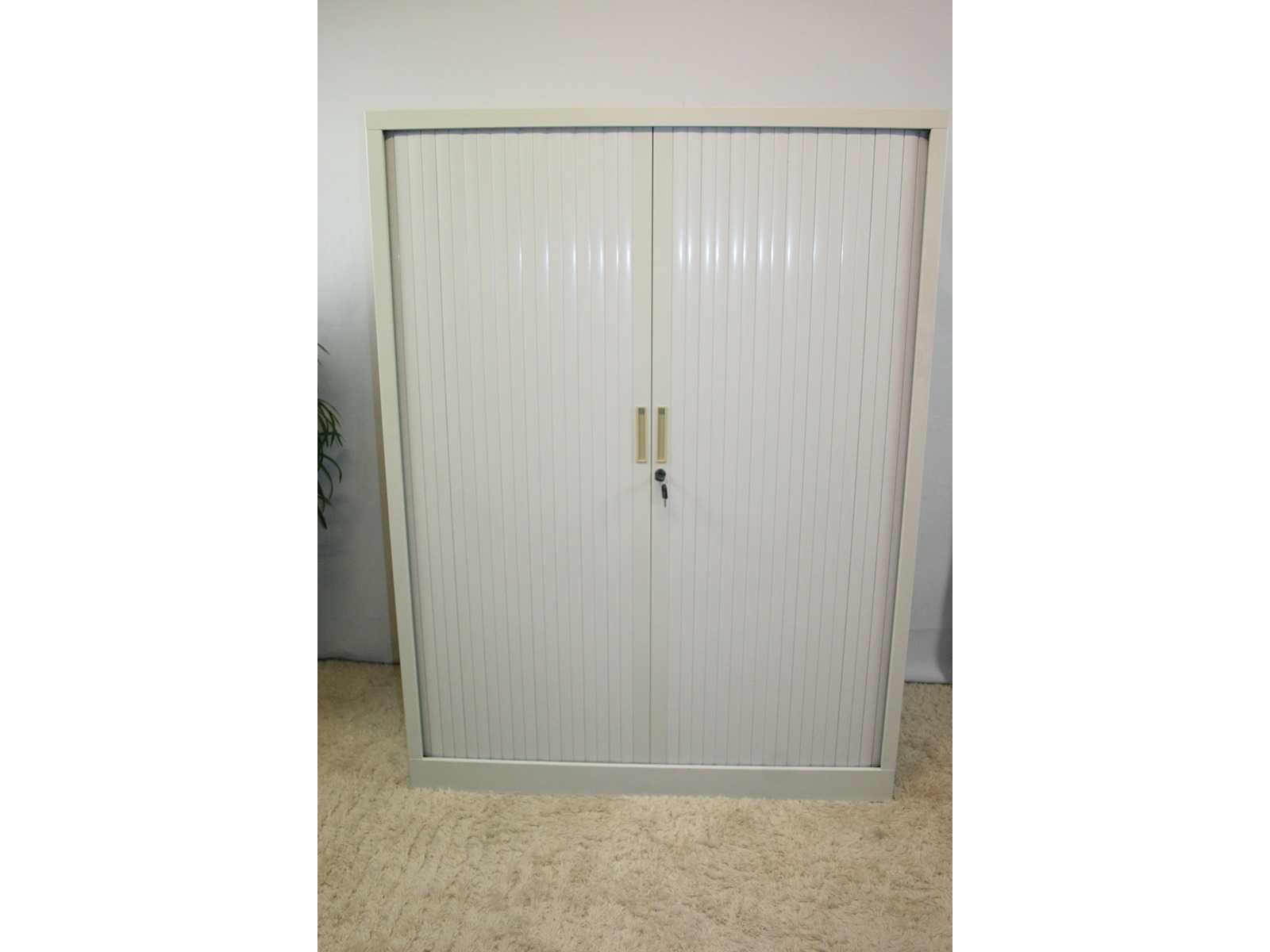 Kast volledig in metaal kleur grijs, roldeuren in kunststof kleur grijs, uitgerust met 3 legplanken in metaal kleur grijs, lichte gebruikssporen, sleutel niet gegarandeerd No Merk: Robberechts Kleur: Grijs Gewicht: 50kg Breedte: 120cm Hoogte: 160cm Materiaal: Metaal, kunststof, aluminium Diepte: 45cm Aantal laden: 3