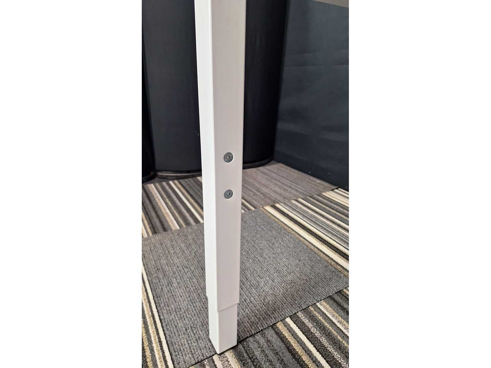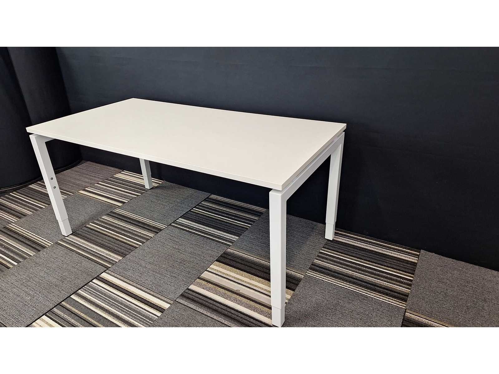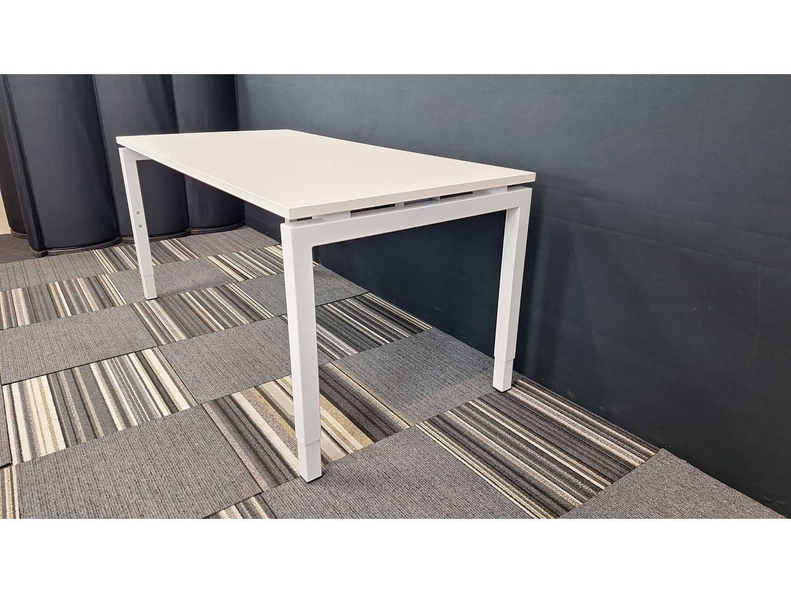 In hoogte verstelbaar (620 - 820 mm) onderstel in metaal kleur Wit, werkblad in melamine kleur Wit, toonzaal model in zeer goede staat No Merk: Orange Kleur: Wit Gewicht: 40kg Breedte: 160cm Hoogte: 62-82cm Materiaal: Metaal, kunststof, hout, melamine Diepte: 80cm