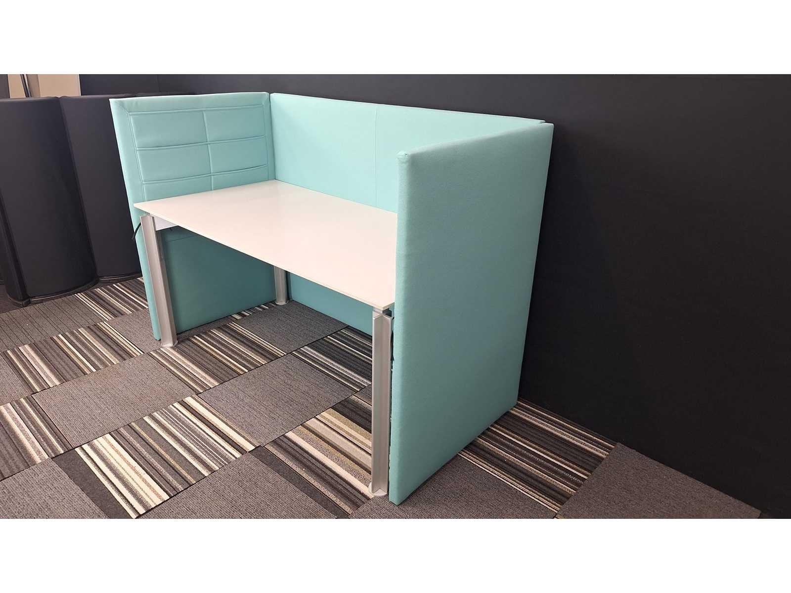 Bureau BULO H2O in hoogte verstelbaar (650 - 800 mm) onderstel in aluminium, blad in HDPE kleur Alu-decor, akoestisch privacy scherm bekleed met stof kleur Turquoise, in zeer goede staat enkel lichte gebruikssporen op werkblad No Merk: BULO Type: H2O Kleur: Grijs-Alu-Turqoise Gewicht: 100kg Lengte: 160cm Hoogte: 65-80cm Materiaal: Metaal, aluminium, hout, kunststof, melamine, stof Diepte: 80cm