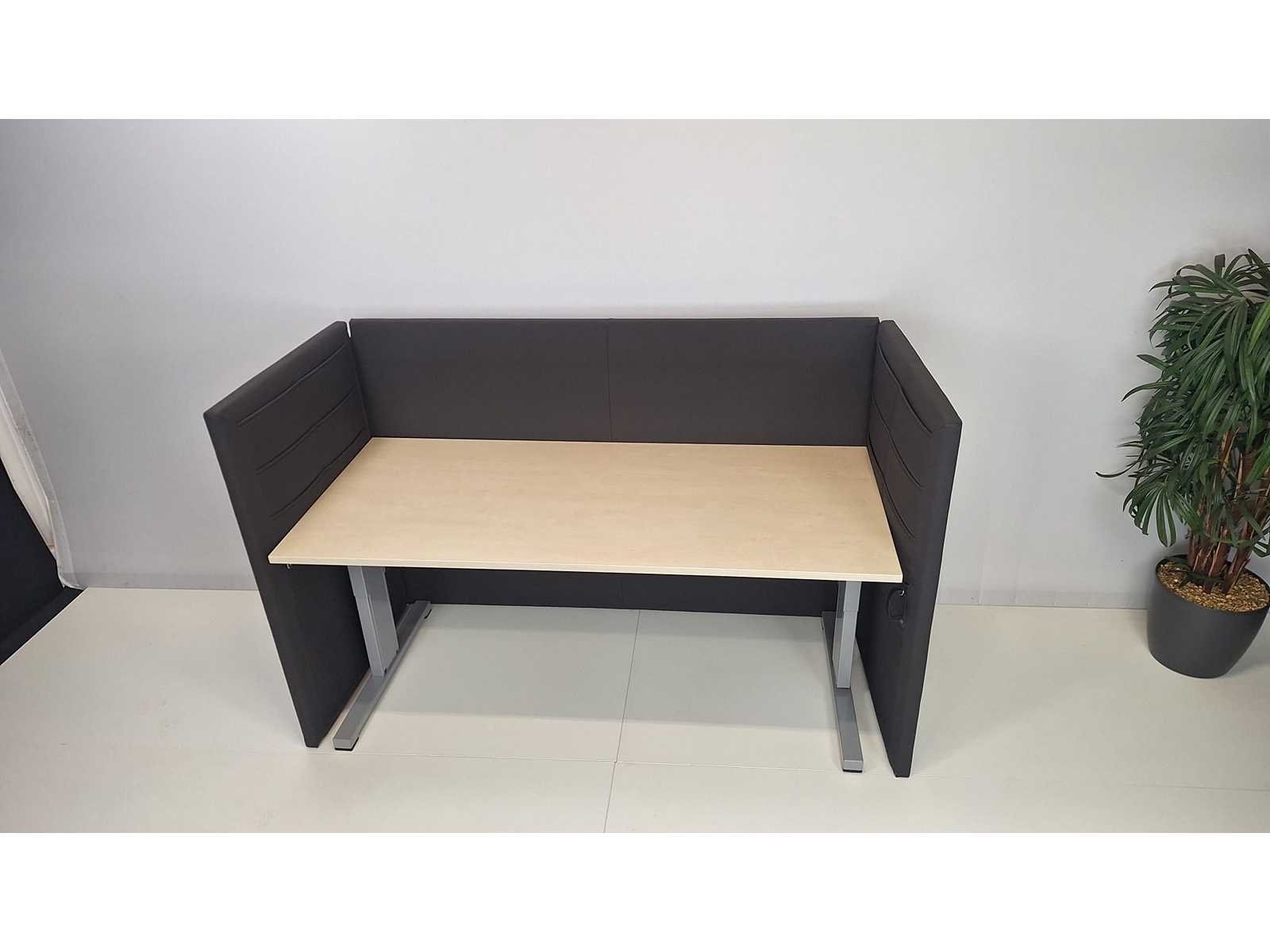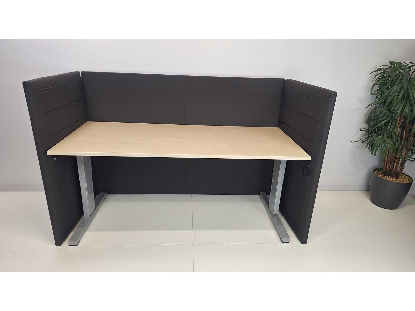 Bureau Pami, in hoogte verstelbaar (620 - 820 mm) onderstel in metaal kleur Alu, blad in melamine kleur Ahorn, akoestisch privacy scherm bekleed met stof kleur Antraciet, in zeer goede staat No Merk: Pami Kleur: Grijs-Alu-Turqoise Gewicht: 100kg Lengte: 180cm Hoogte: 62-82cm Materiaal: Metaal, aluminium, hout, kunststof, melamine, stof Diepte: 80cm