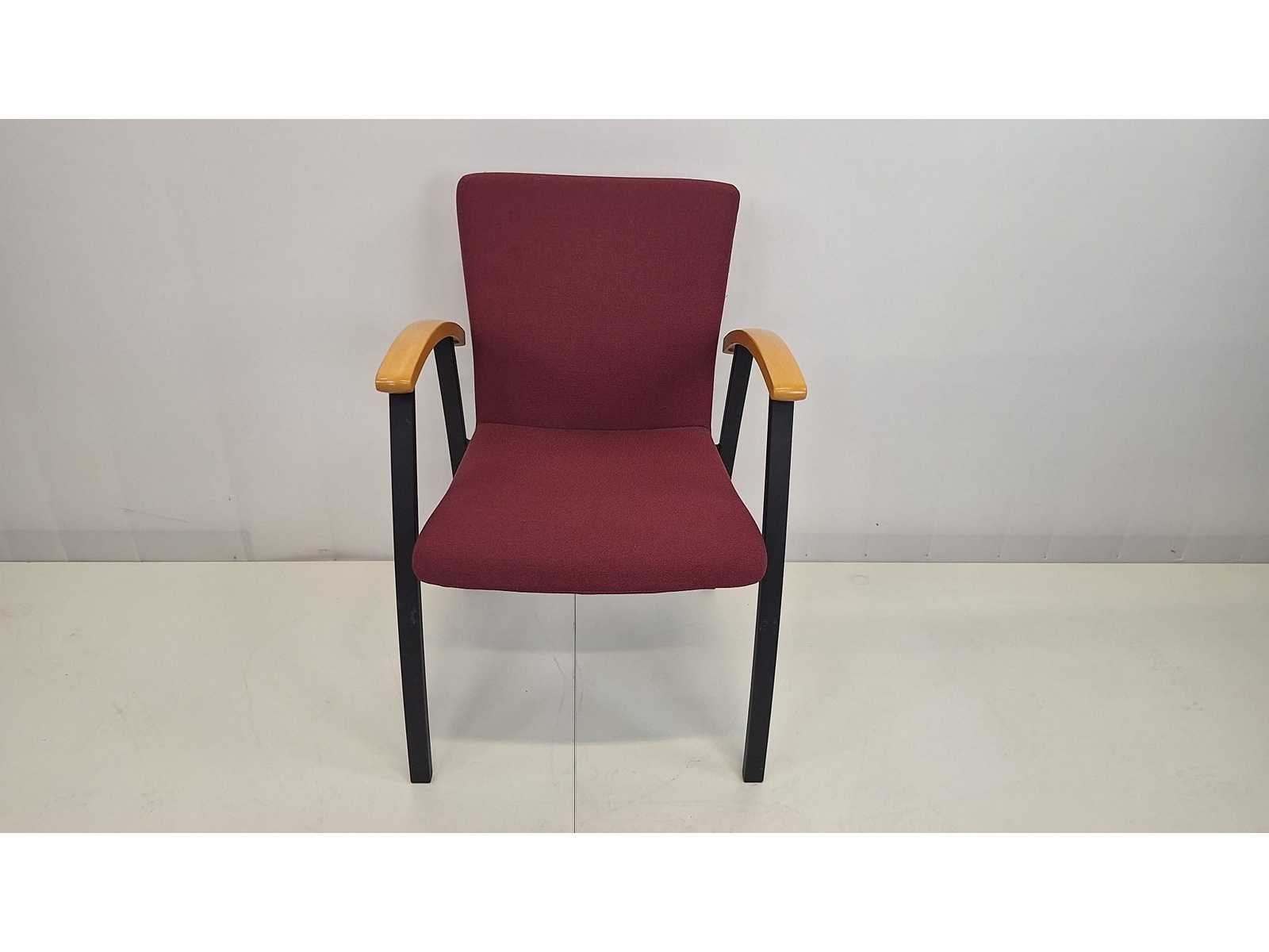 Stapelbaar vierpoots onderstel in metaal kleur zwart, zitting en rugleuning bekleed met stof bordeauxrood gestreept, armleuningen in natuurlijk hout, stapelbaar, zeer goede staat No Merk: Kinnarps Kleur: Zwart - Rood - Grijs - Hout Materiaal: metaal, stof, hout, kunststof Gewicht: 75kg