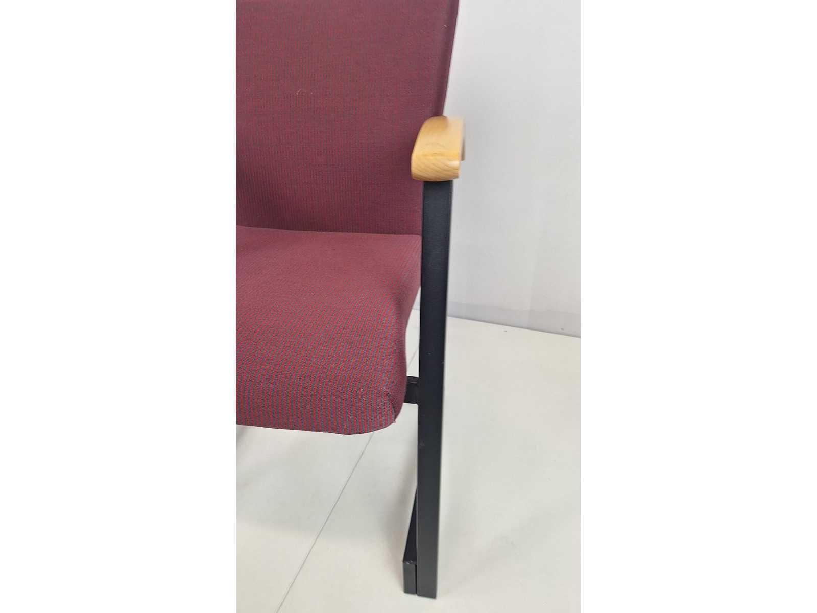 Stapelbaar vierpoots onderstel in metaal kleur zwart, zitting en rugleuning bekleed met stof kleur bordeauxrood/antraciet gestreept, armleuningen in natuurlijk hout, stapelbaar, lichte gebruikssporen mogelijk foto's indicatief No Merk: Kinnarps Kleur: Zwart - Rood - Grijs - Hout Materiaal: metaal, stof, hout, kunststof Gewicht: 75kg