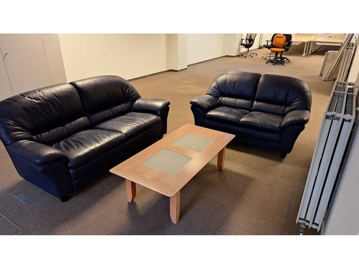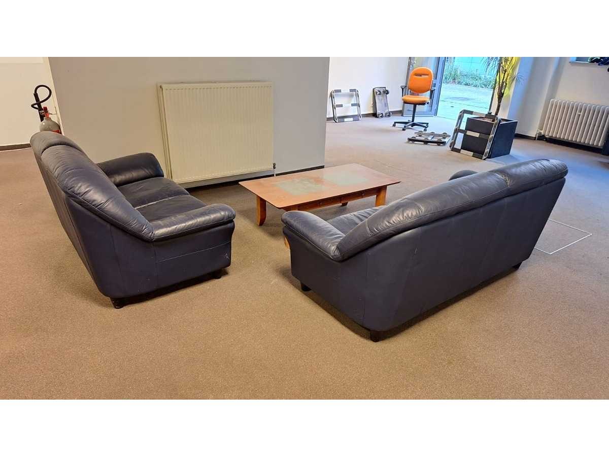Complete zithoek in kunstleder kleur Blauw, 3 zits afm. 1900 x900 x 900 mm + 2 zits afm. 1500 x900 x 900 mm + salontafel 1300 x 650 mm, goede staat No Kleur: Blauw-hout Gewicht: 150kg Lengte: 300cm Breedte: 200cm Hoogte: 900cm Materiaal: hout, glas, kunstleder