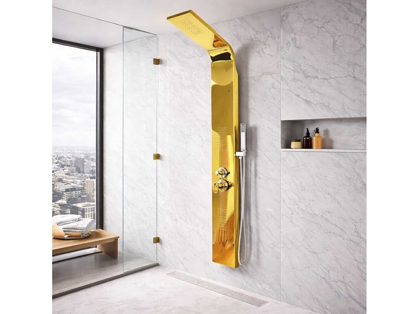 Douchezuil - Kleur: Gold- Materiaal: Aluminium - Hoogte 145cm x Breedte 20cm - Waterjetvlakken - Flexibel en handdouche (150cm) - Regendouche - Mixer, richtingsventiel - MS02-Gold Bezorgtermijn 1 dag Merk: Lavinno Kleur: Gold