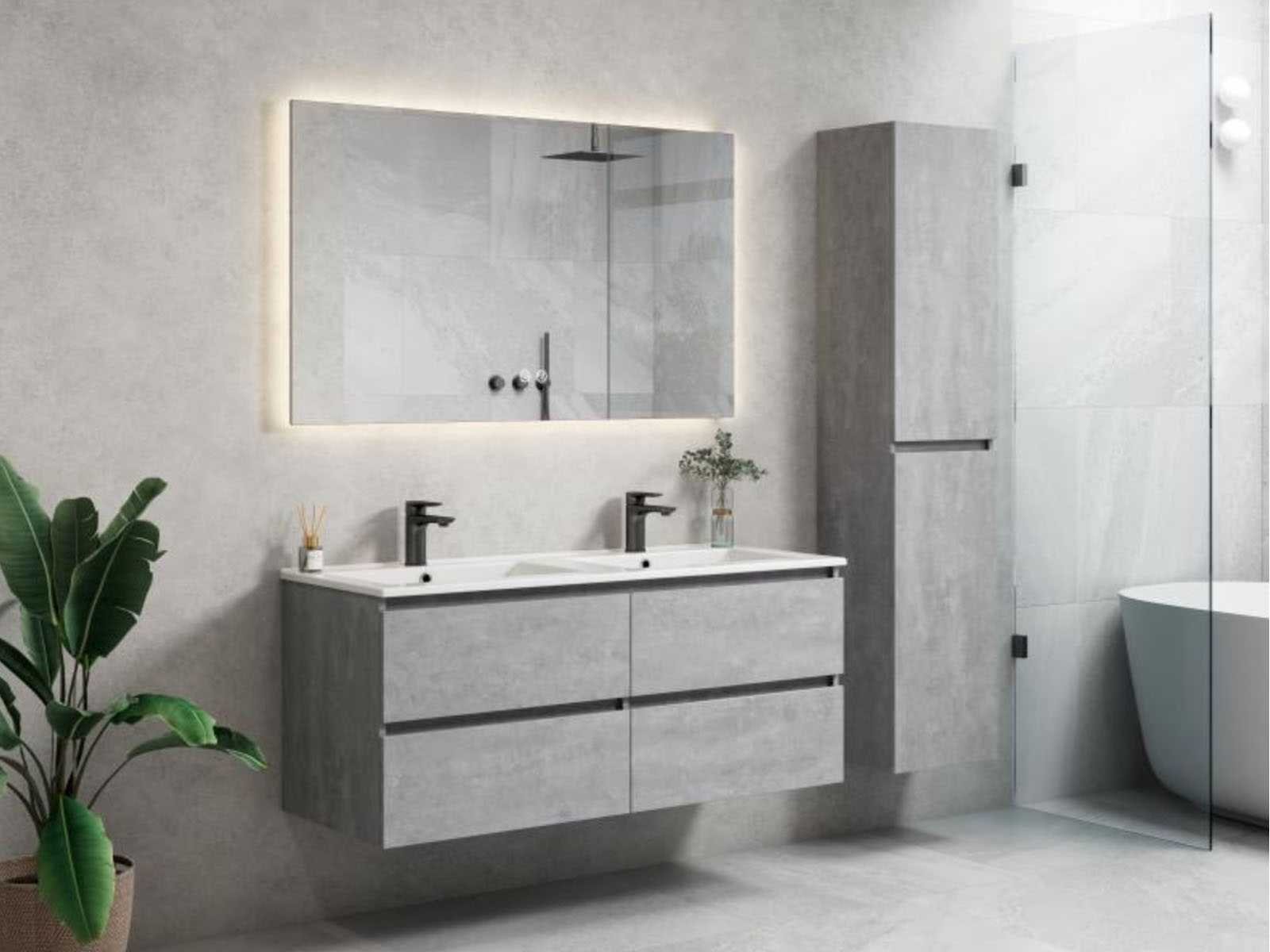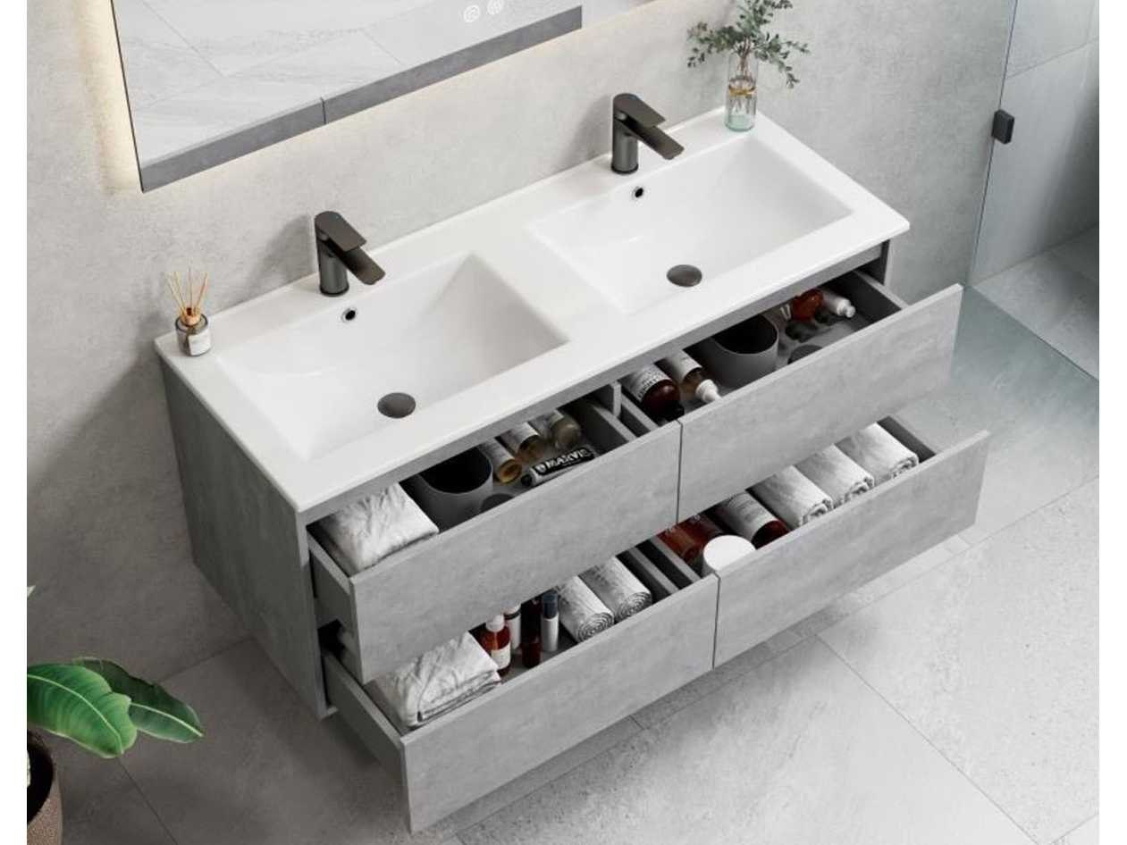De onderbouwkast van het badkamermeubel bevat 4 laden en is uitgevoerd met een soft close systeem - Kraan, krepin, sifon en kolomkast niet inbegrepen Nee Merk: Lavinno Model: Roma 120-05 Hoogte: 50cm Lengte: 120cm Breedte: 46cm Materiaal: Melamine Kleur: Beton Grijs Wastafel: Mineraalmarmer Spiegel met verlichting: 120x70cm Softclose: true