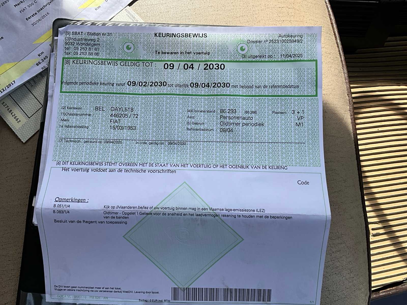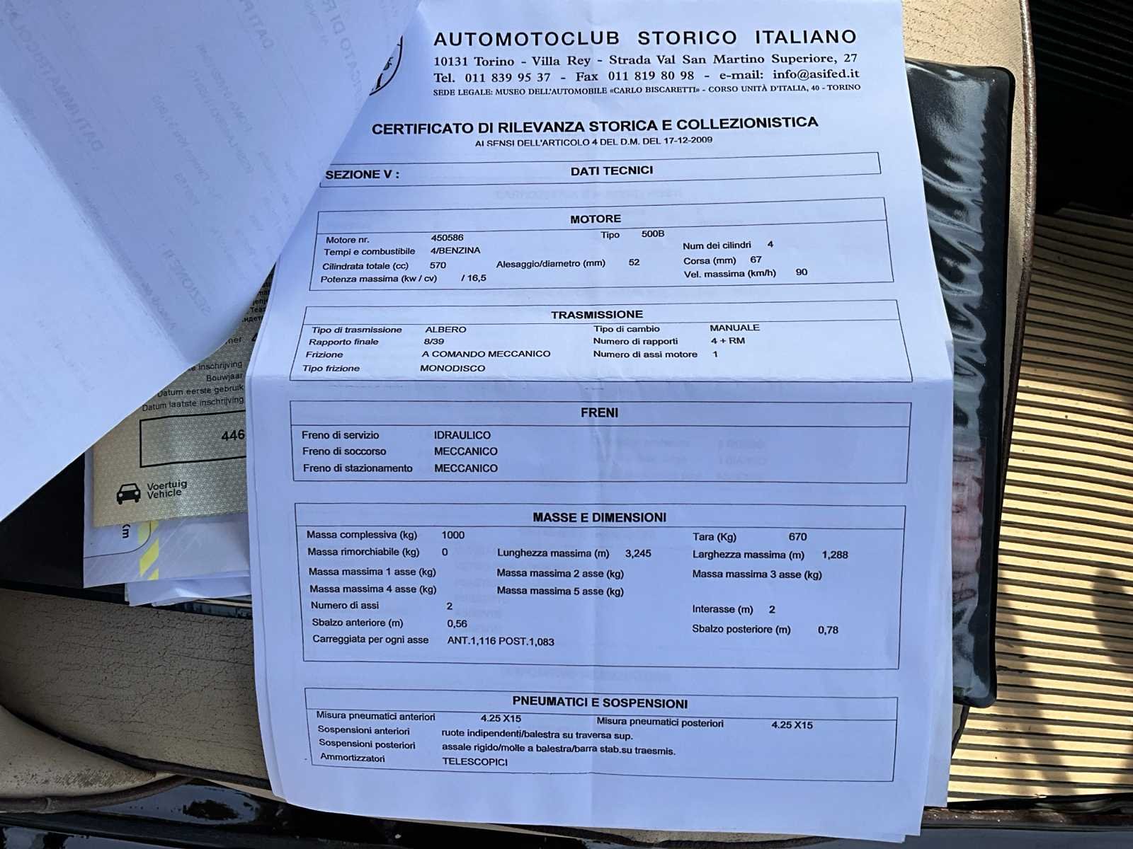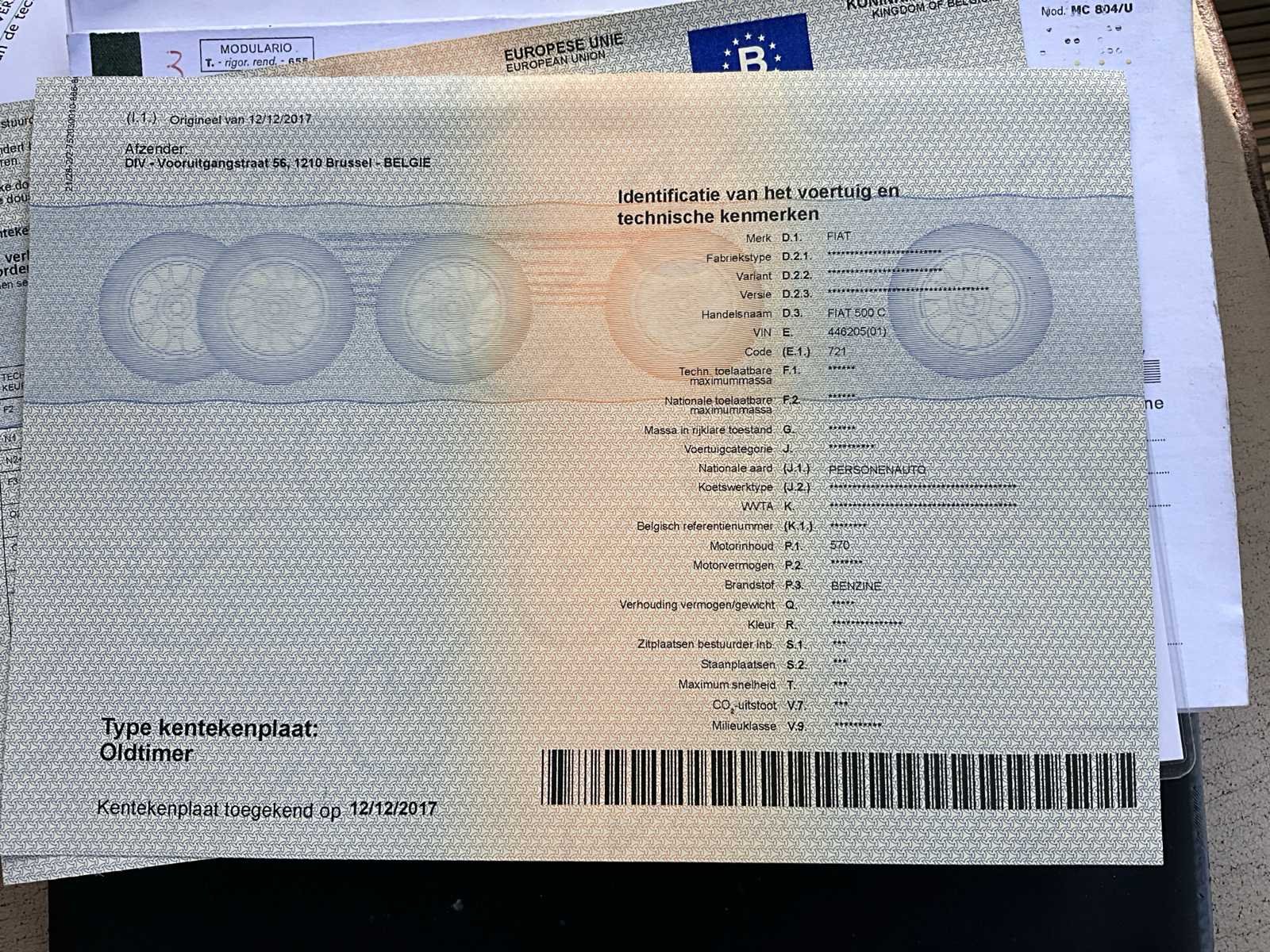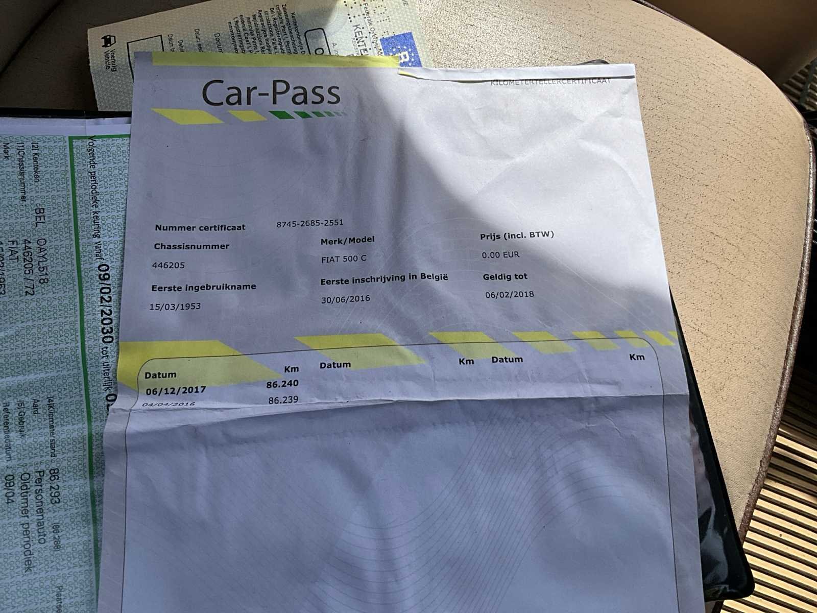 Opberghoes aanwezig. No Merk: Fiat Type: 500C Bouwjaar: 1953 Chassisnummer: 446205 Brandstof: Benzine Datum eerste toelating: 15/03/1953 Nationaliteit documenten: België Aantal sleutels: 2