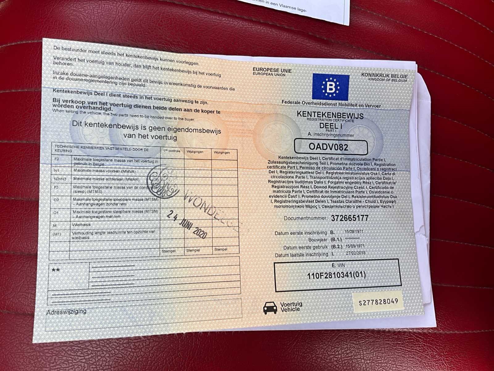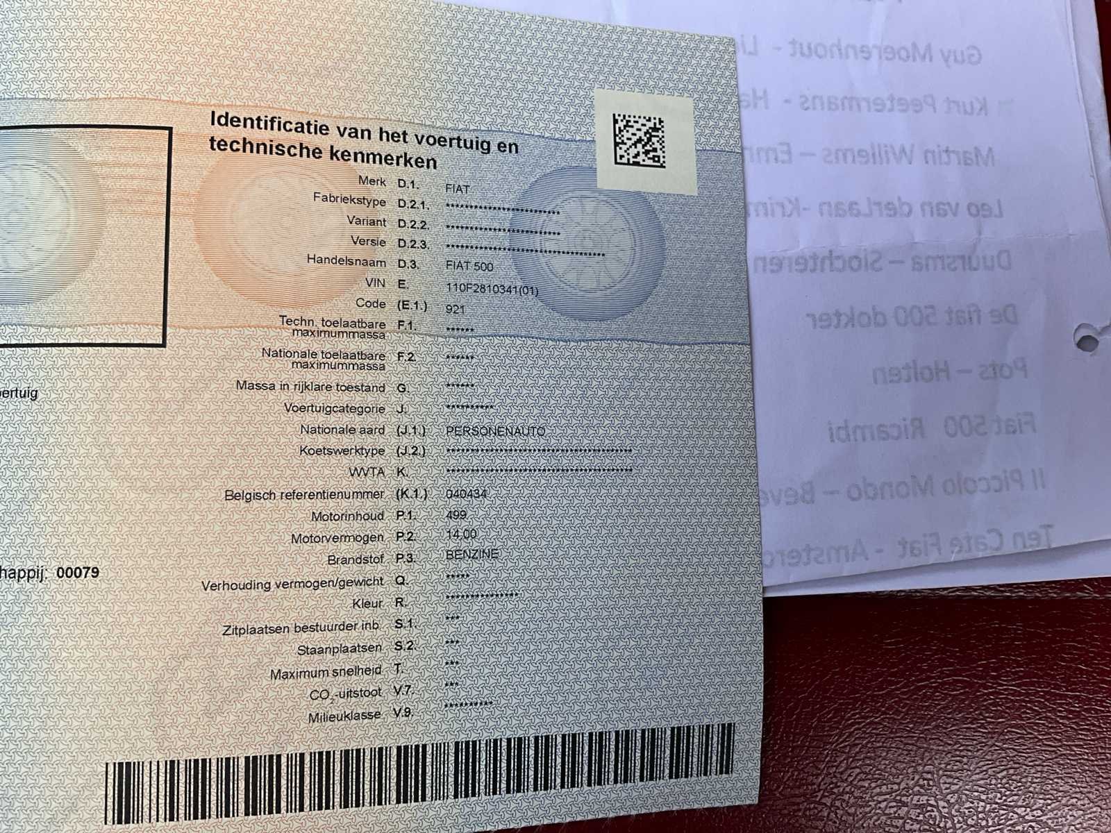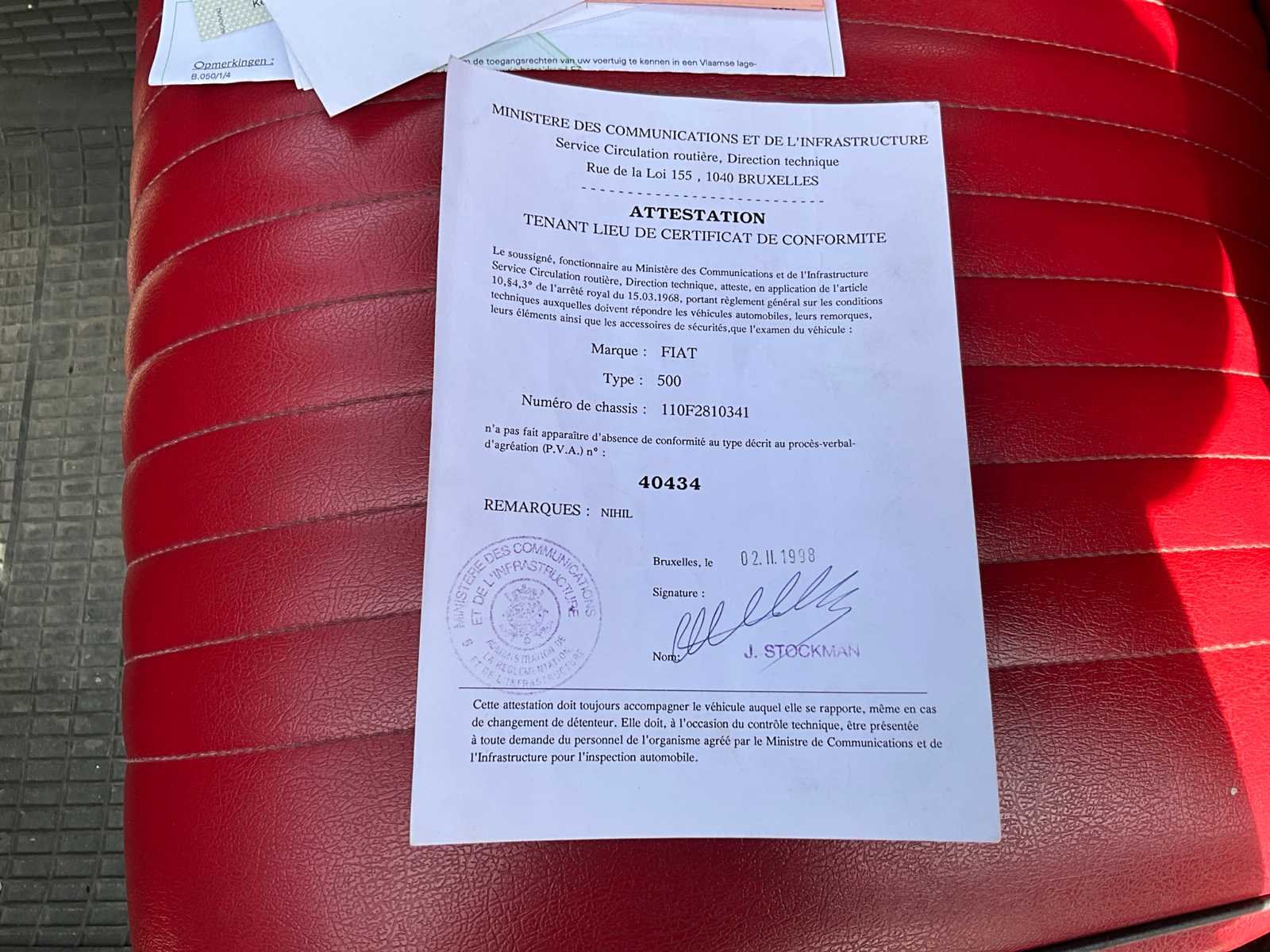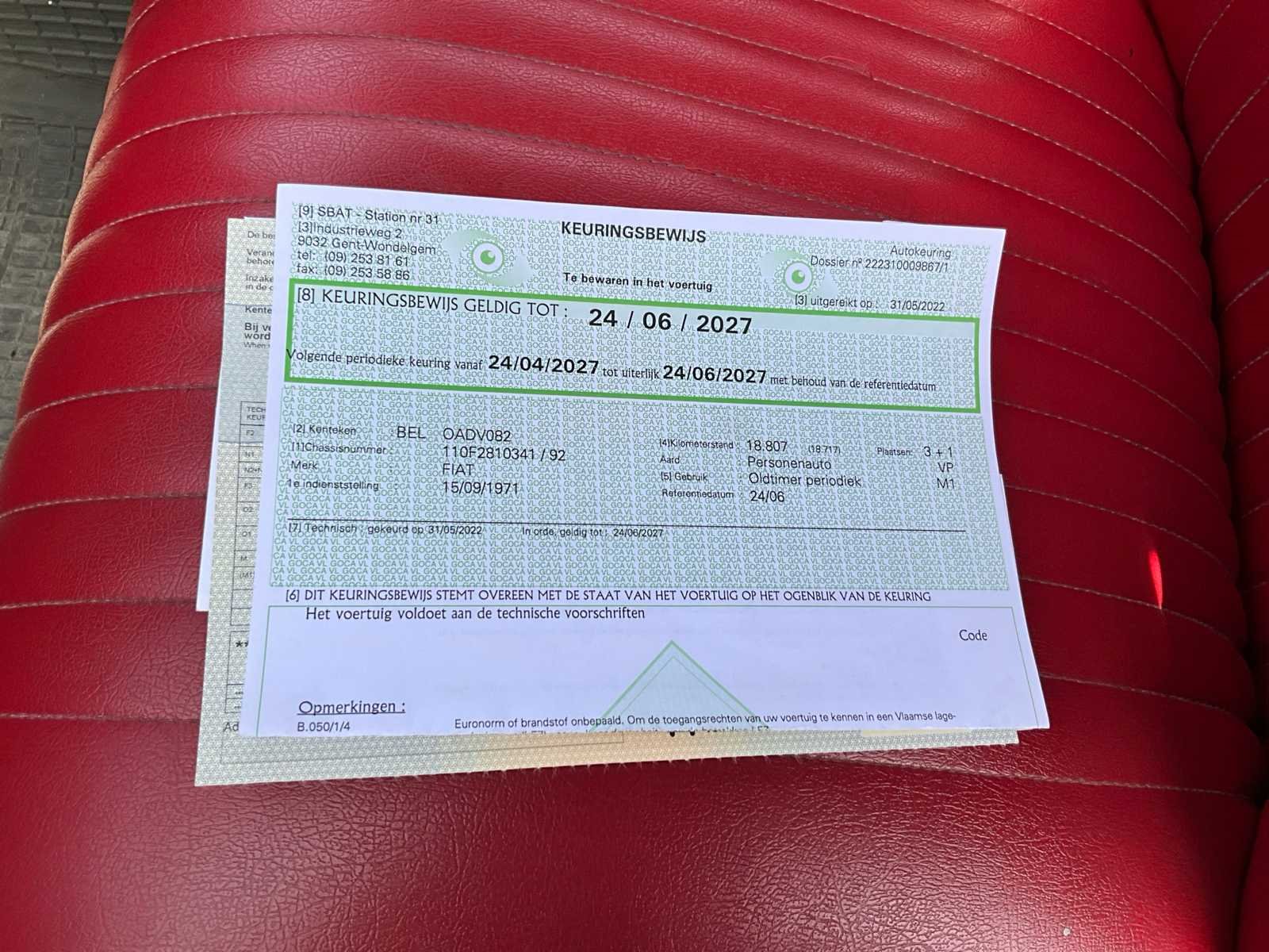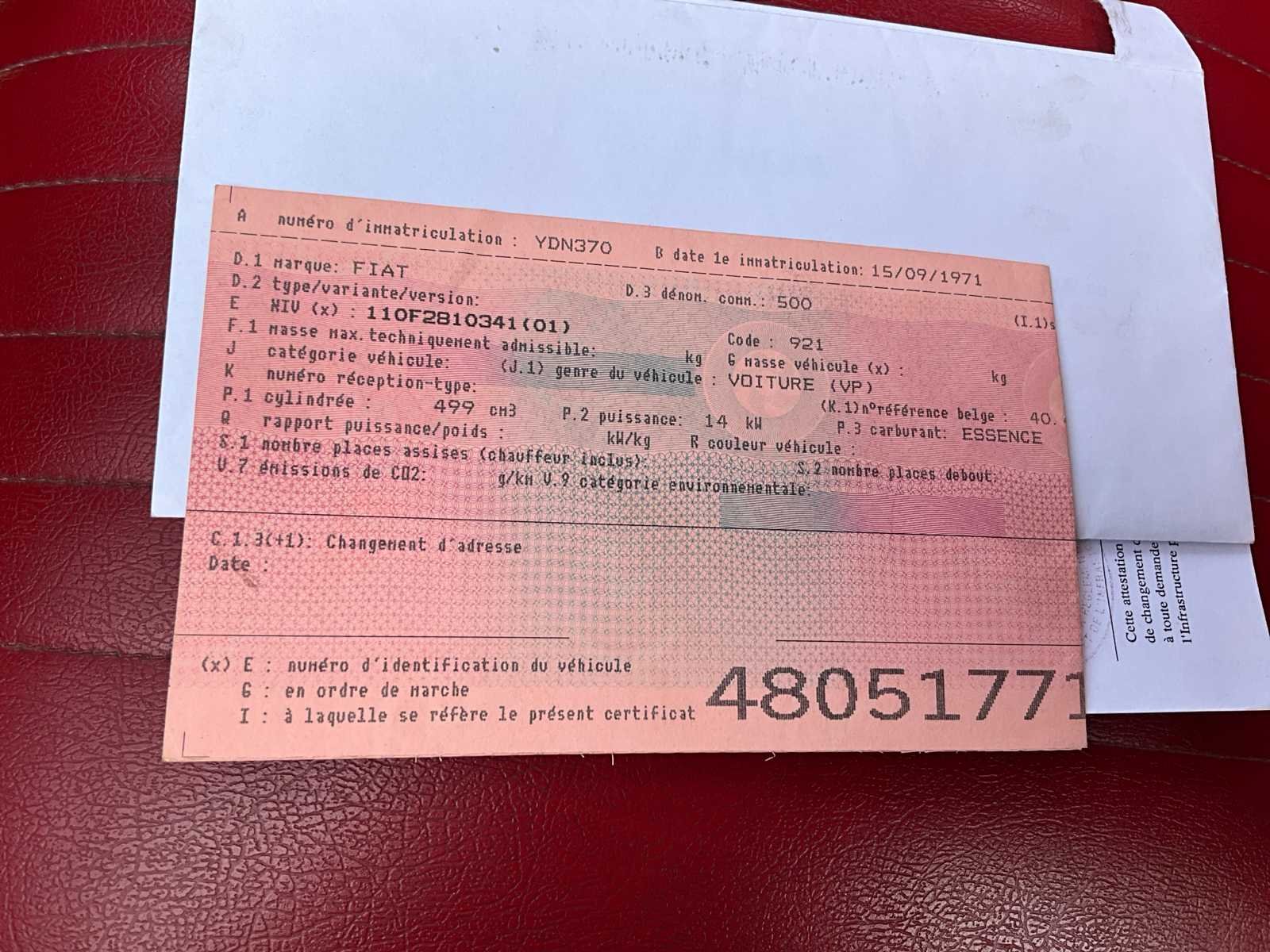 Nee Merk: Fiat Type: 500 Bouwjaar: 1971 Chassisnummer: 110F2810341 Afgelezen kilometerstand: 18853 Brandstof: Benzine Datum eerste toelating: 15/09/1971 Nationaliteit documenten: België Vermogen (kW): 14kW Cilinderinhoud: 499